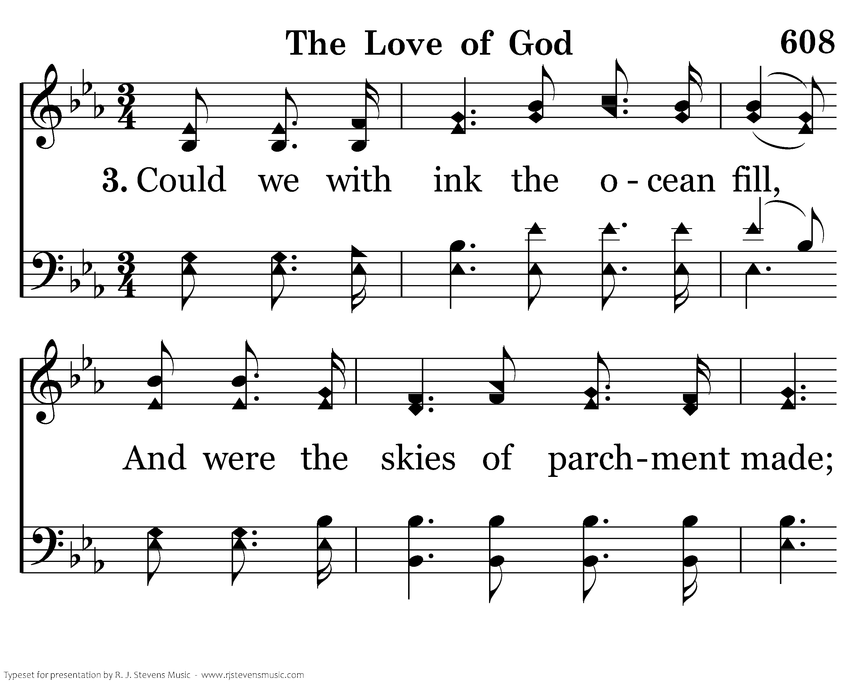 Could we with ink the ocean fill, And were the skies of parchment made; Were ev'ry stalk on earth a quill, And ev'ry man a scribe by trade; To write the love of God above Would drain the ocean dry; Nor could the scroll contain the whole, Tho' stretch'd from sky to sky.