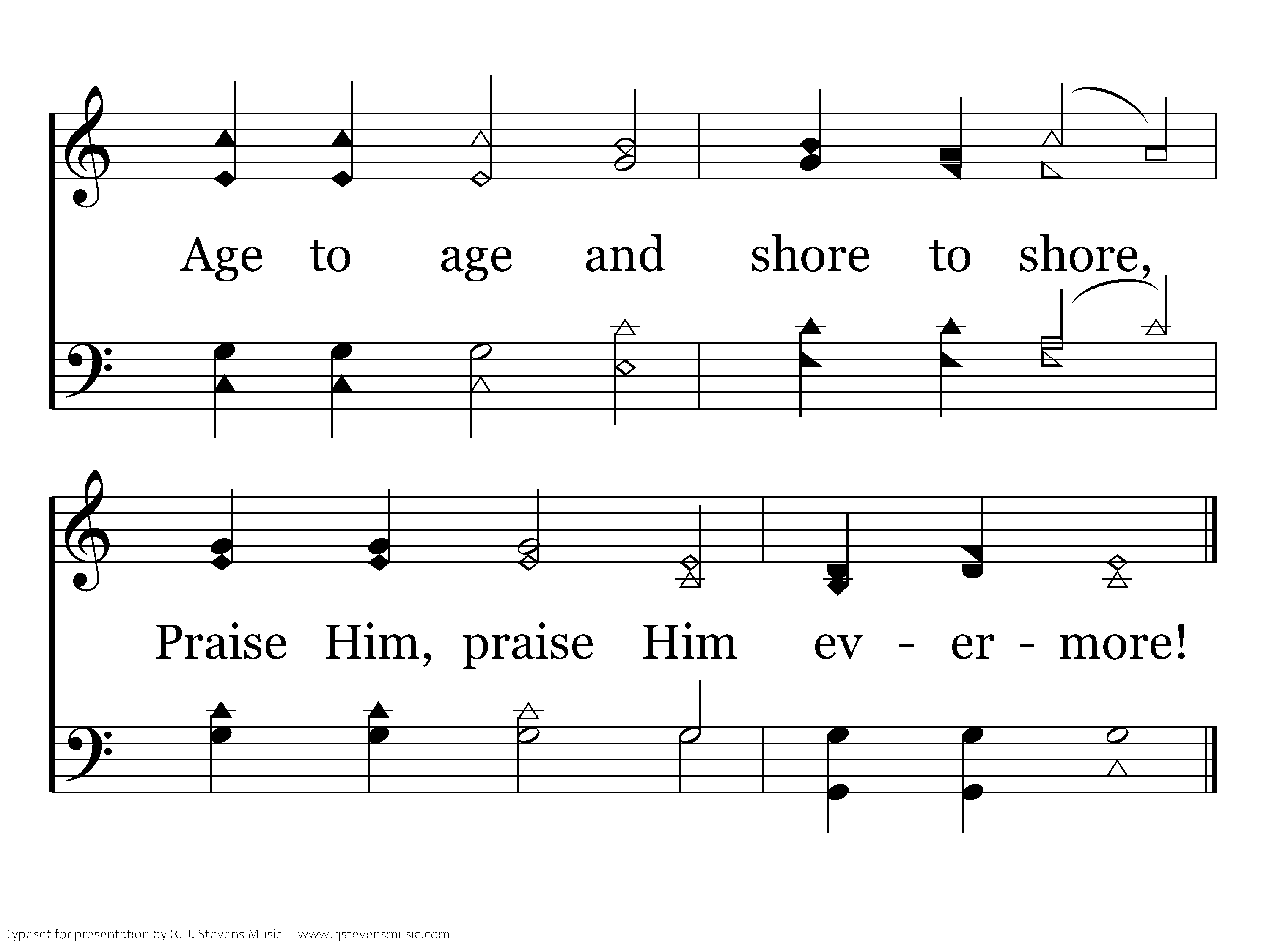 Earth to heav'n and heav'n to earth, Tell His wonders, sing His worth, Age to age and shore to shore, Praise Him, praise Him evermore!