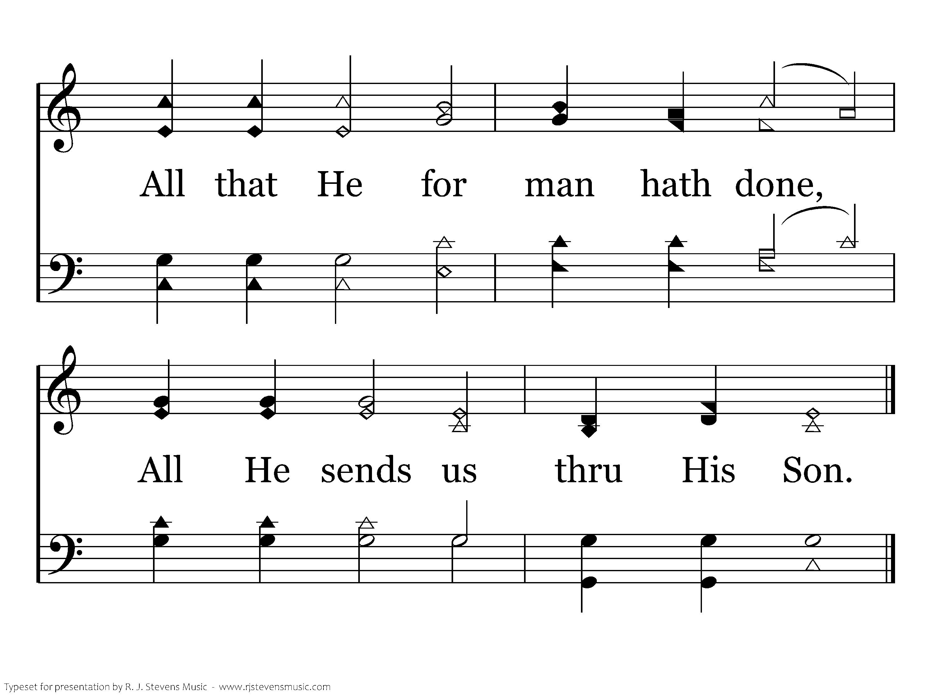 Praise the Lord, His mercies trace, Praise His providence and grace, All that He for man hath done, All He sends us thru His Son.