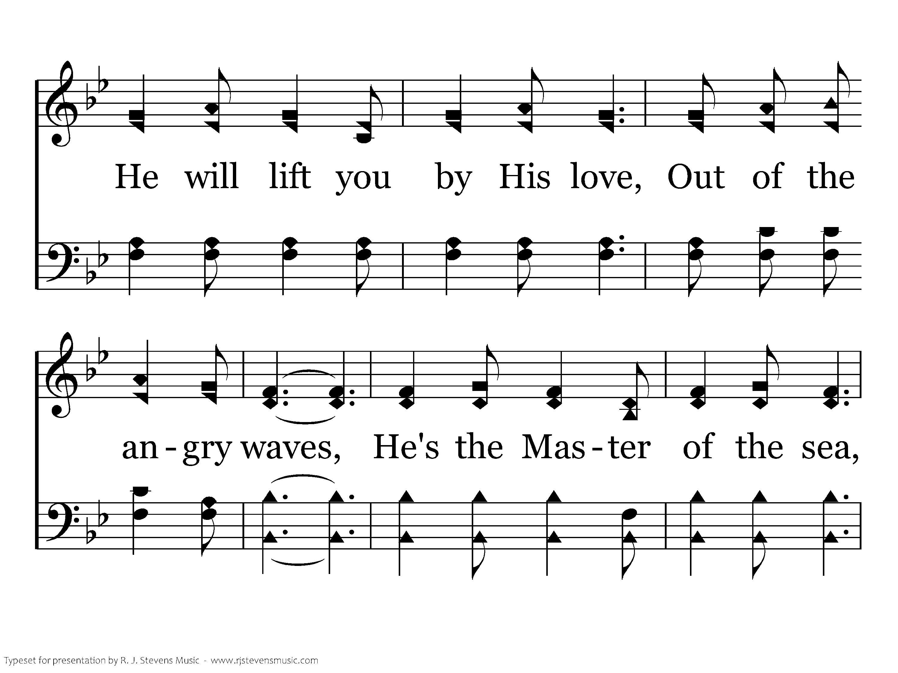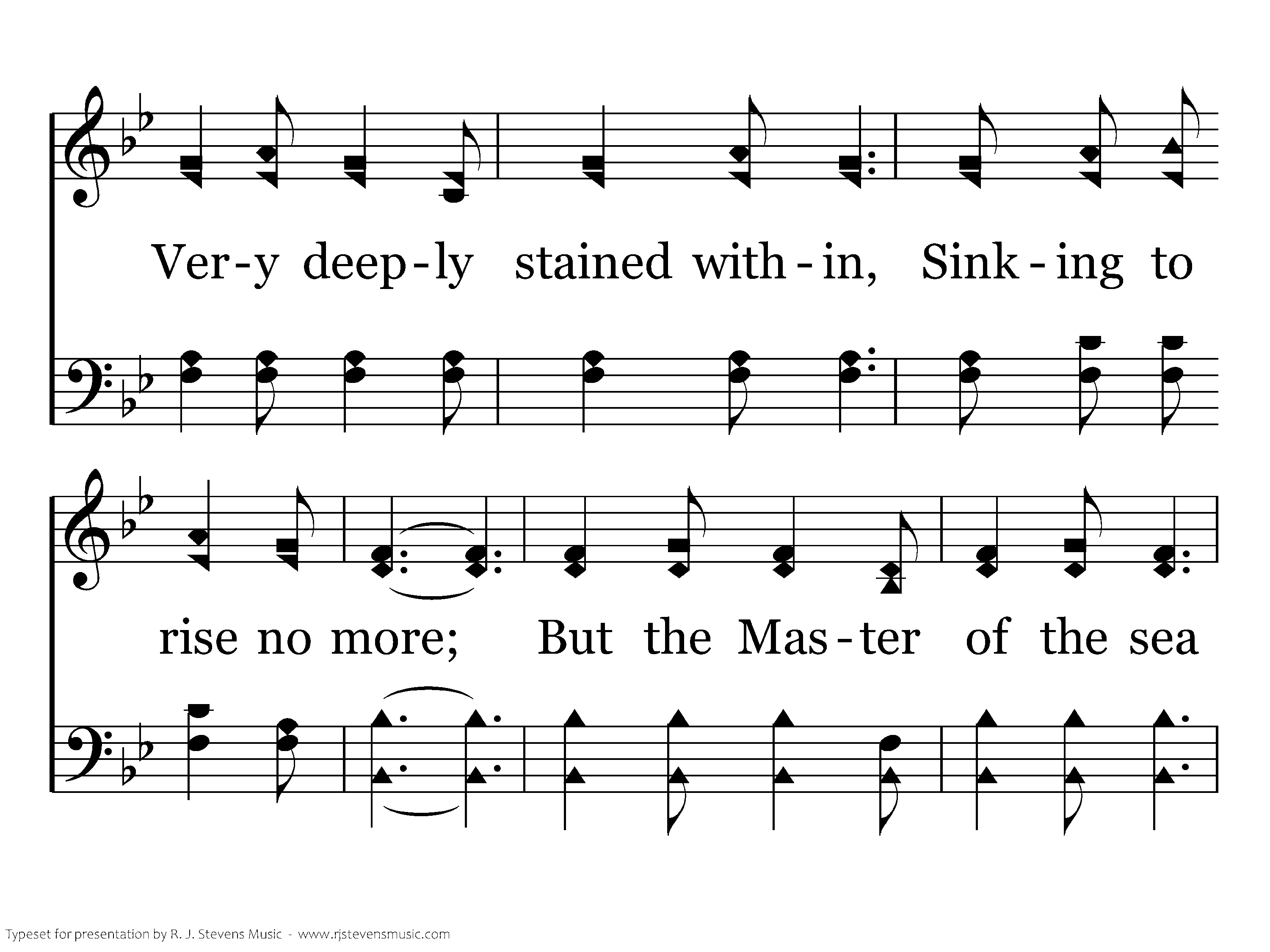 I was sinking deep in sin, Far from the peaceful shore, Very deeply stained within, Sinking to rise no more; But the Master of the sea Heard my despairing cry, From the waters lifted me, Now safe am I.