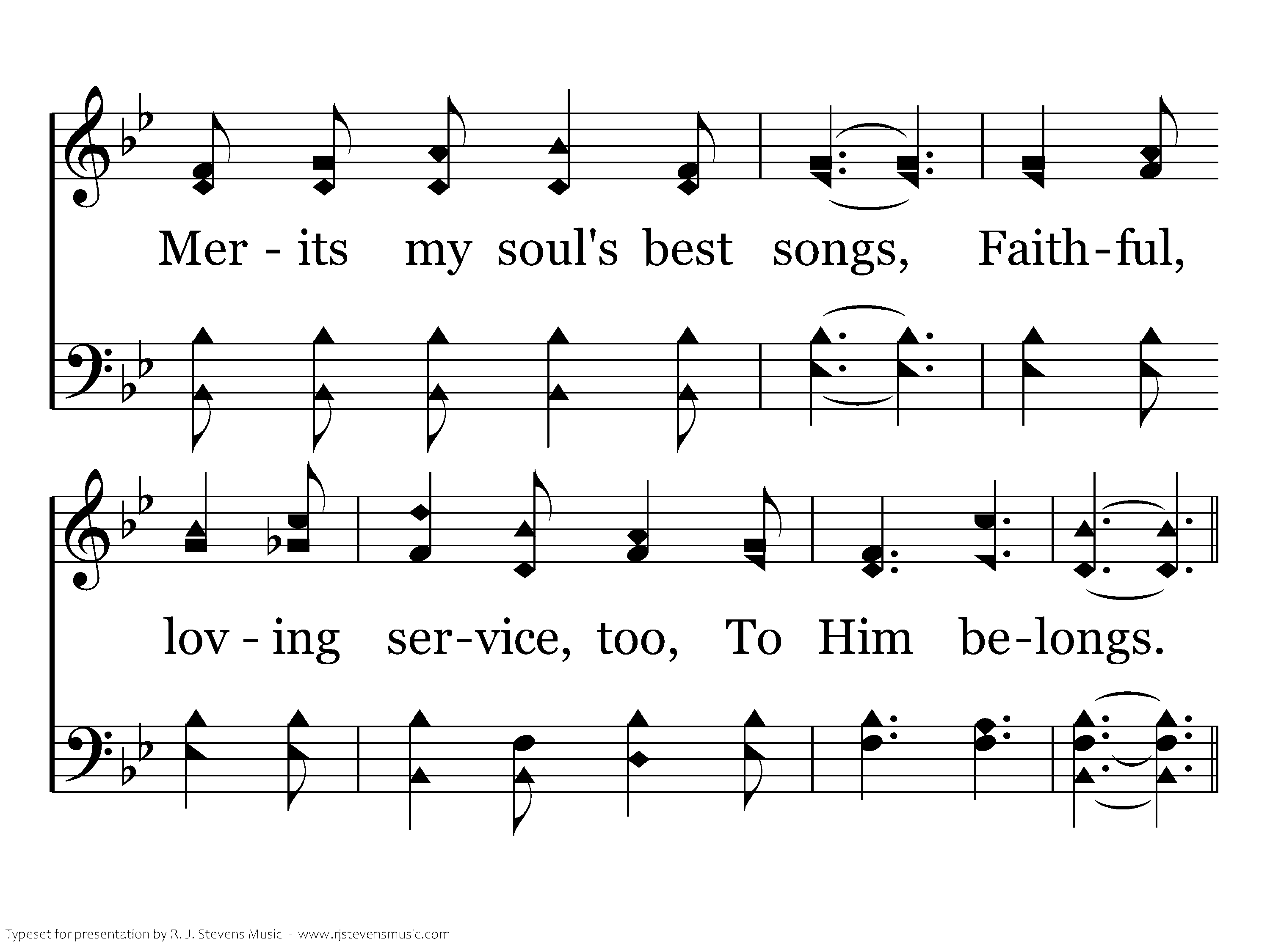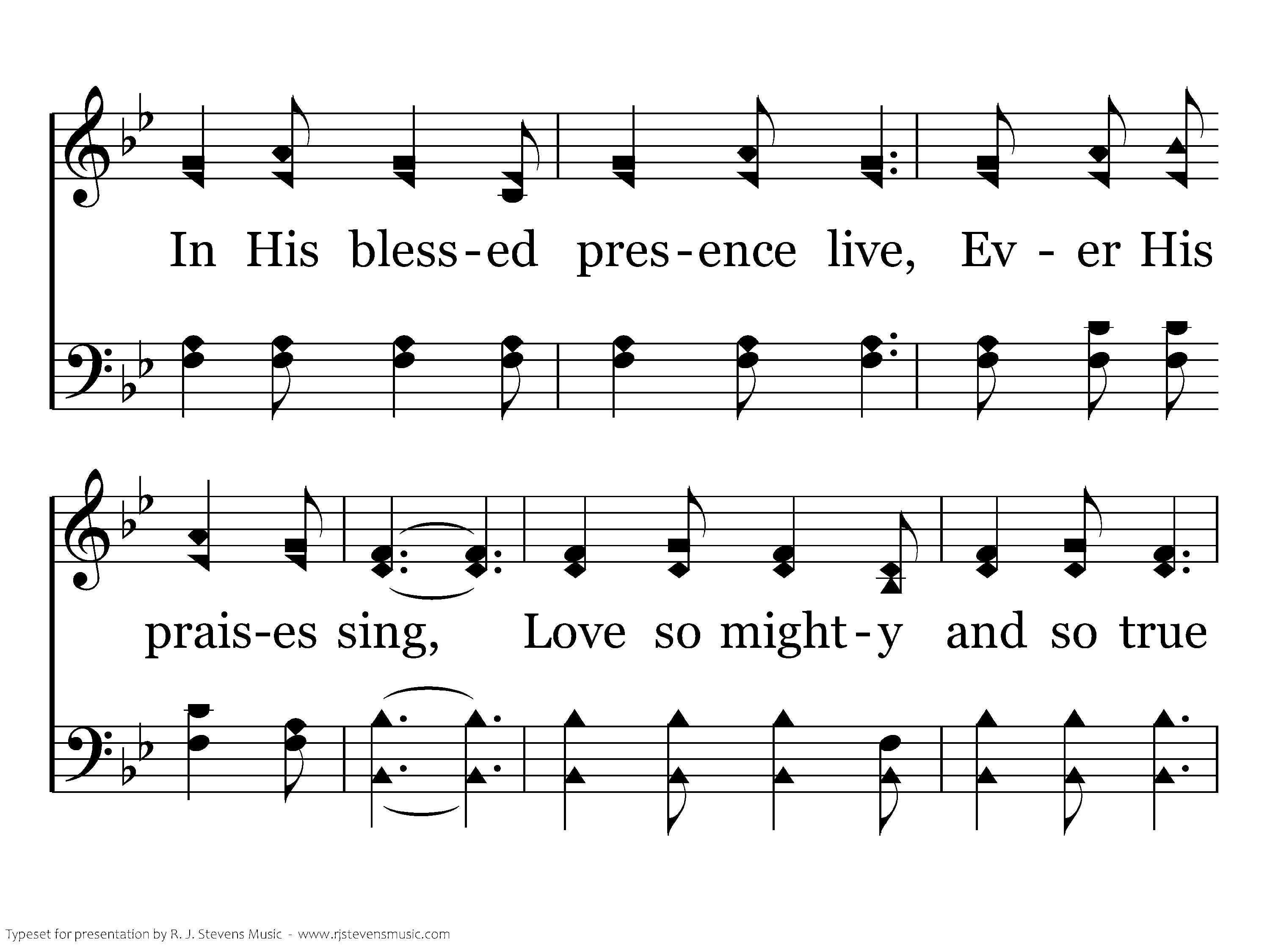 All my heart to Him I give, Ever to Him I cling, In His blessed presence live, Ever His praises sing; Love so mighty and so true Merits my soul's best songs, Faithful, loving service, too, To Him belongs.