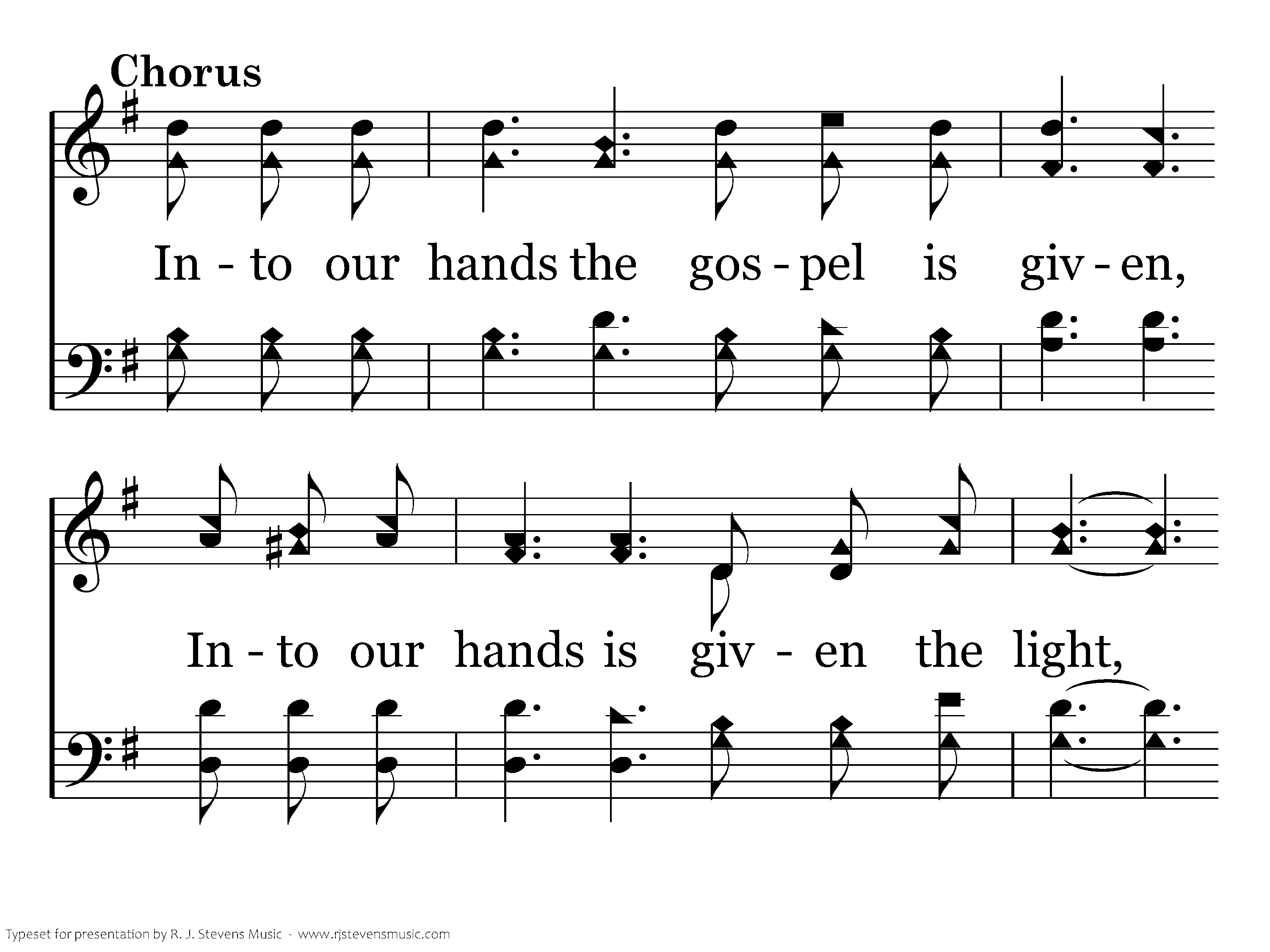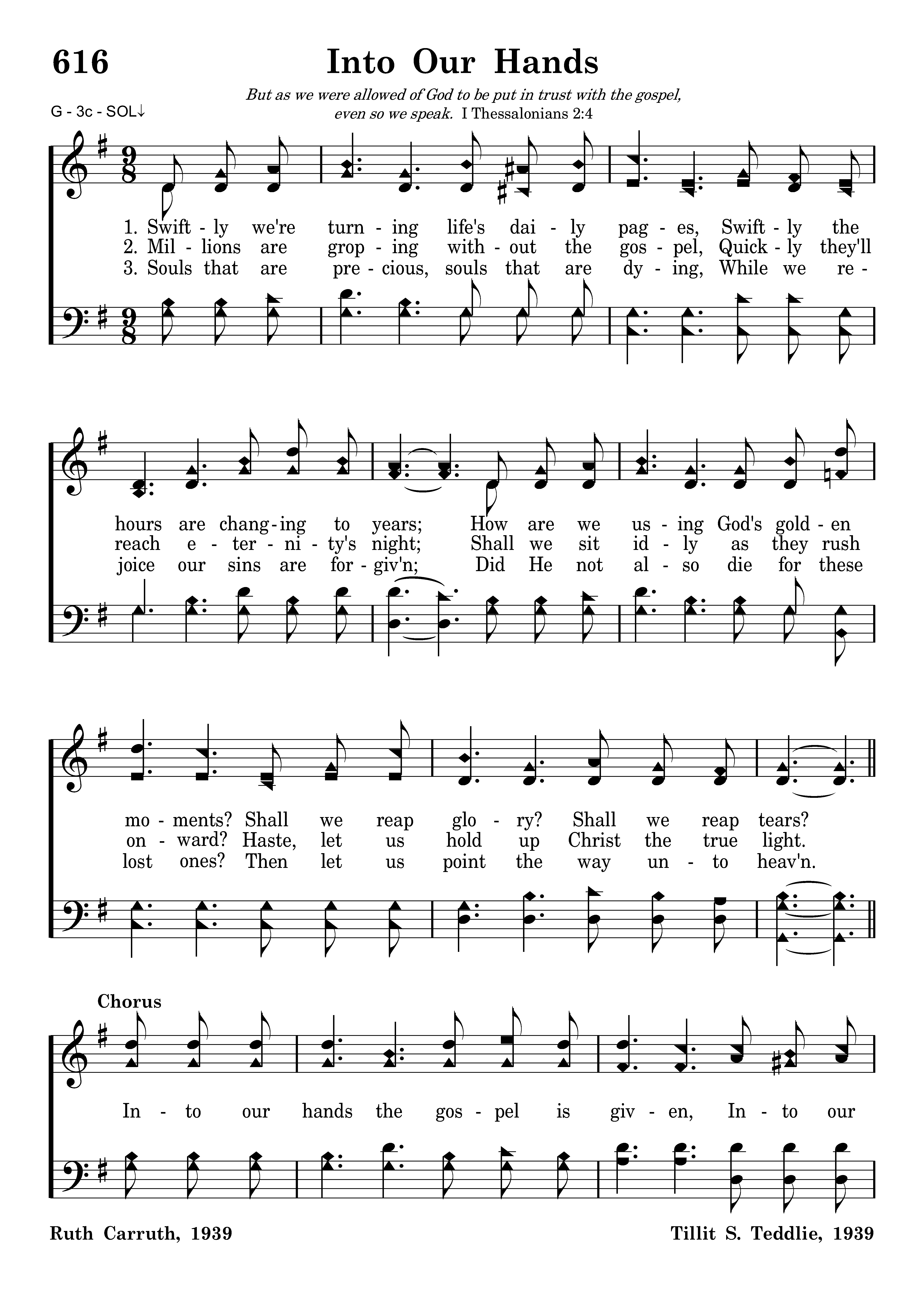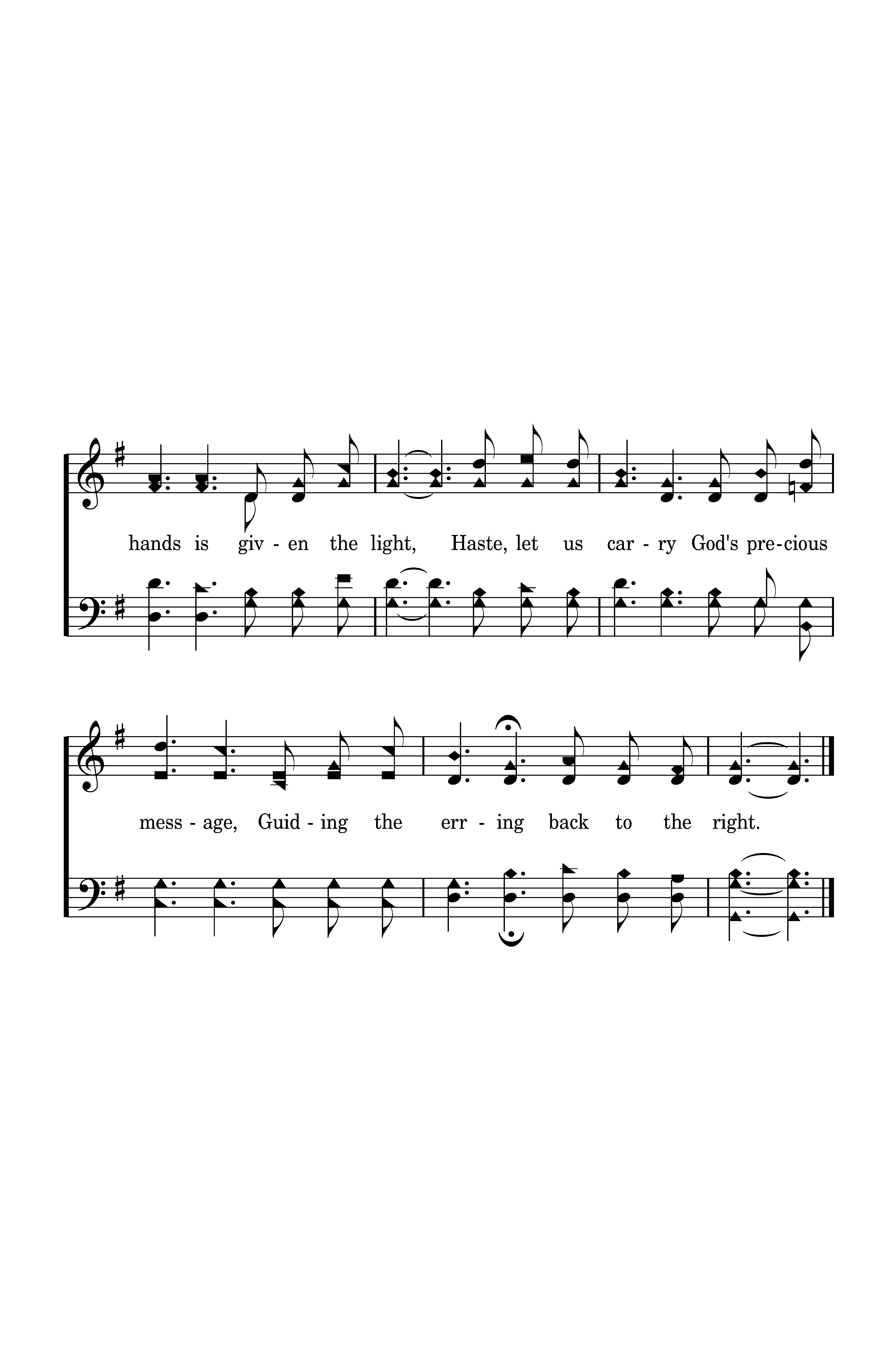 Into our hands the gospel is given, Into our hands is given the light, Haste, let us carry God's precious message, Guiding the erring back to the right.