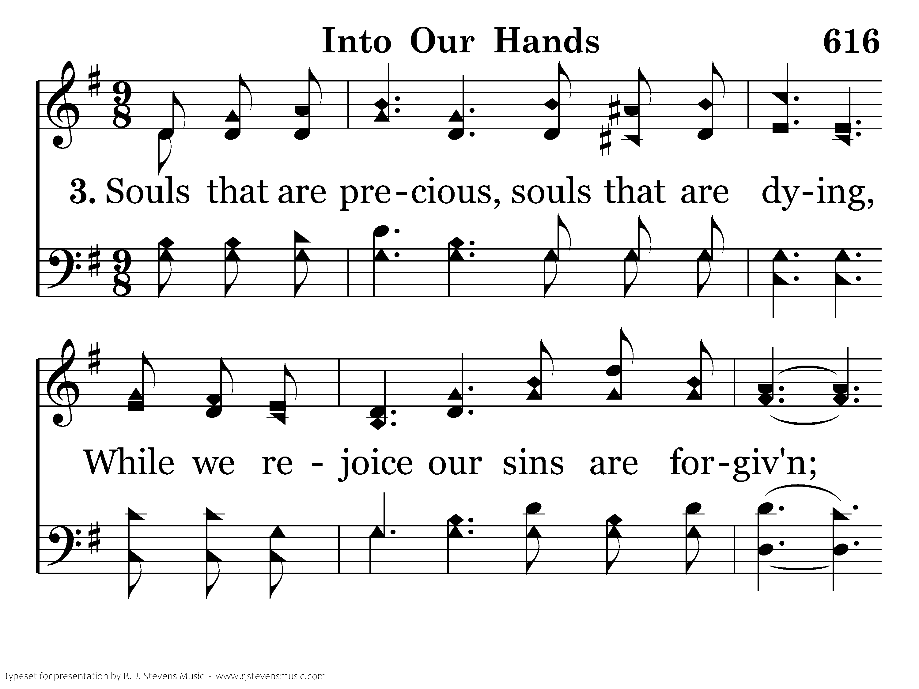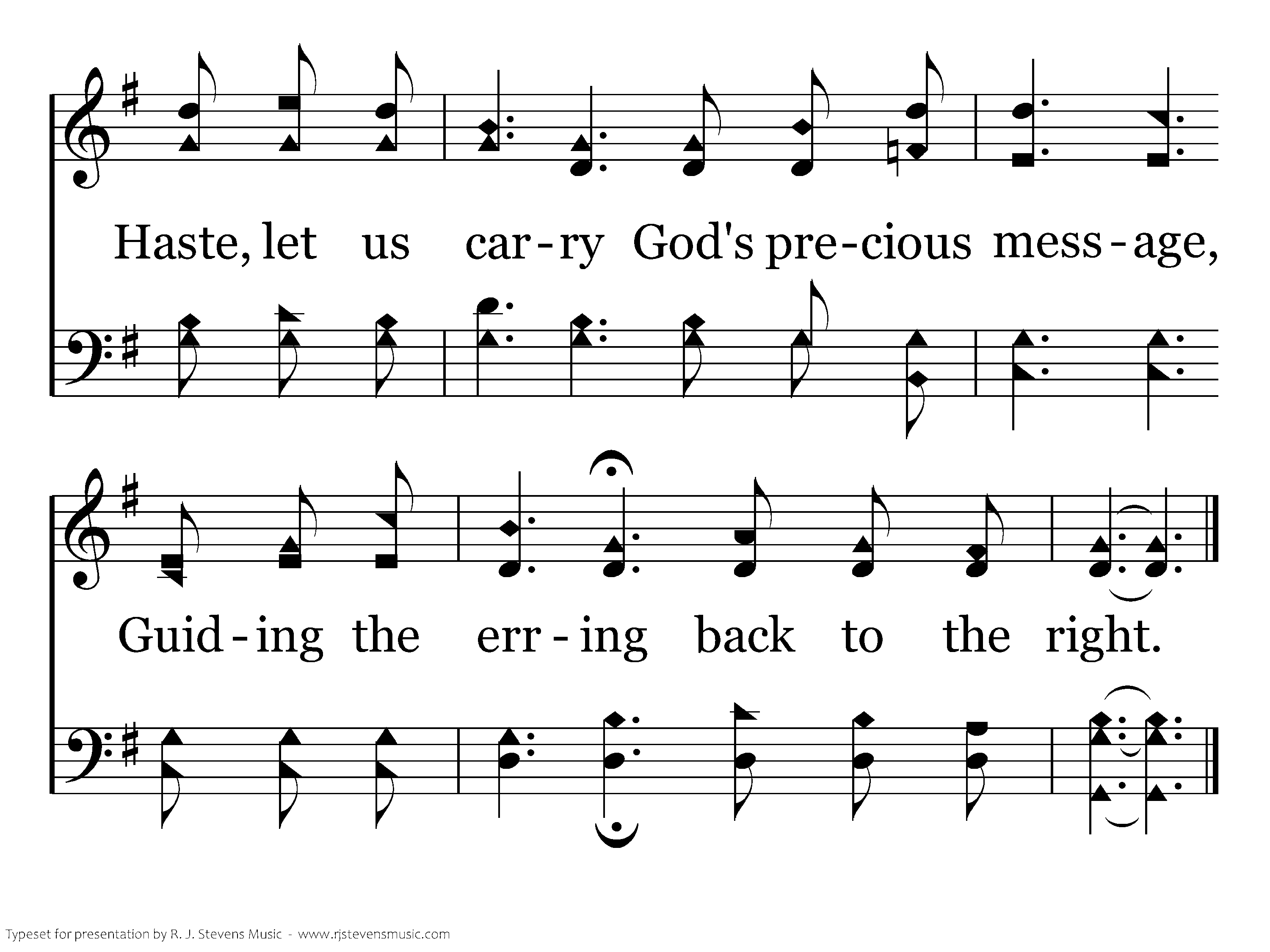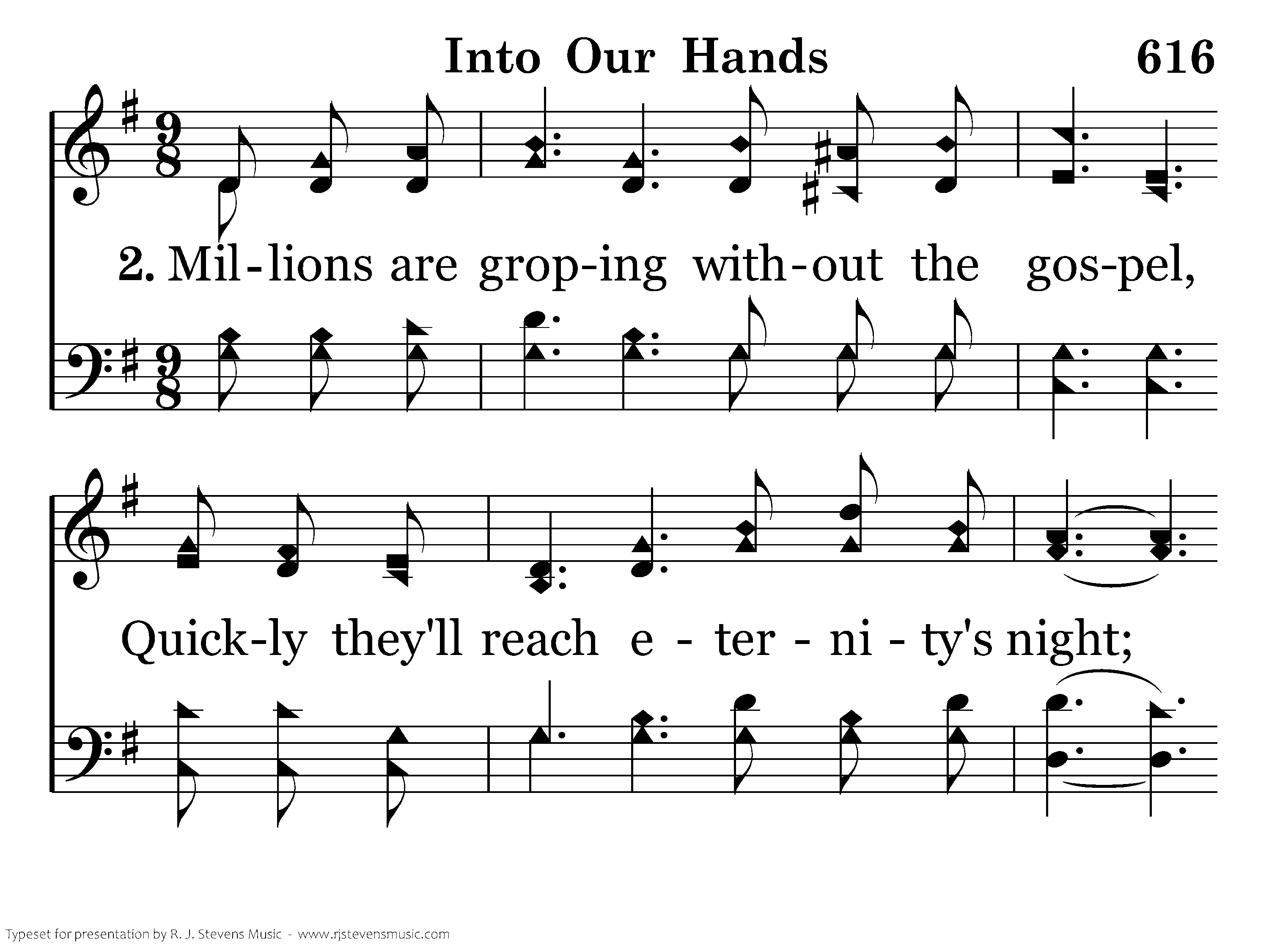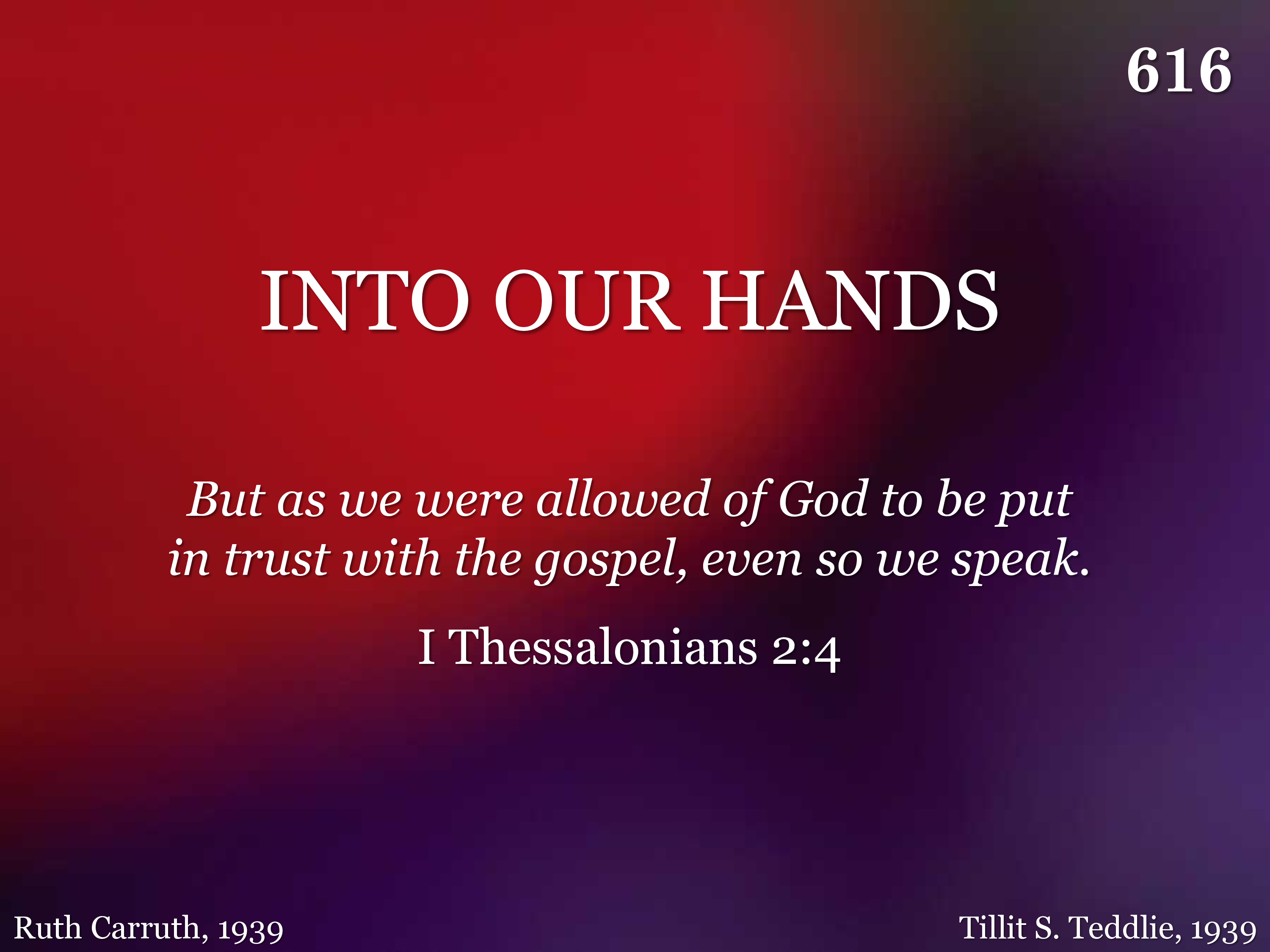 Into our hands the gospel is given, Into our hands is given the light, Haste, let us carry God's precious message, Guiding the erring back to the right.