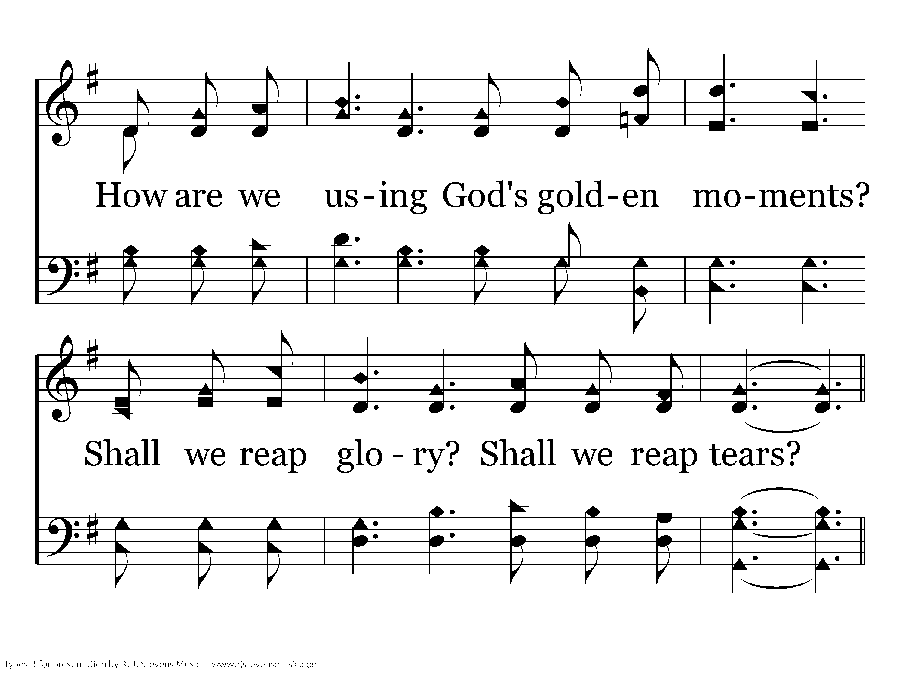 Swiftly we're turning life's daily pages, Swiftly the hours are changing to years; How are we using God's golden moments? Shall we reap glory? Shall we reap tears?