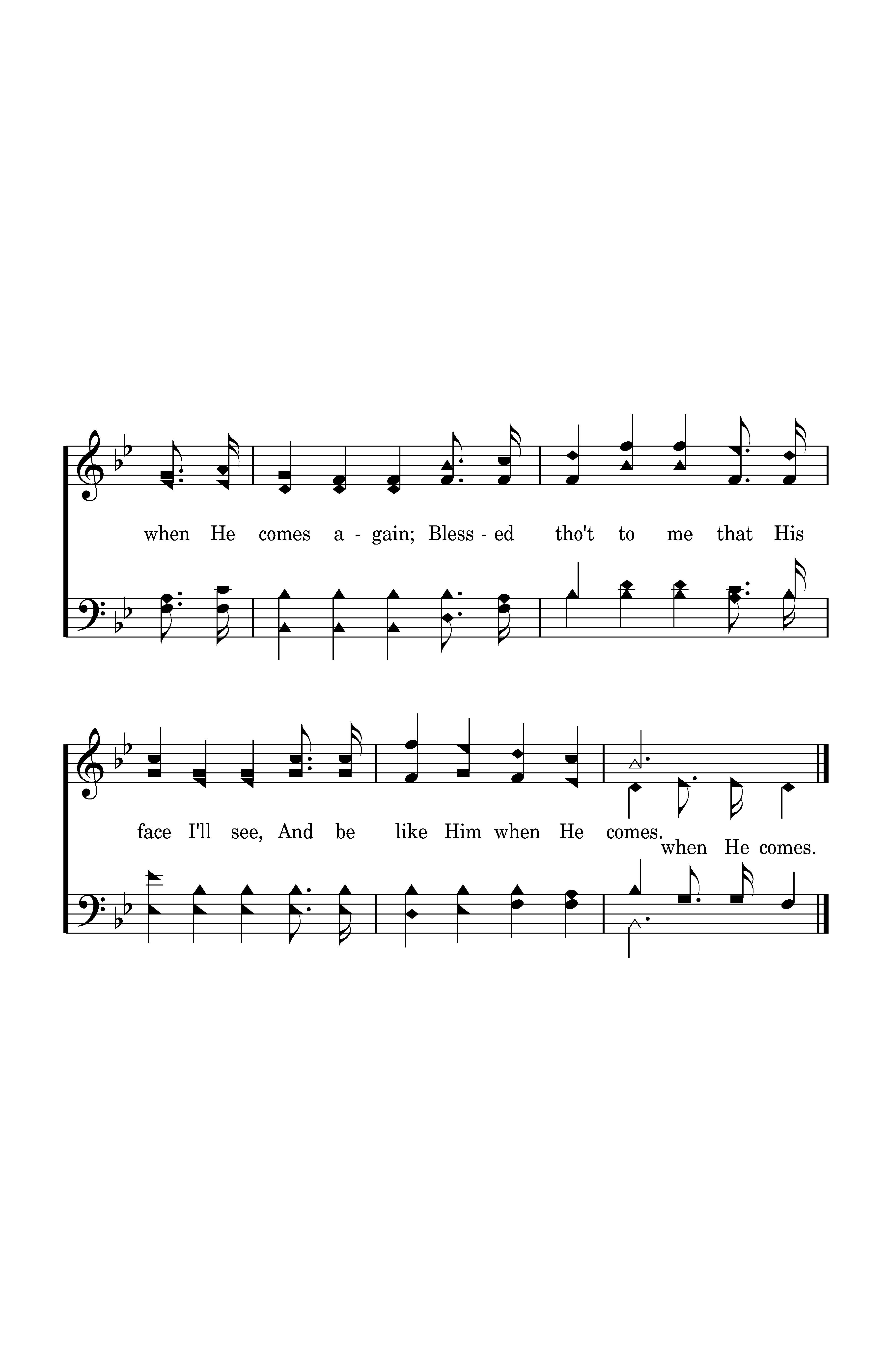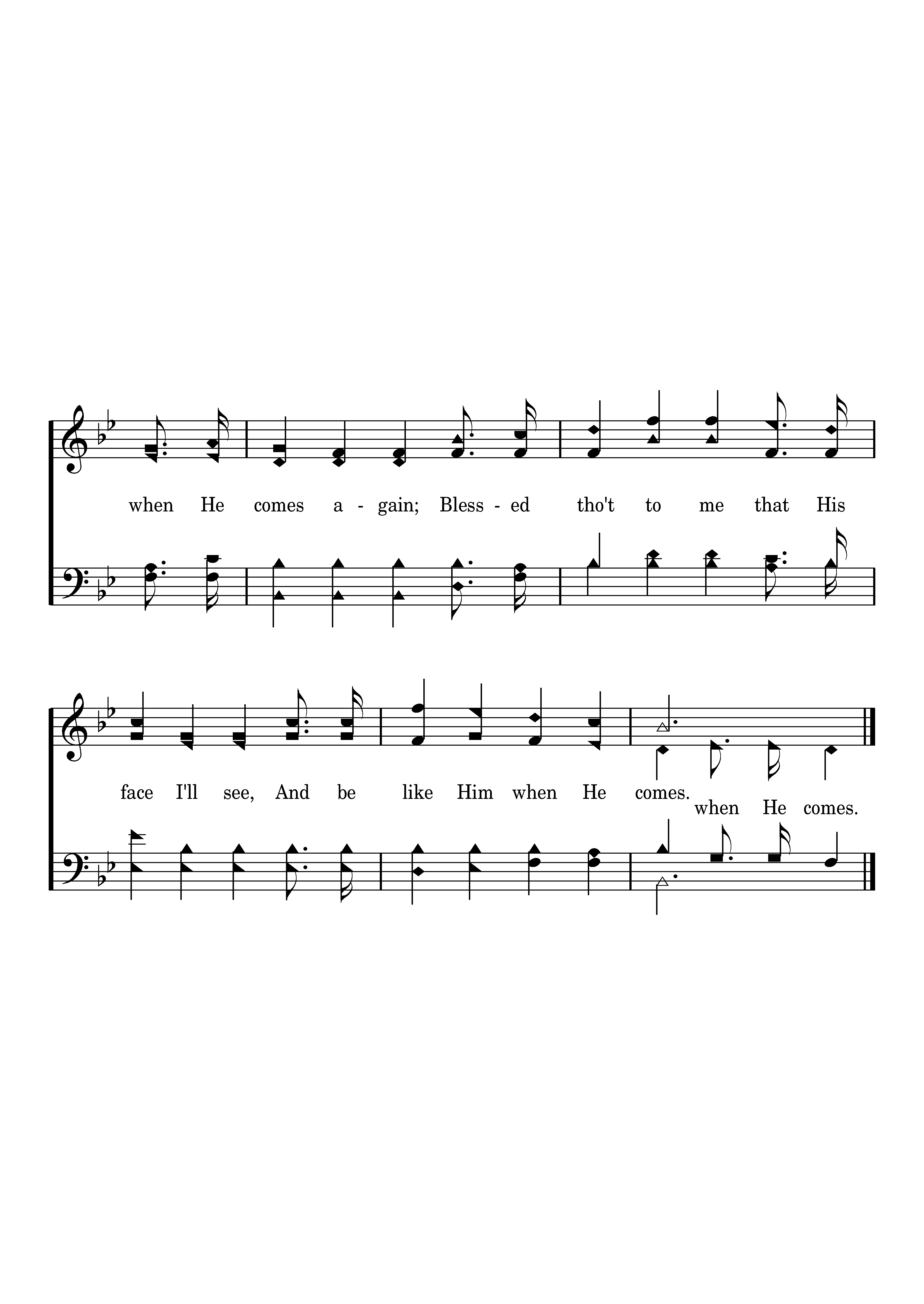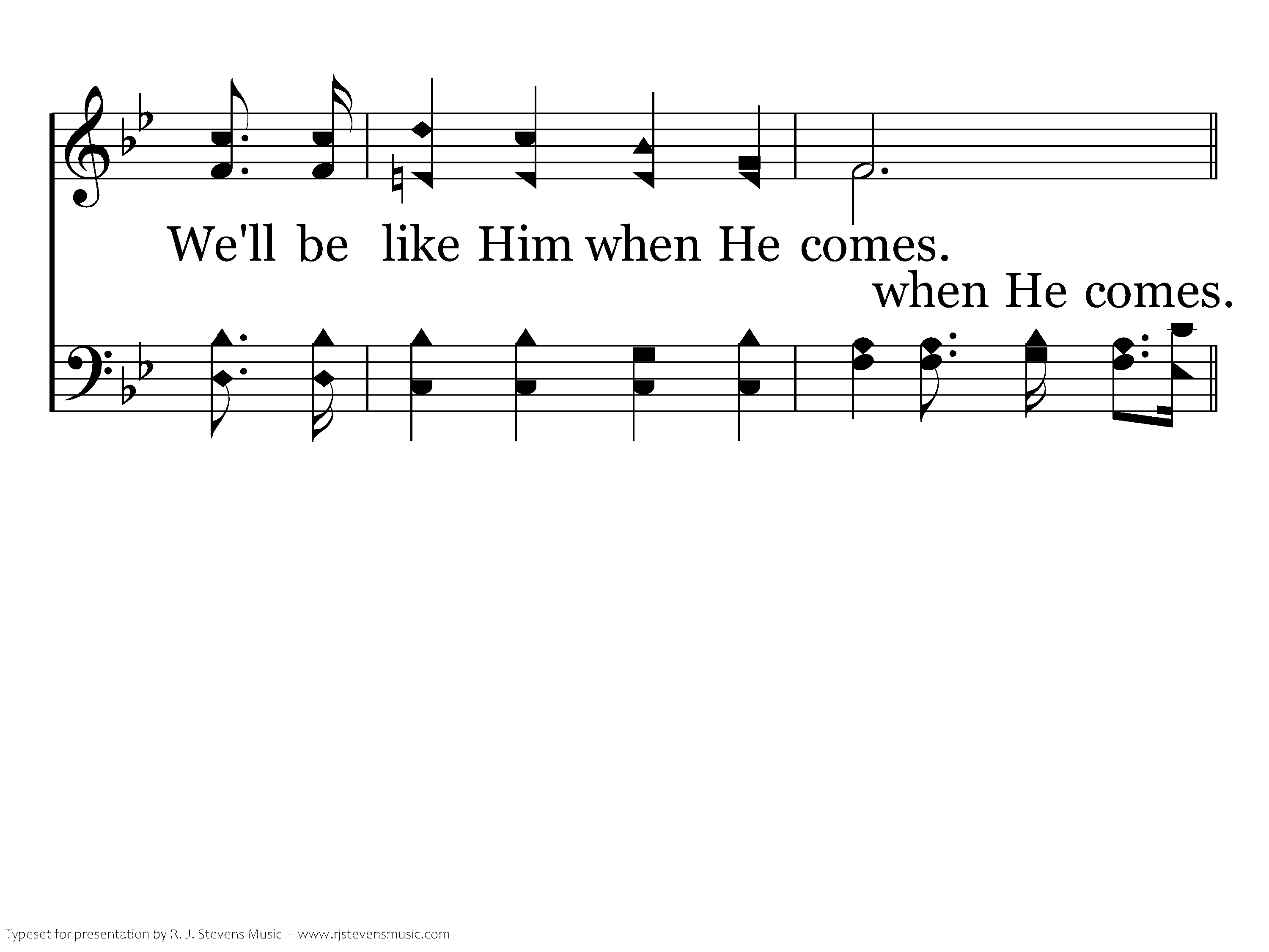 We'll be like Him, sing the glad refrain; We'll be like Him when He comes again, Blessed thought to me that His face I'll see, And be like Him when He comes.