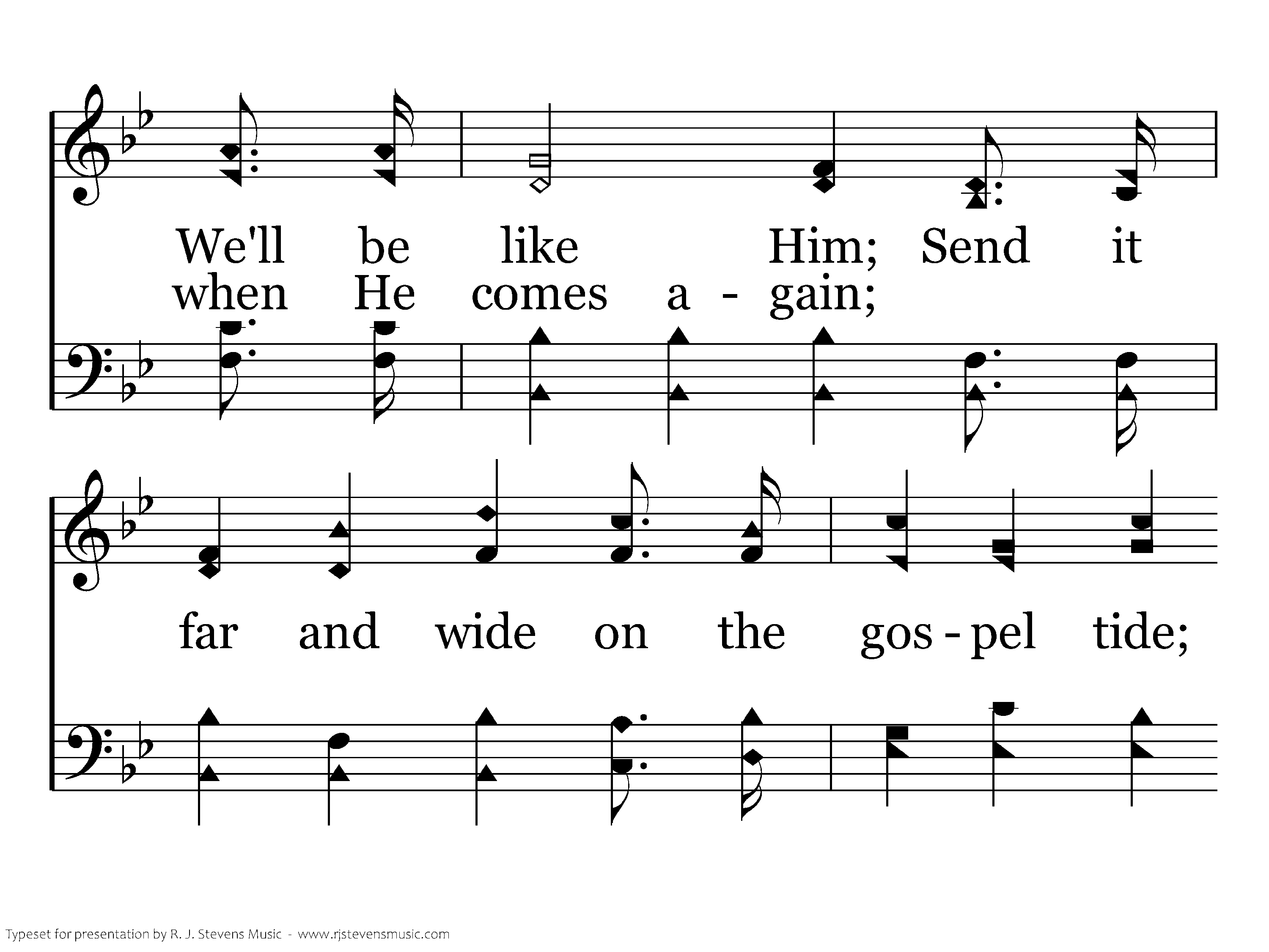 Let the message ring over hill and plain, Send it far and wide on the gospel tide; We'll be like Him when He comes.