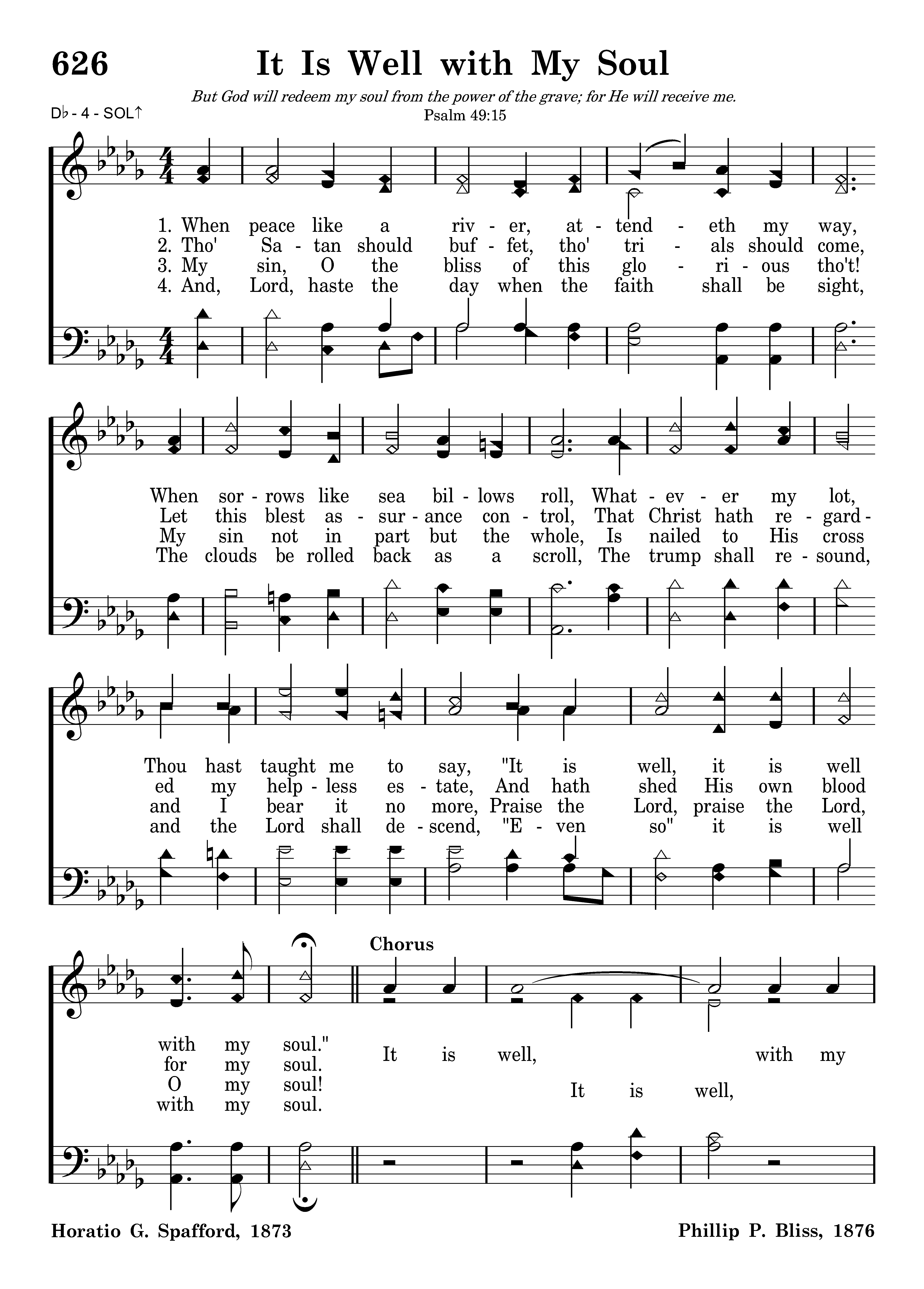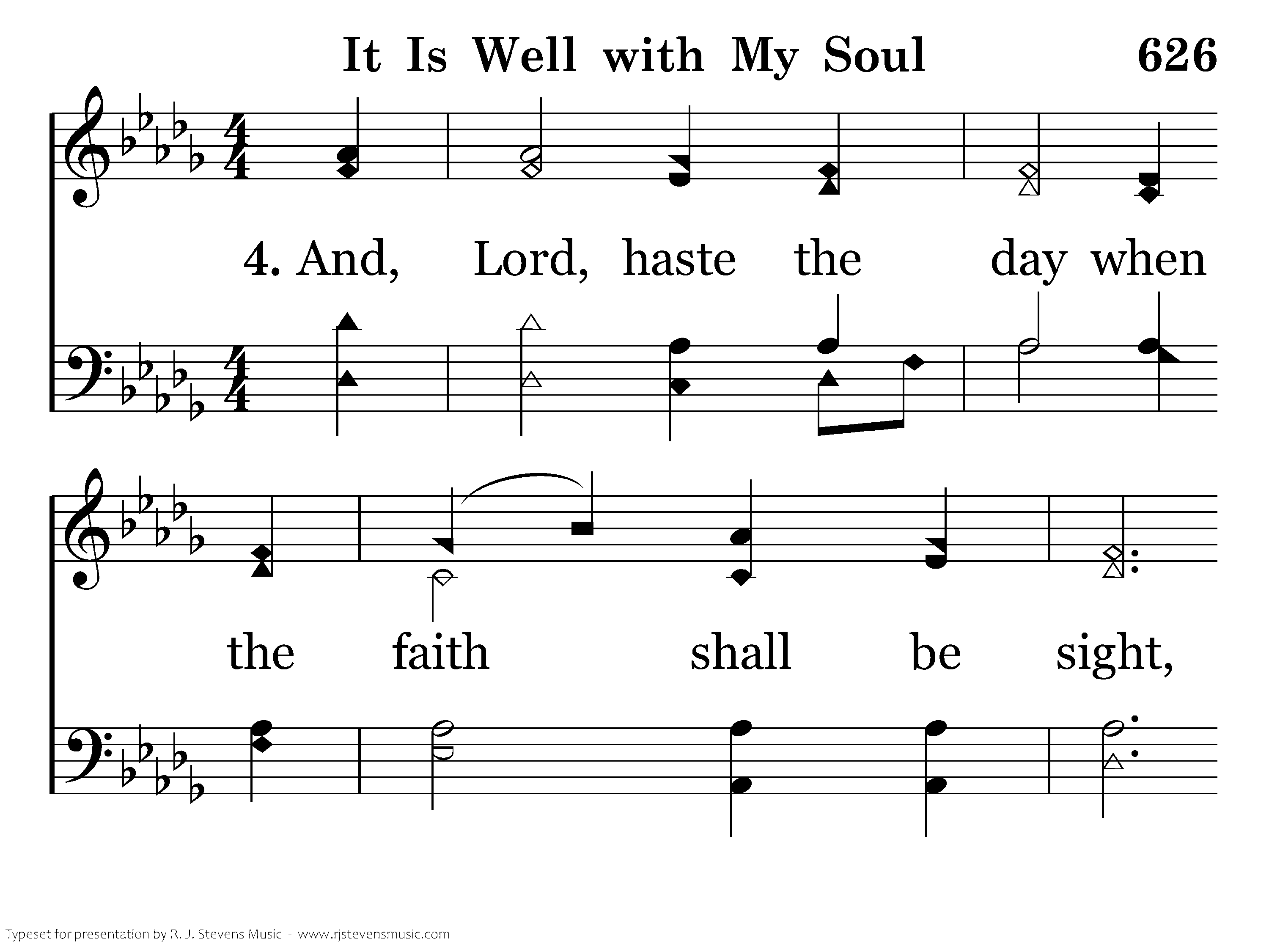 And, Lord, haste the day when the faith shall be sight, The clouds be rolled back as a scroll, The trump shall resound, and the Lord shall descend, "Even so" it is well with my soul.