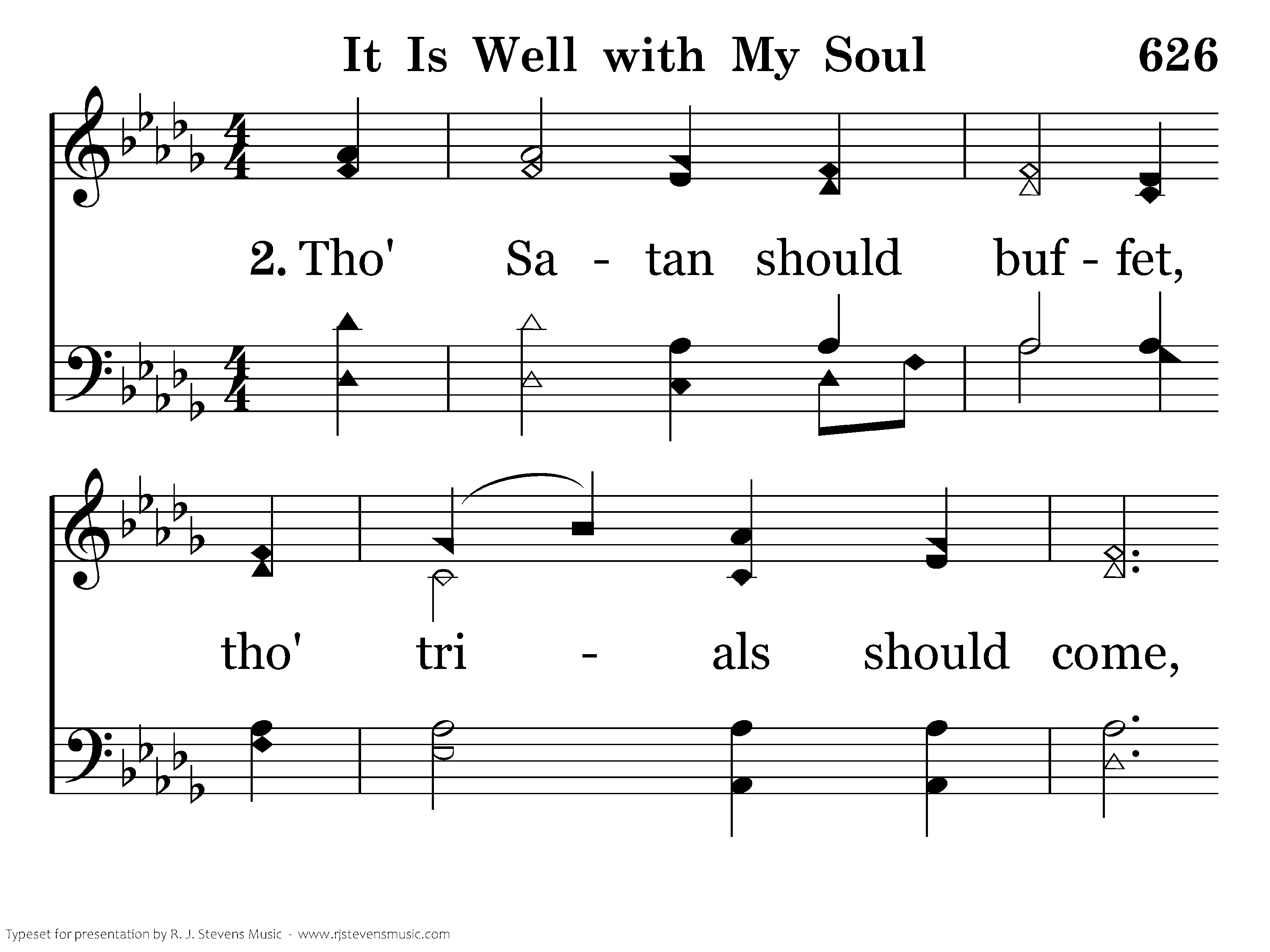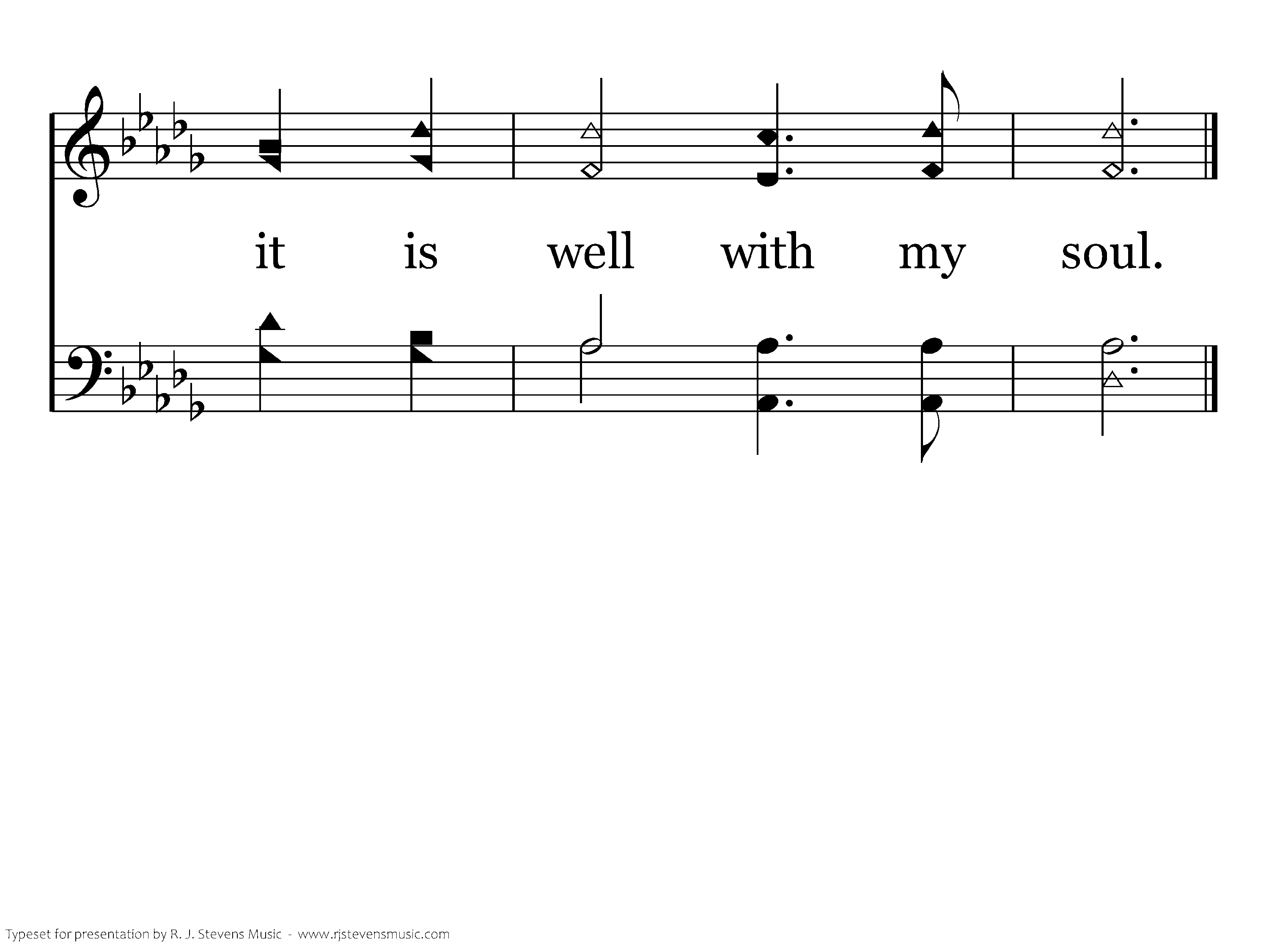 When peace like a river, attendeth my way, When sorrows like sea billows roll, Whatever my lot, Thou hast taught me to say, "It is well, it is well with my soul."