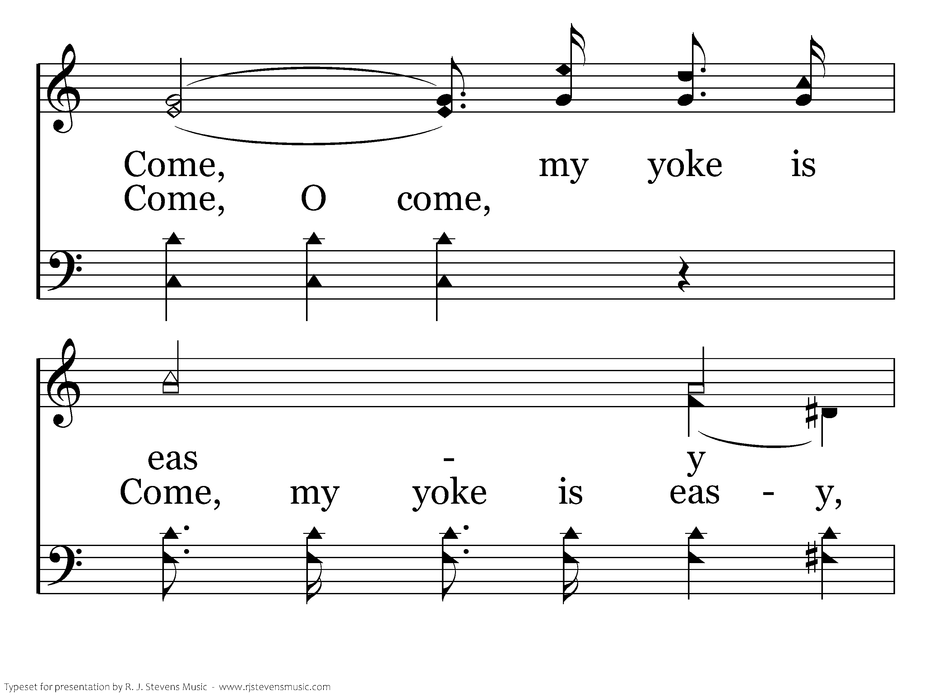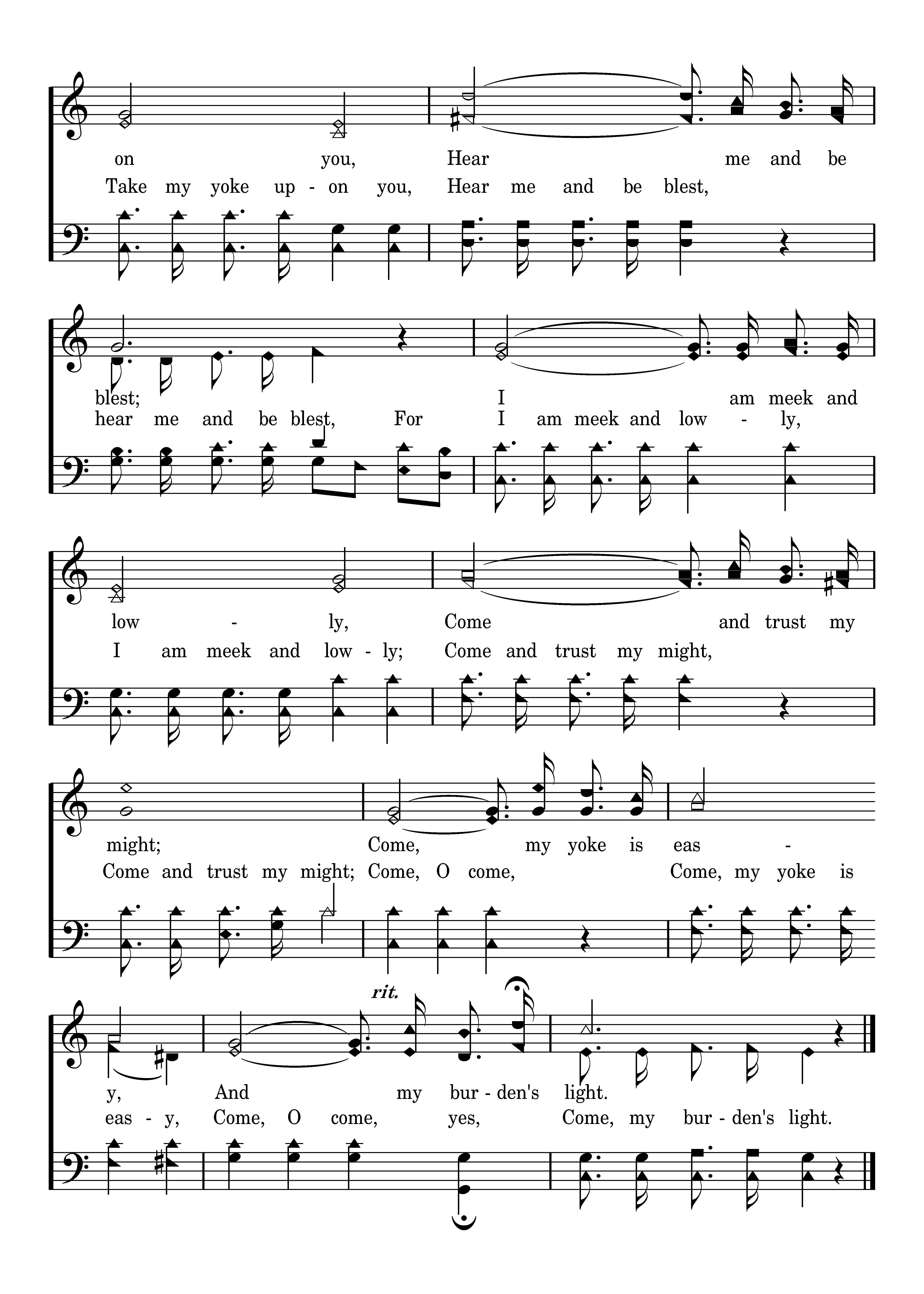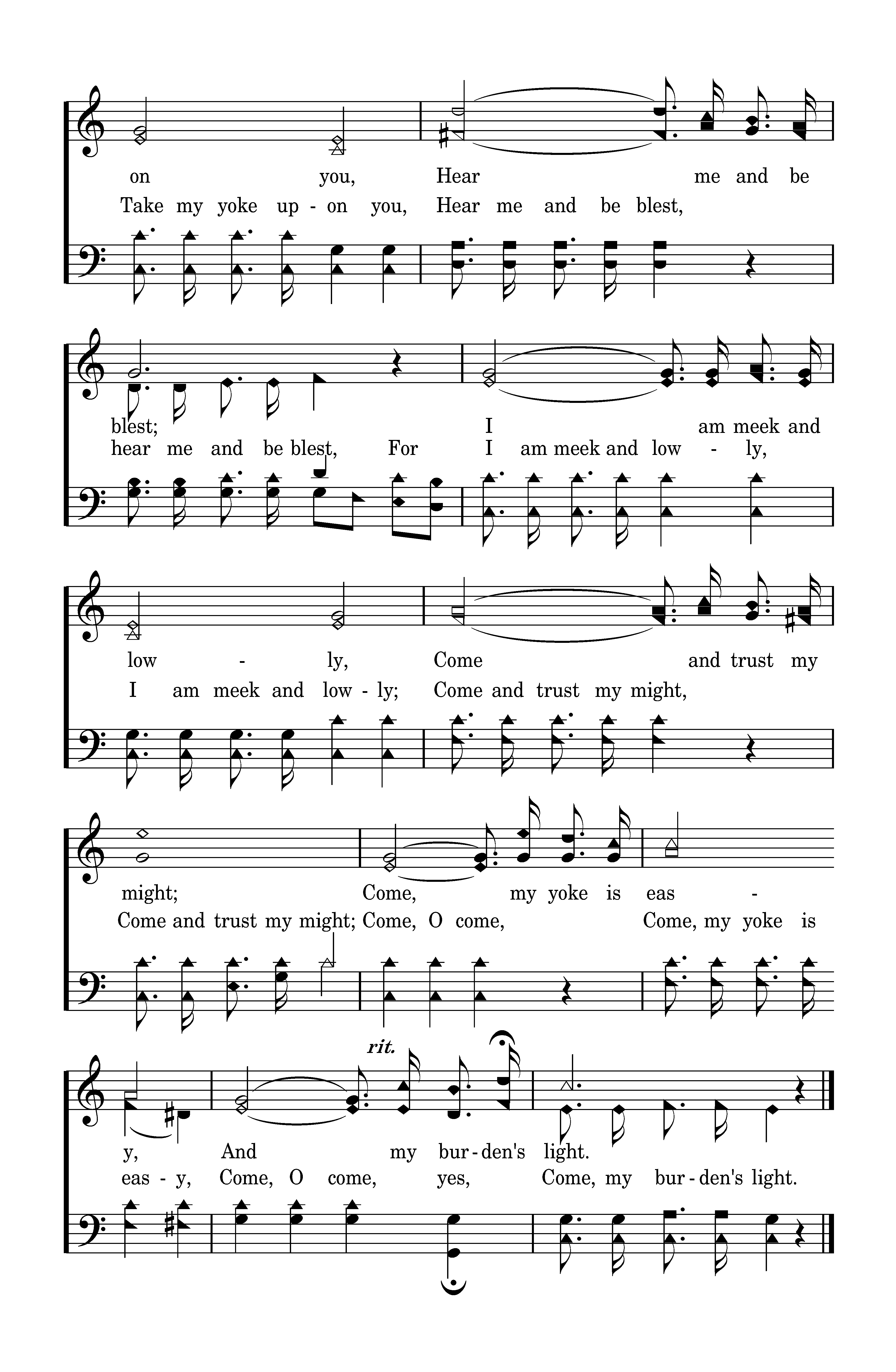 Come unto me, I will give you rest; Take my yoke upon you, Hear me and be blest; I am meek and lowly, Come and trust my might; Come my yoke is easy, And my burden's light.
