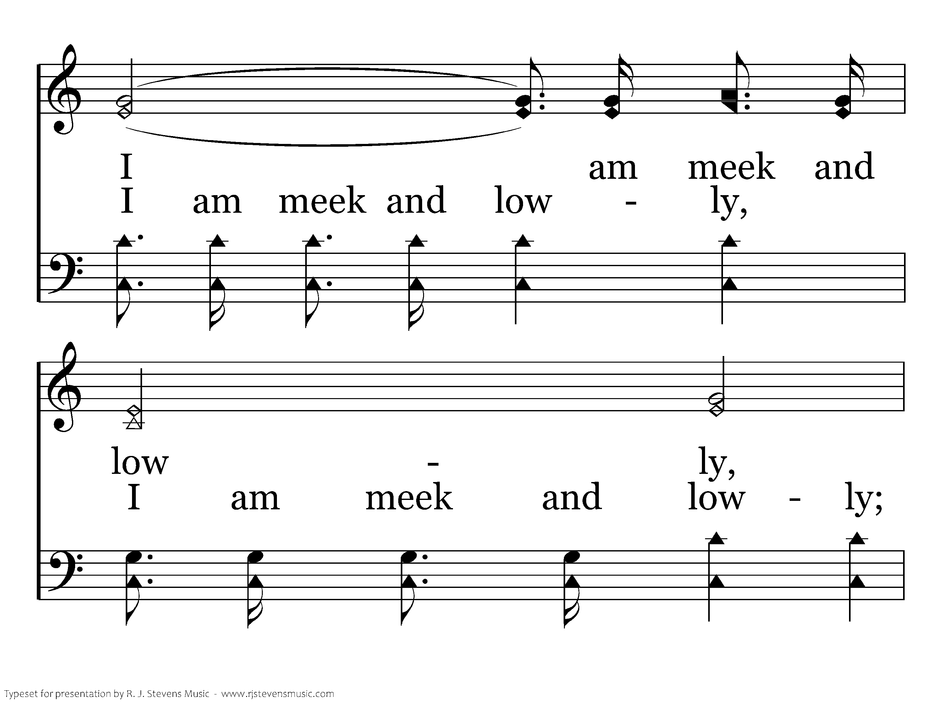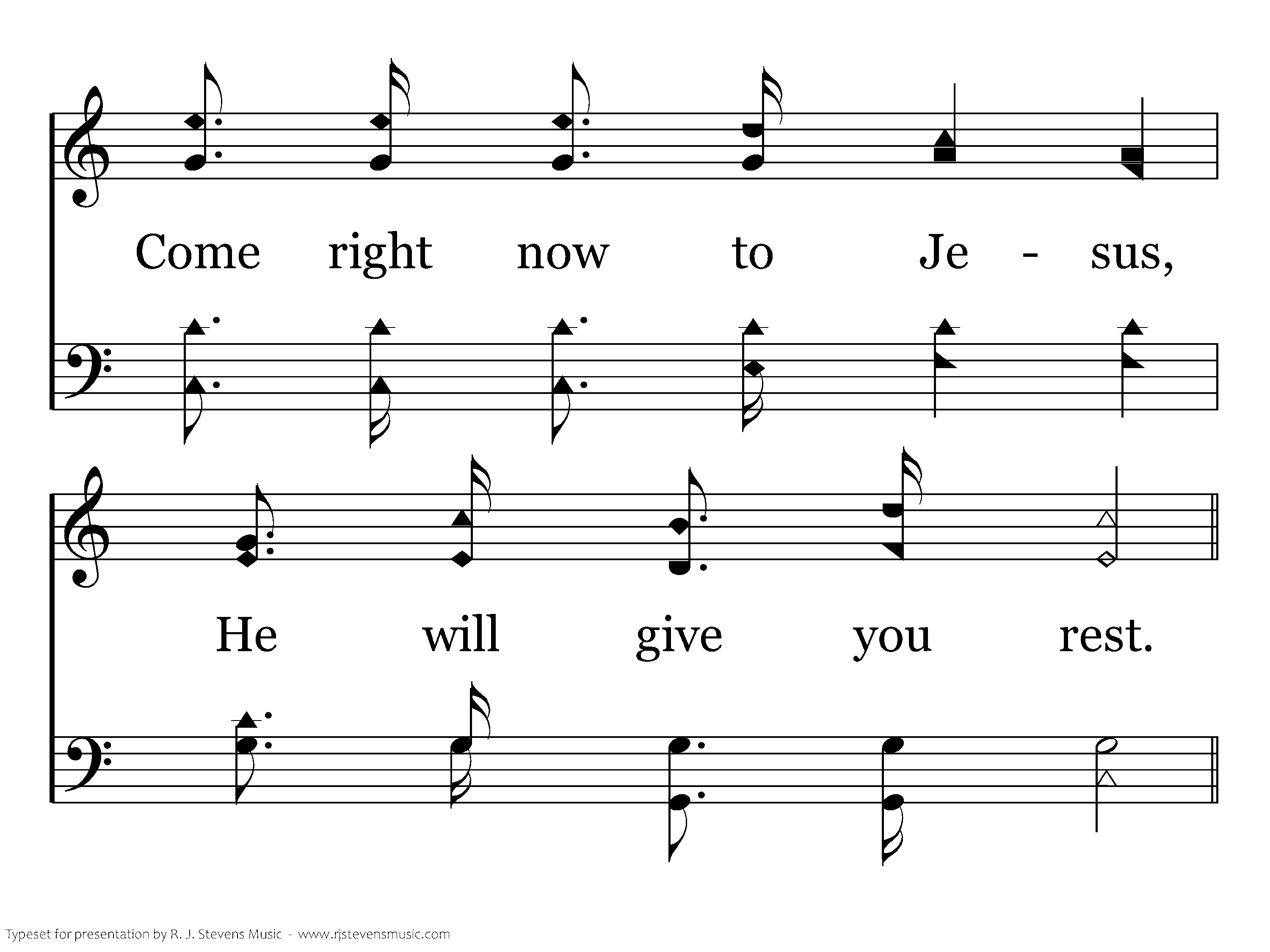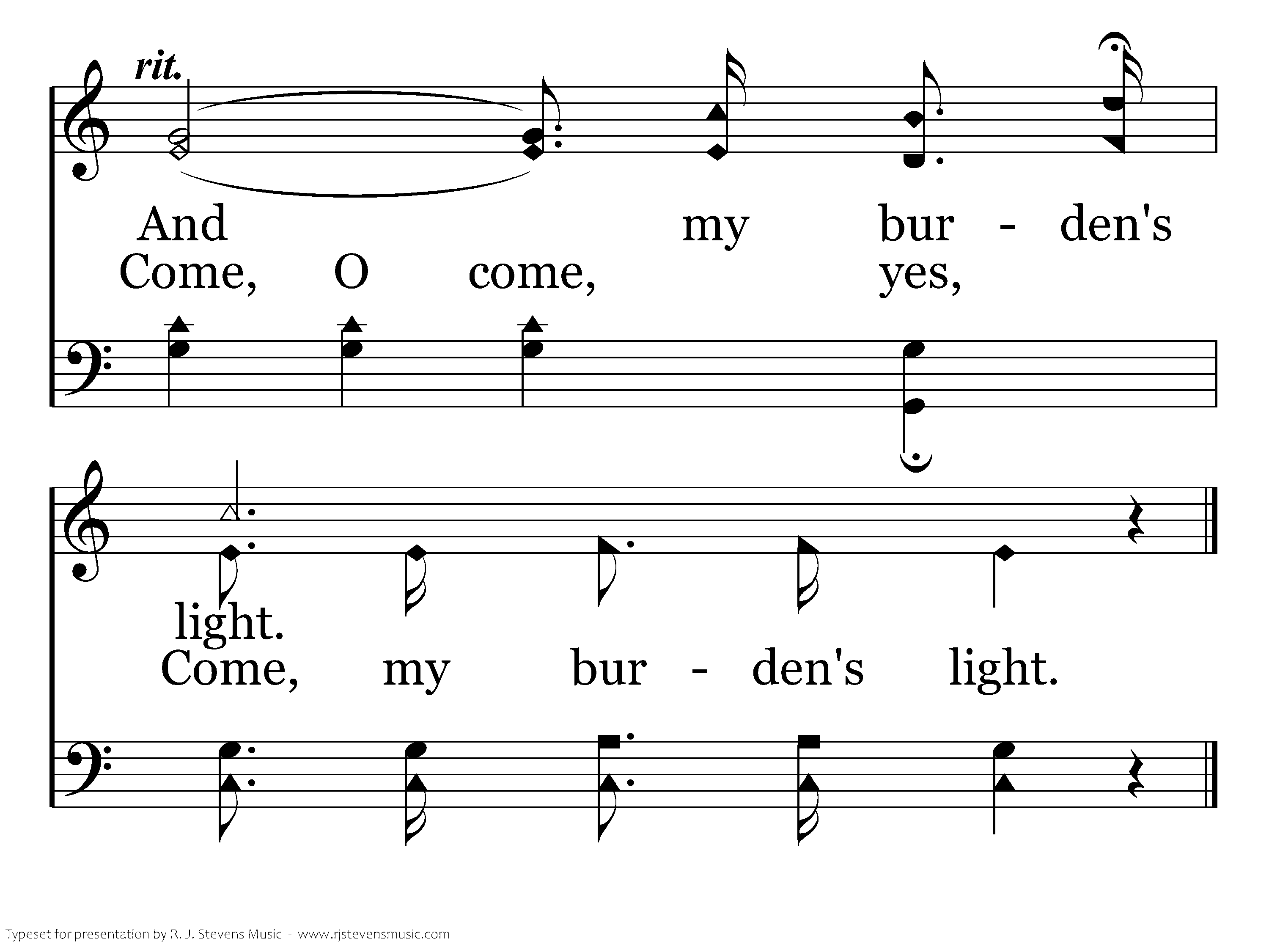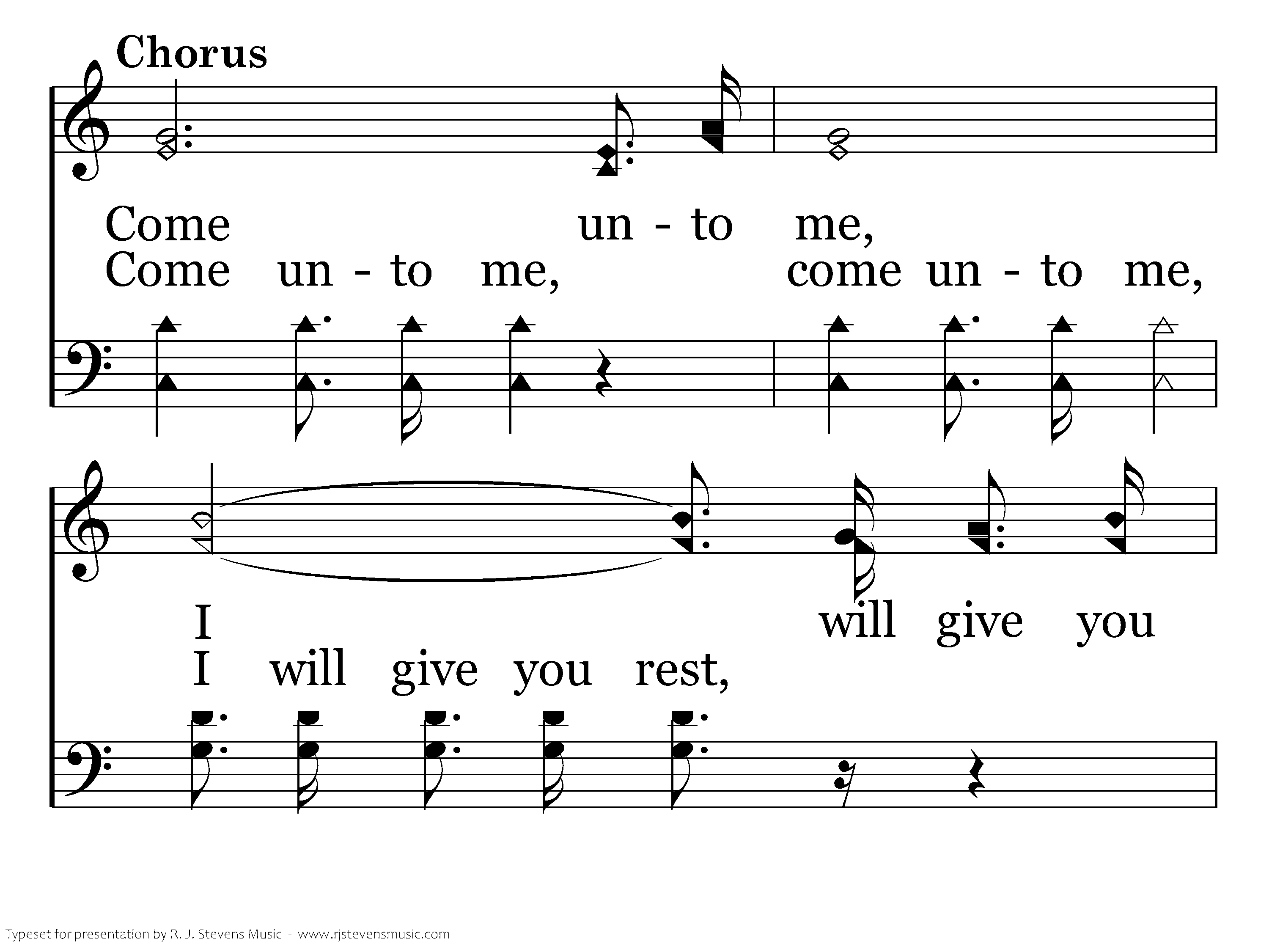 Come unto me, I will give you rest; Take my yoke upon you, Hear me and be blest; I am meek and lowly, Come and trust my might; Come my yoke is easy, And my burden's light.