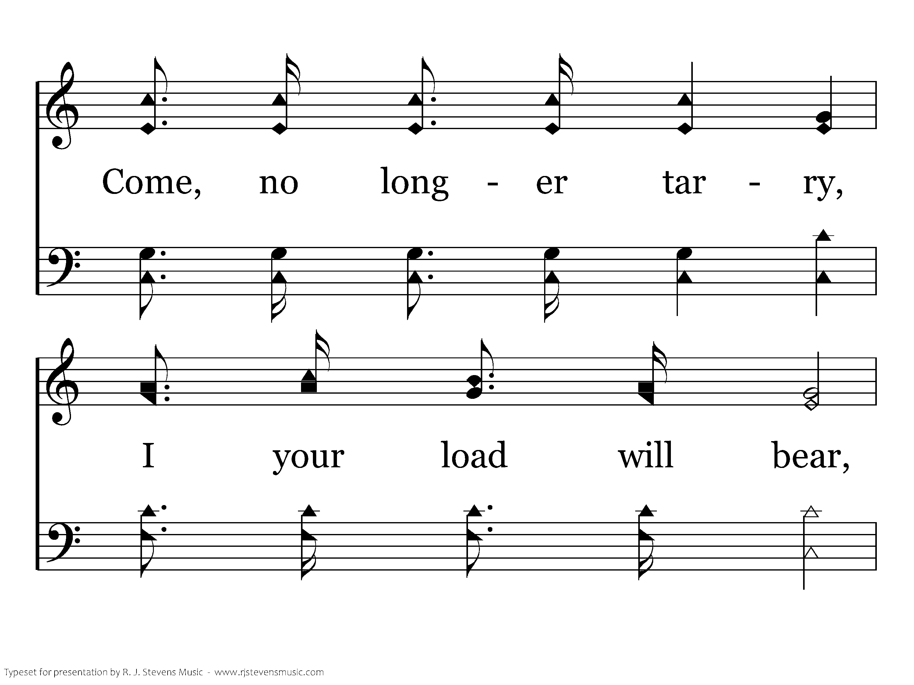 Hear the blessed Savior calling the oppressed, "O ye heavy laden, come to me and rest; Come, no longer tarry, I your load will bear, Bring me ev'ry burden, bring me ev'ry care."
