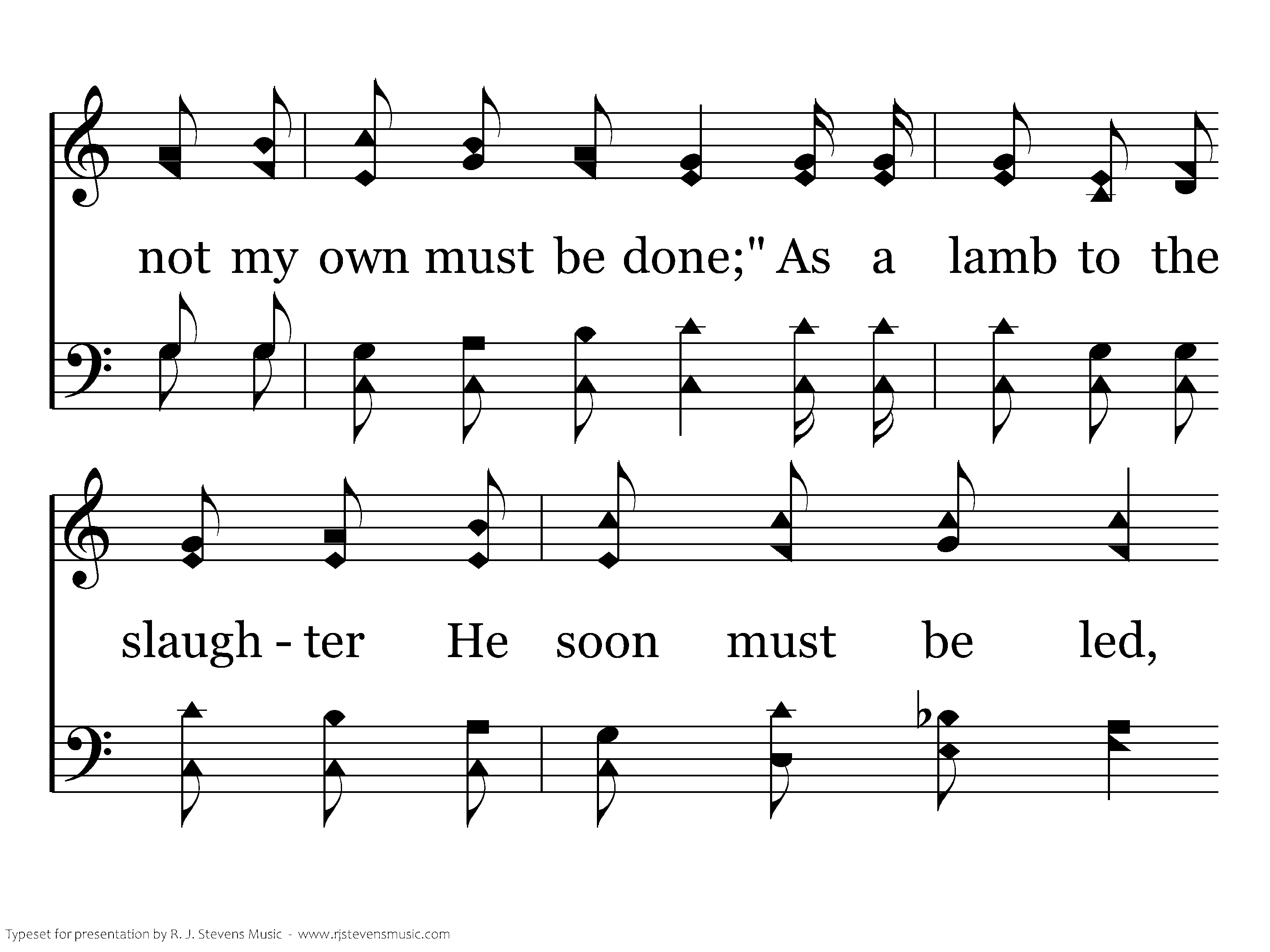 You can catch the sad tone of His voice as He said, "Thy will not my own must be done;" As a lamb to the slaughter He soon must be led, To die as the Crucified One.