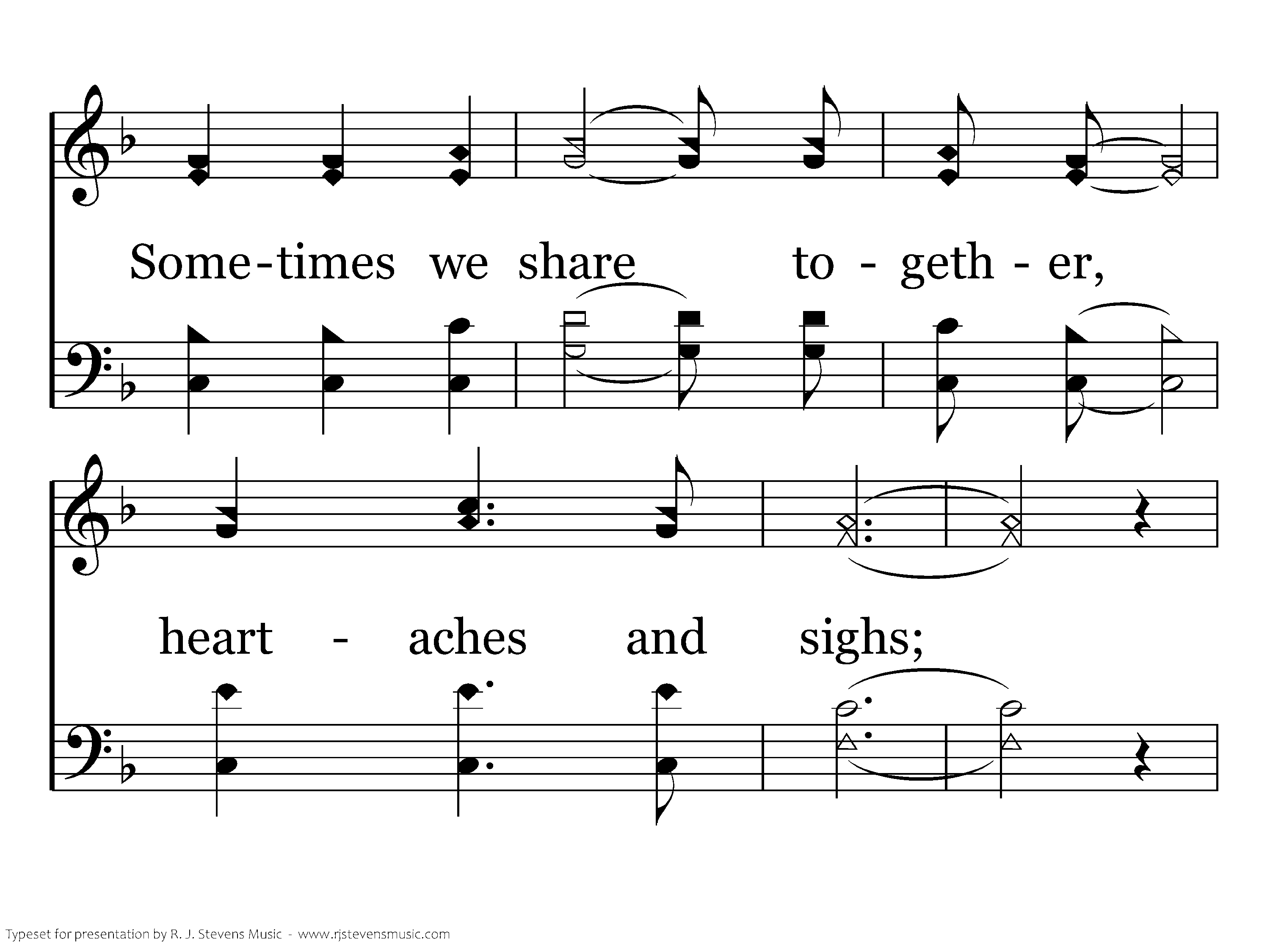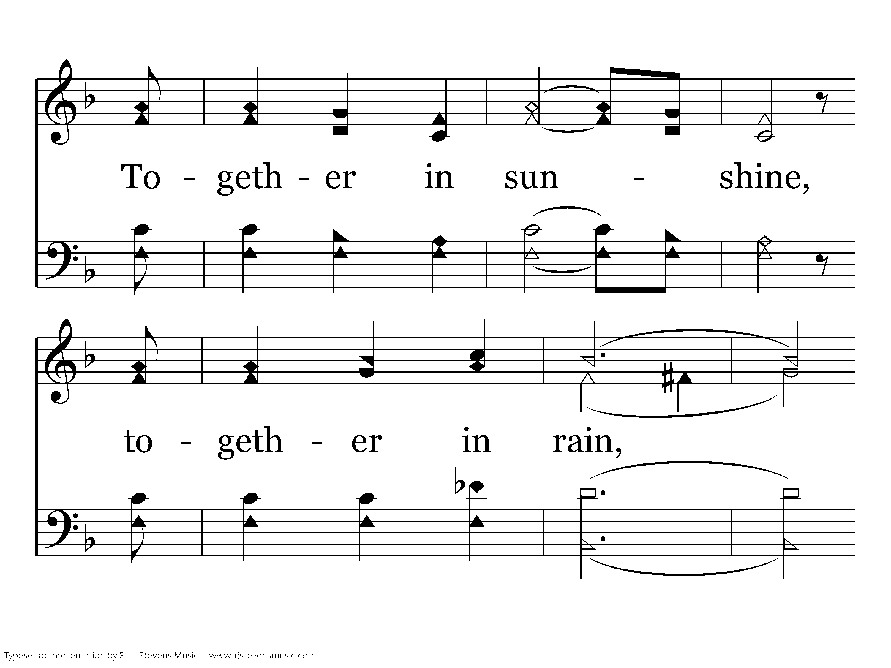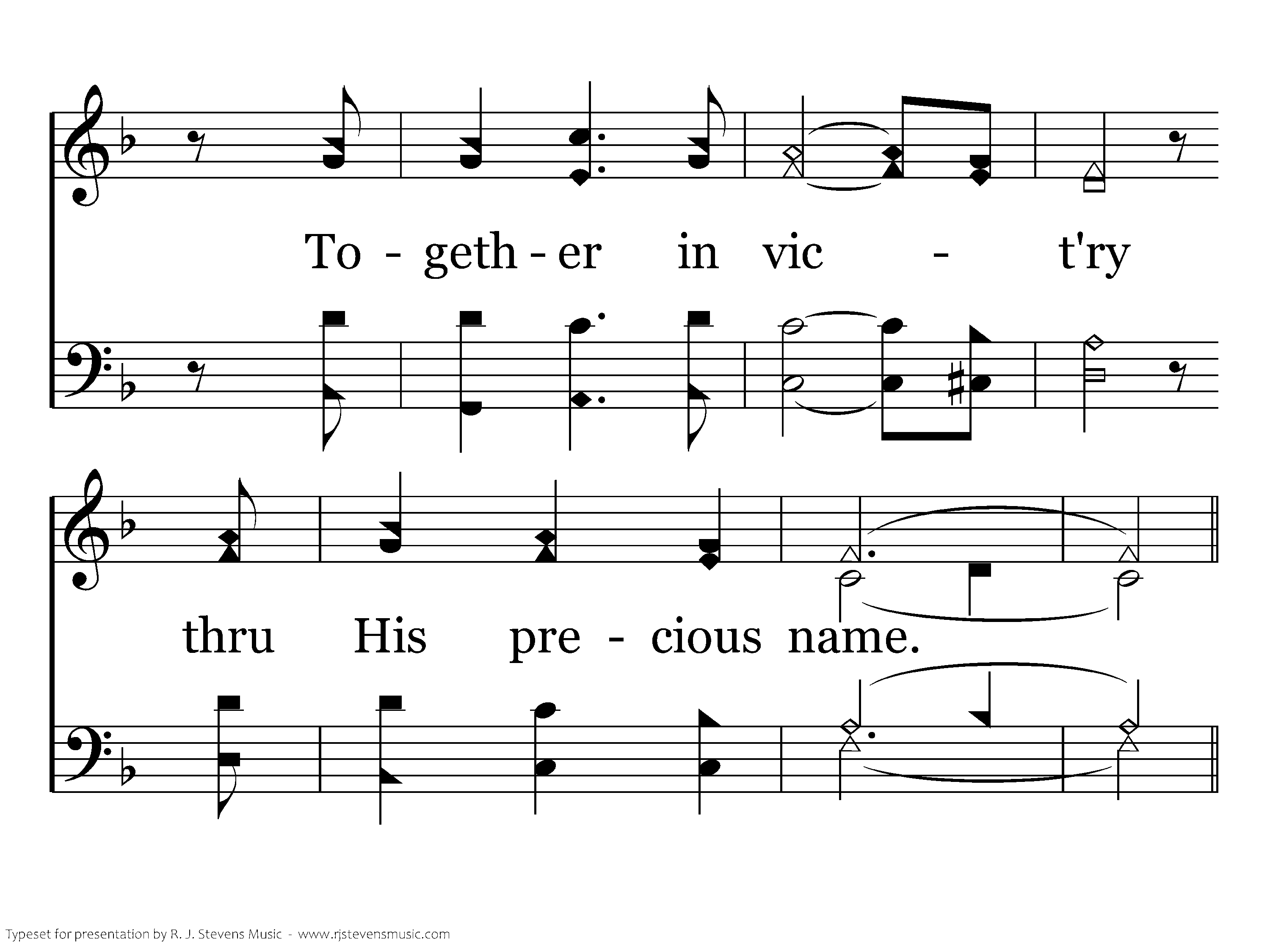 When a brother meets sorrow we all feel his grief; When he's passed thru the valley we all feel relief; Together in sunshine, together in rain, Together in vict'ry thru His precious name.