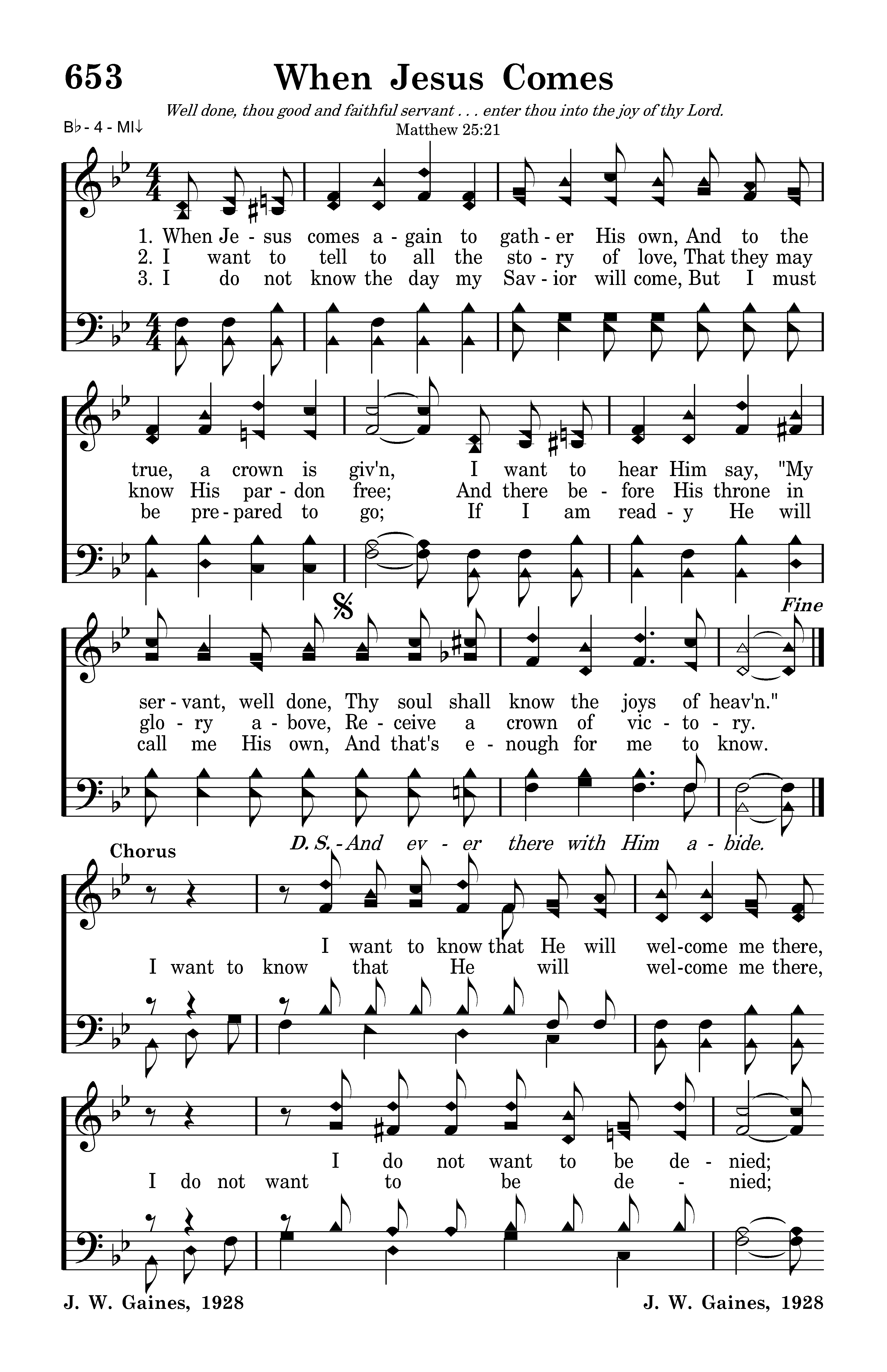 When Jesus comes again to gather His own, And to the true, a crown is giv'n, I want to hear Him say, "My servant, well done, Thy soul shall know the joys of heav'n."