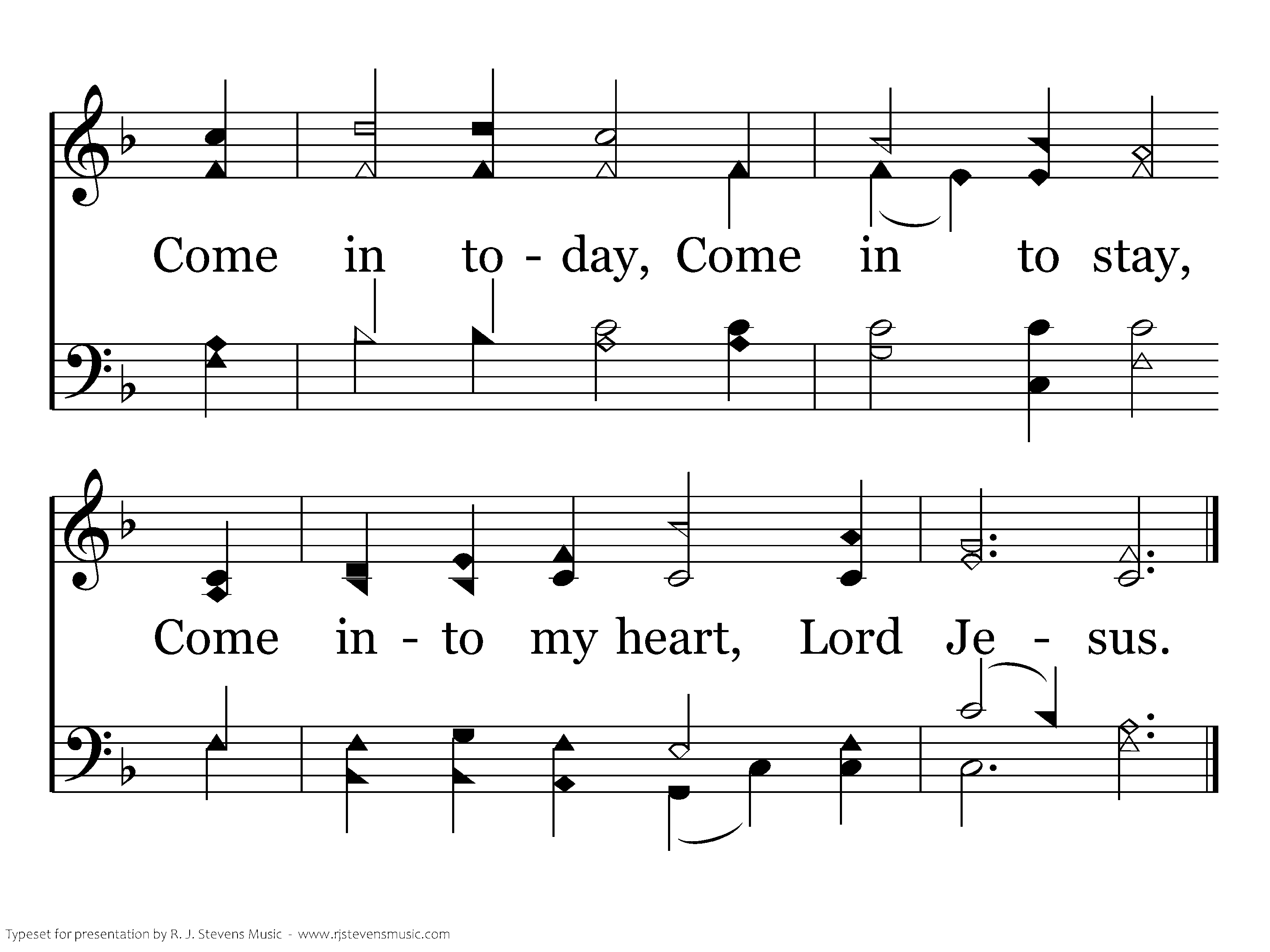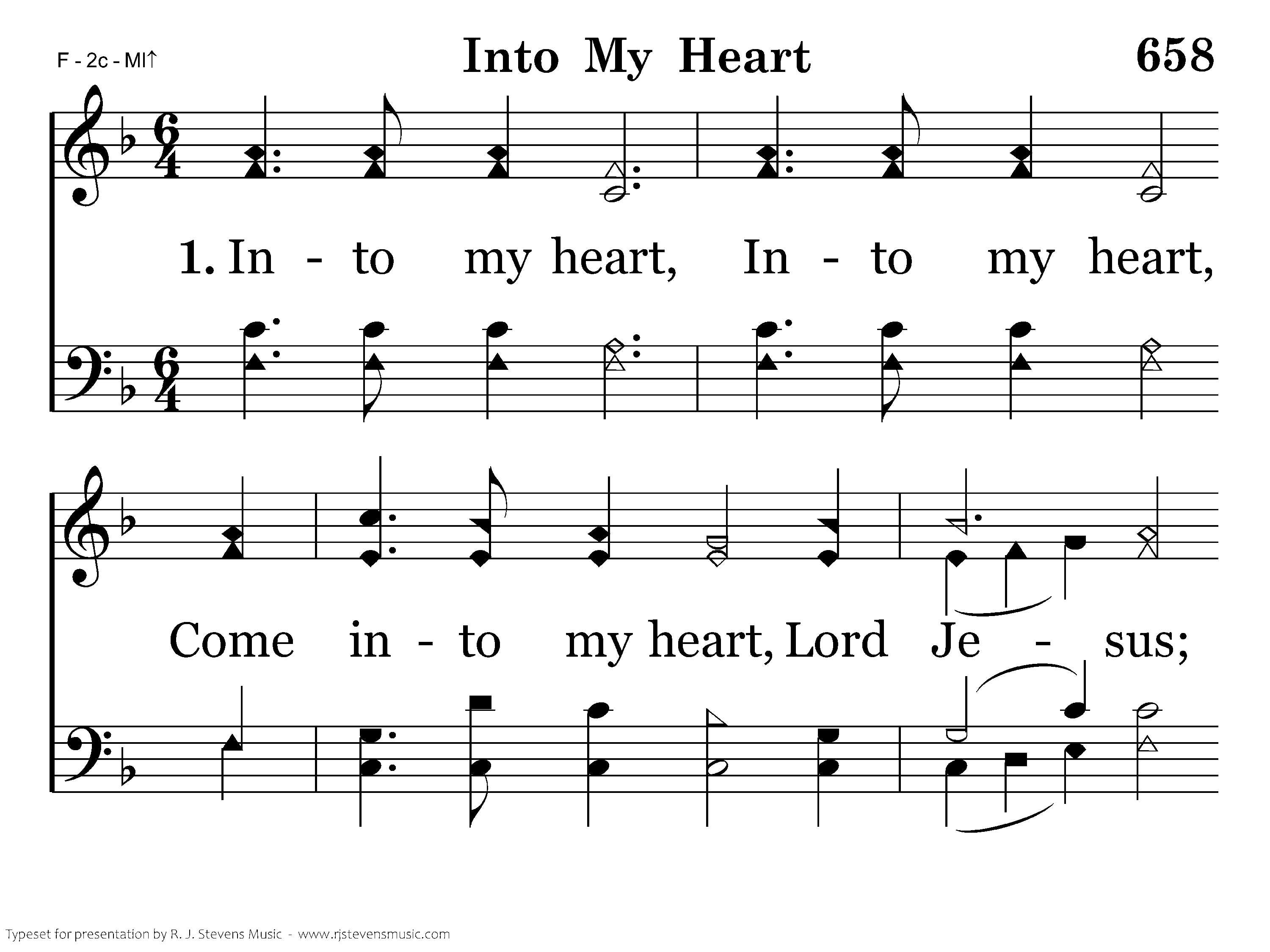 Into my heart, Into my heart, Come into my heart, Lord Jesus; Come in today, Come in to stay, Come into my heart, Lord Jesus.