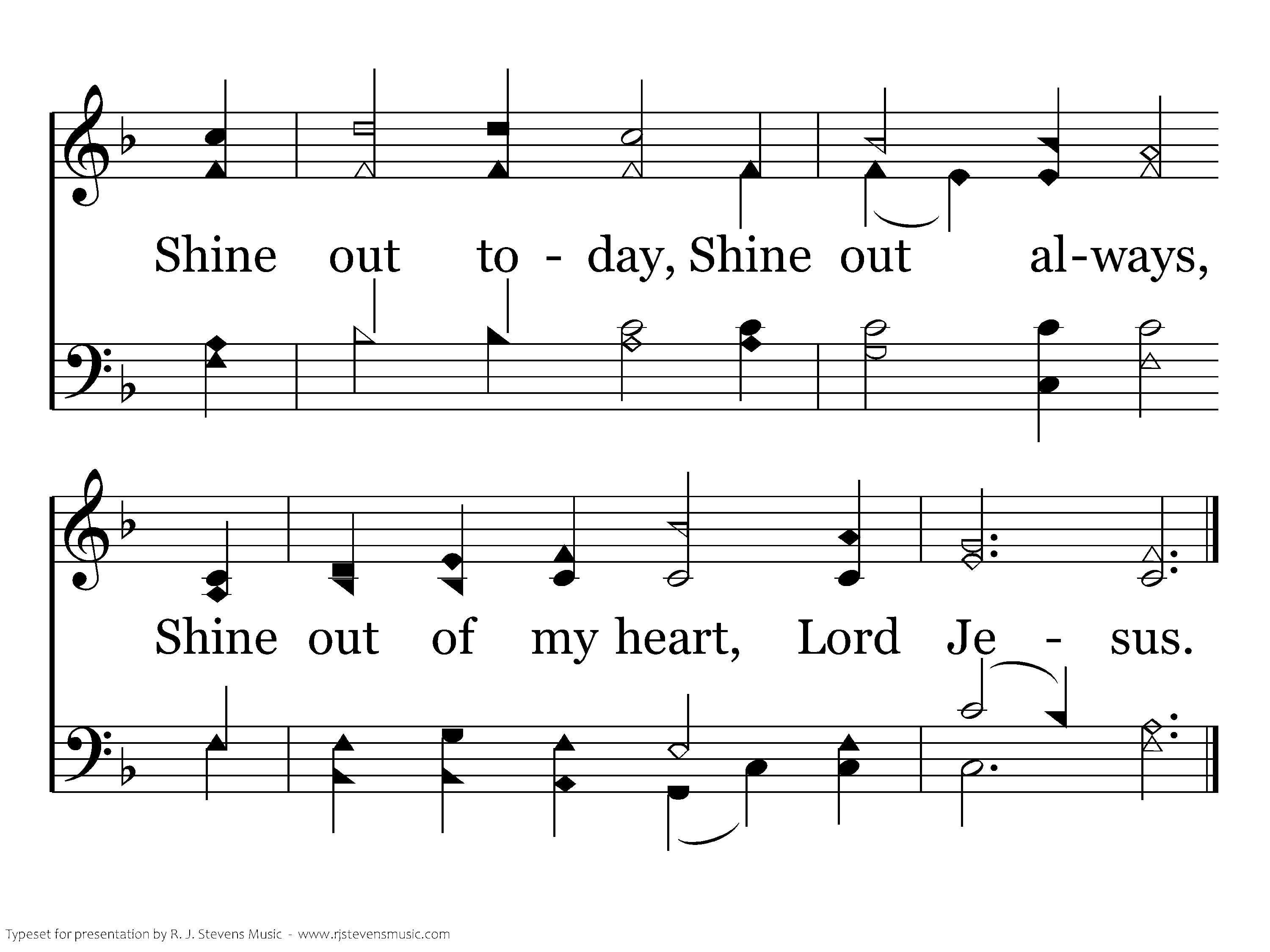 Out of my heart, Out of my heart, Shine out of my heart, Lord Jesus; Shine out today, Shine out always, Shine out of my heart, Lord Jesus.