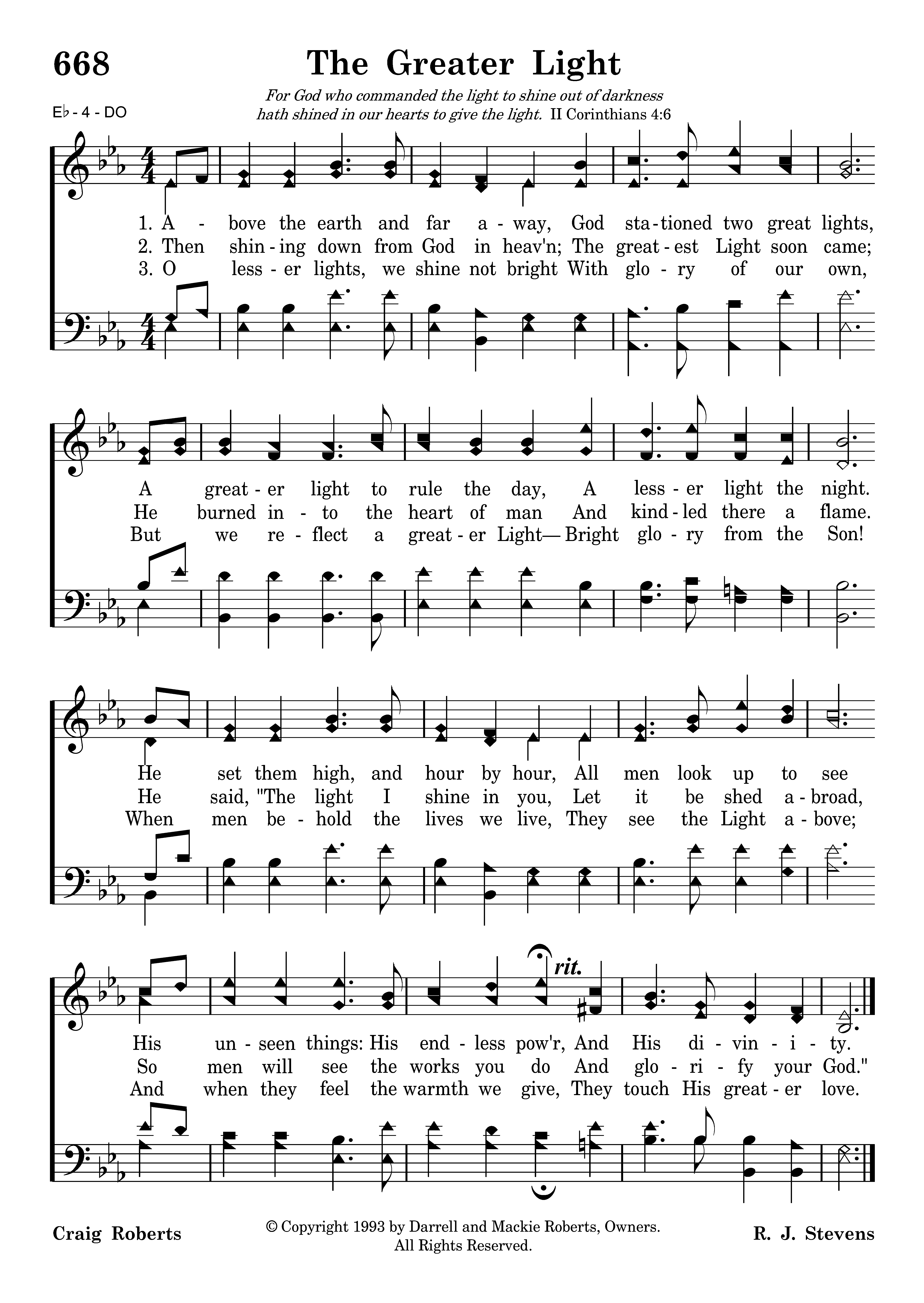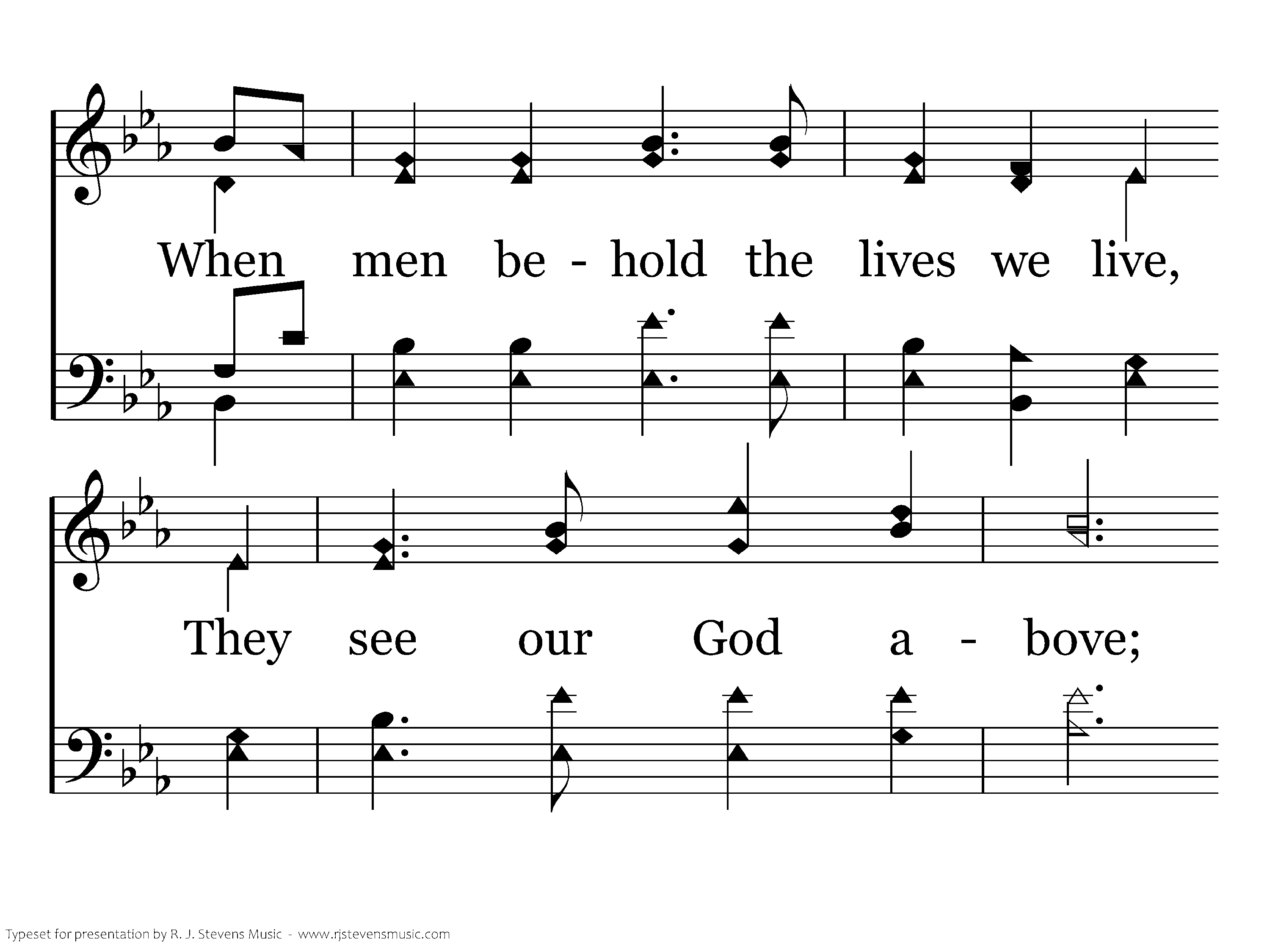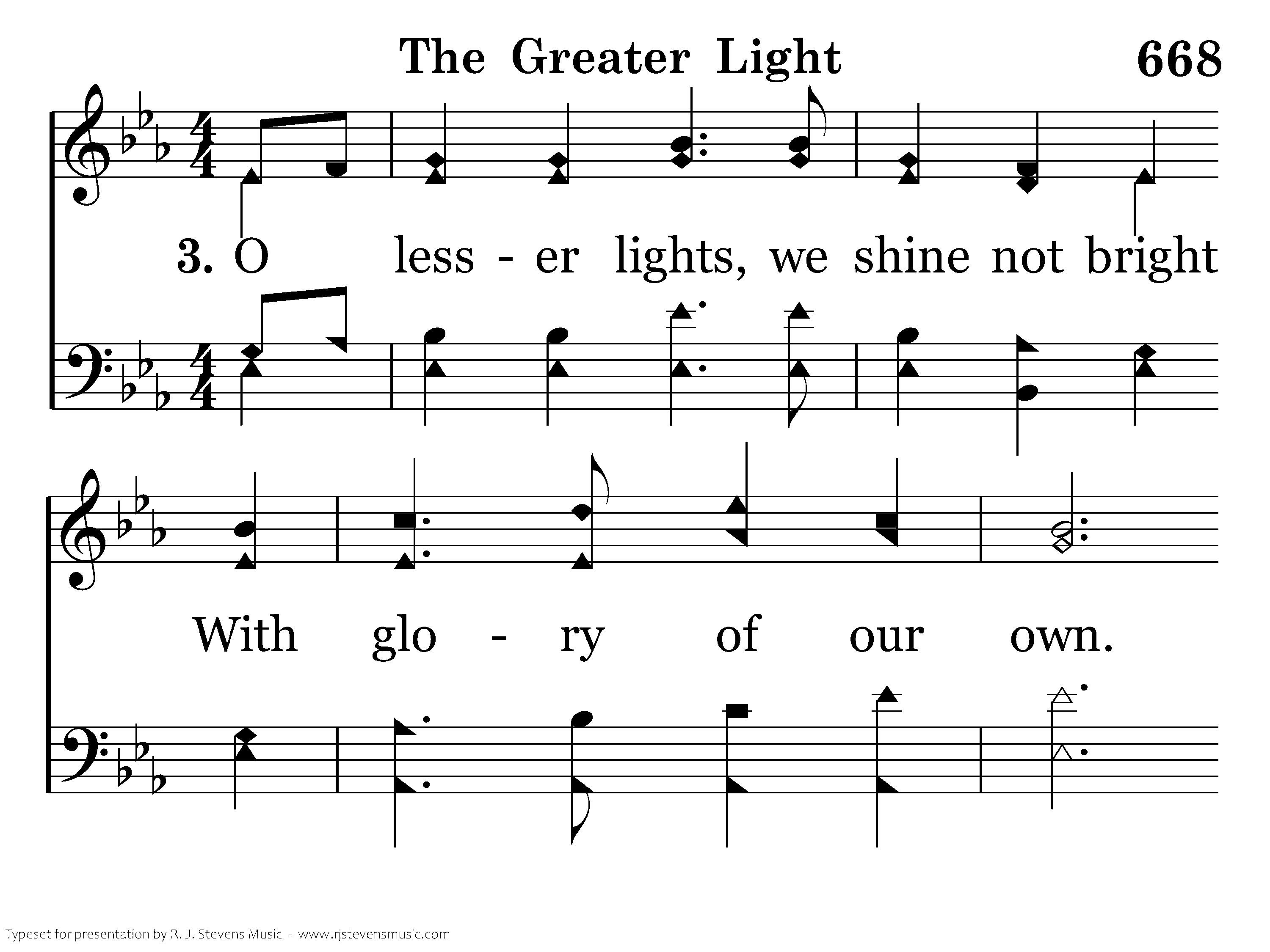 O lesser lights, we shine not bright With glory of our own, But we reflect a greater Light: Bright glory from the Son! When men behold the lives we live, They see the Light above; And when they feel the warmth we give, They touch His greater love.