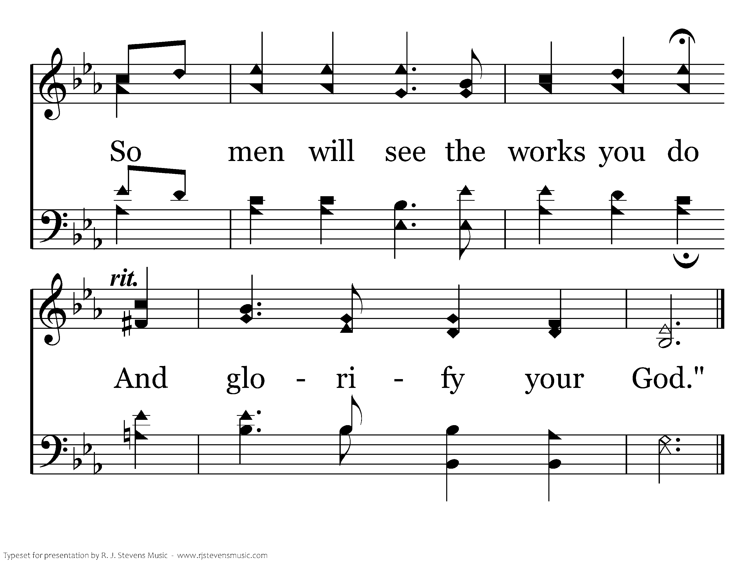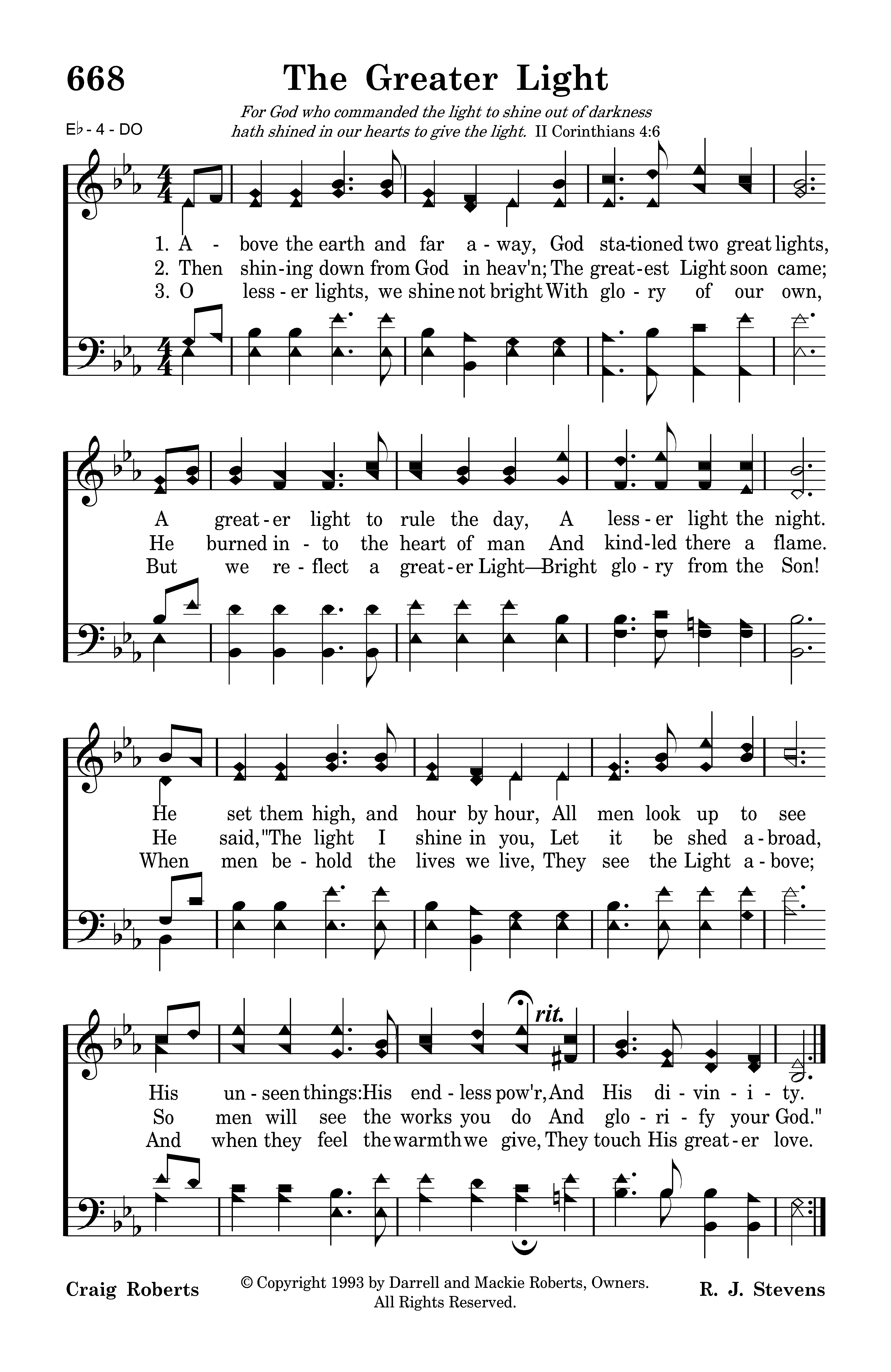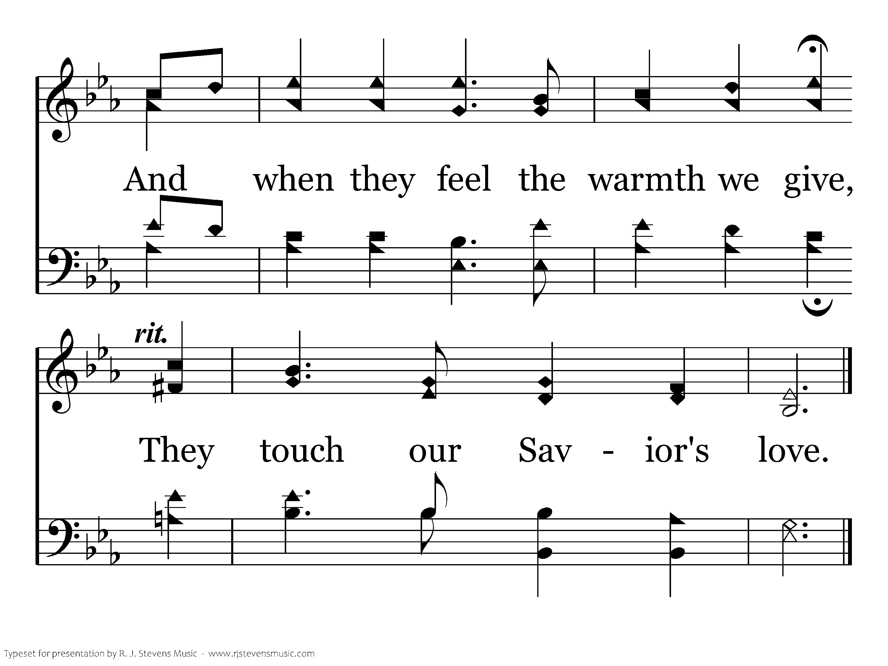 O lesser lights, we shine not bright With glory of our own, But we reflect a greater Light: Bright glory from the Son! When men behold the lives we live, They see the Light above; And when they feel the warmth we give, They touch His greater love.
