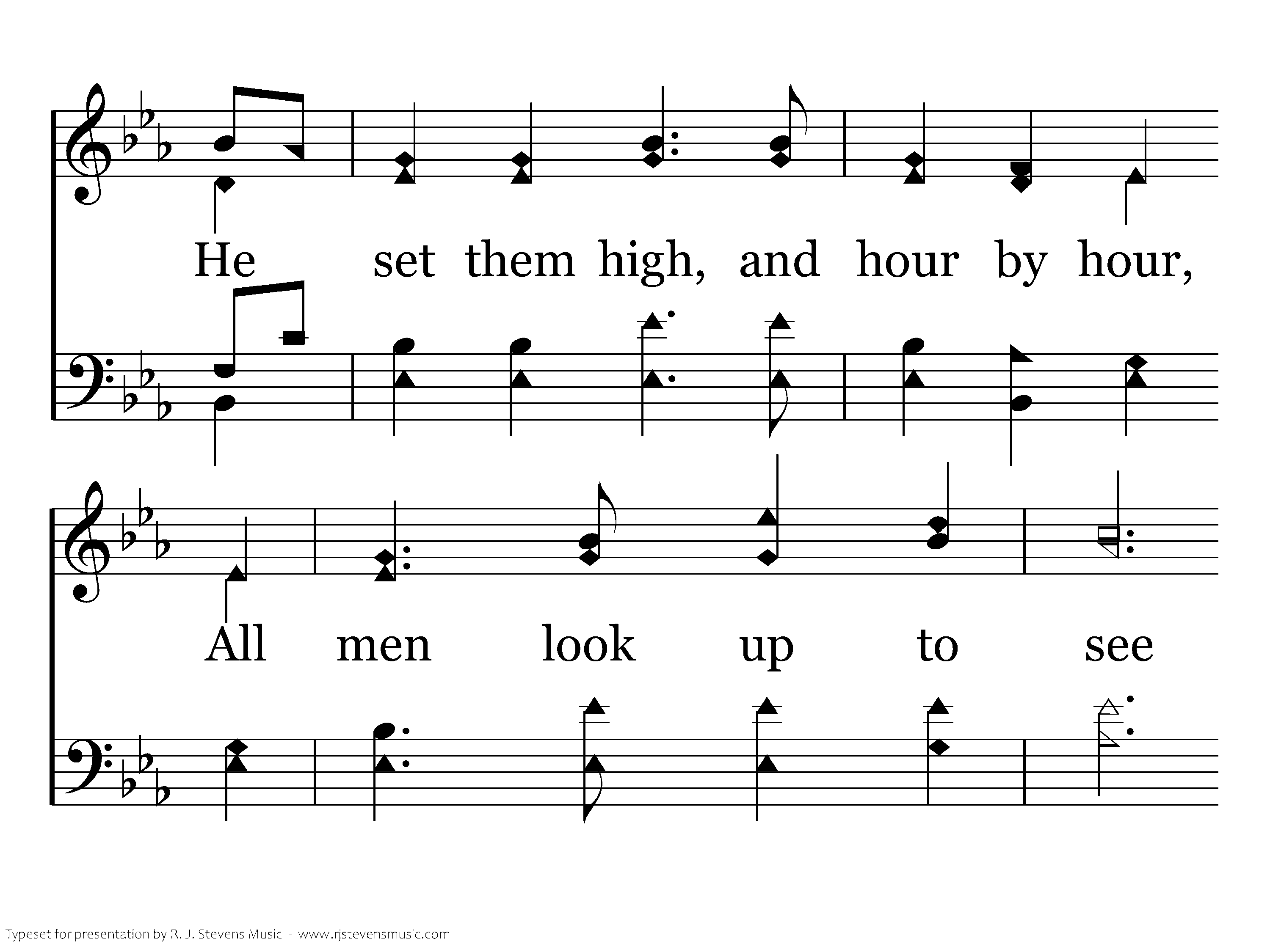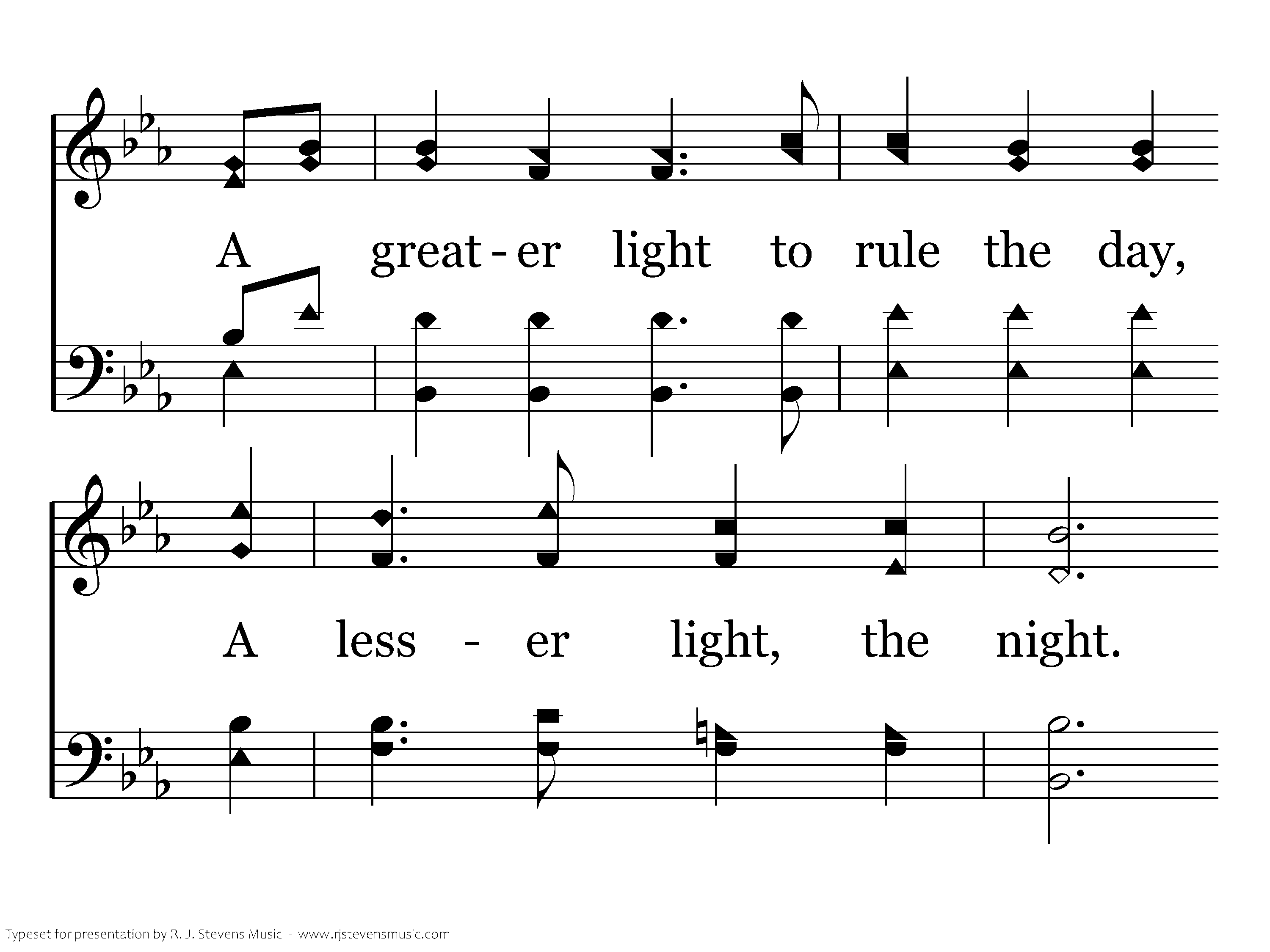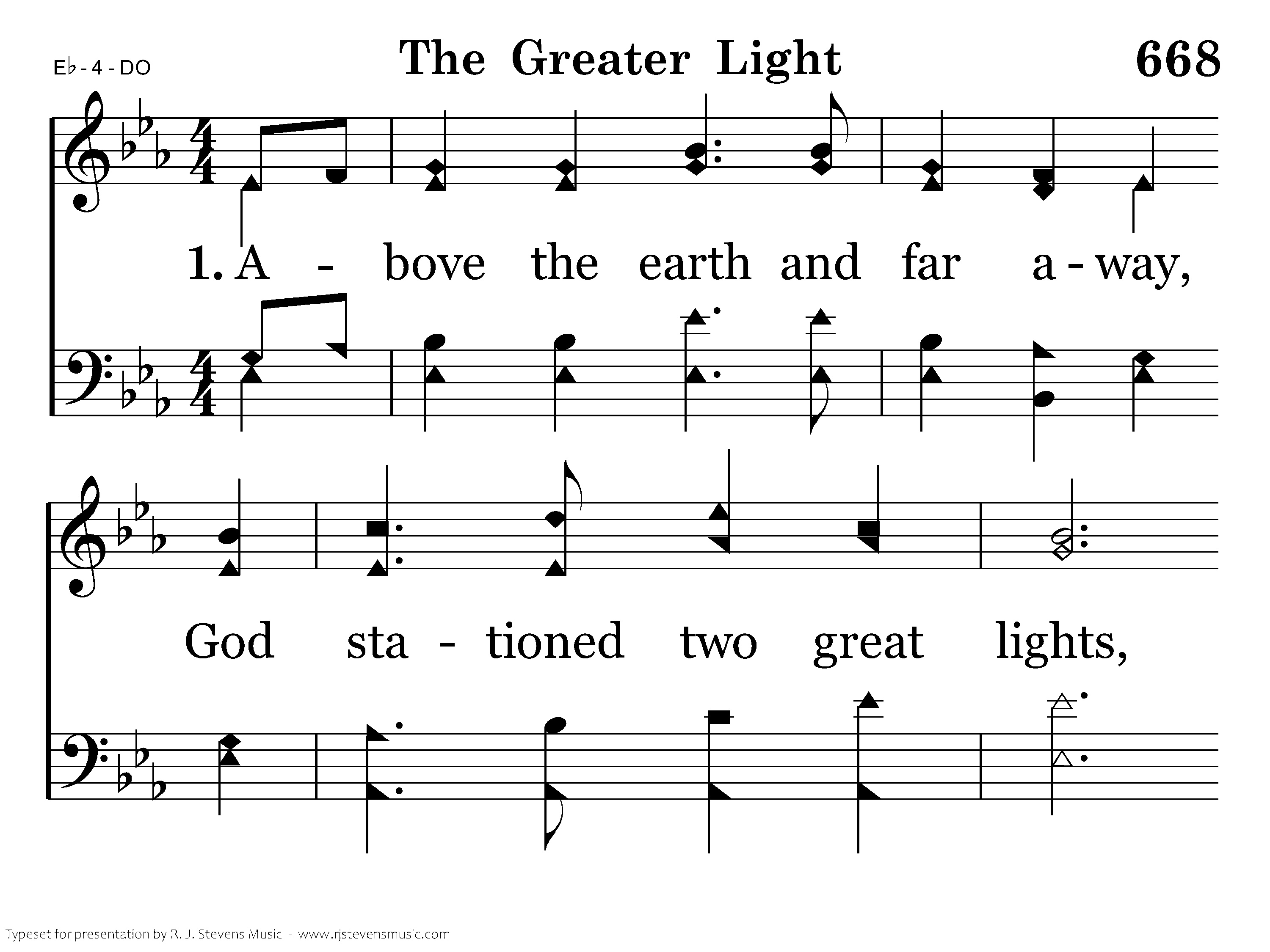 Above the earth and far away, God stationed two great lights, A greater light to rule the day, A lesser light the night. He set them high, and hour by hour, All men look up to see His unseen things: His endless pow'r, And His divinity.