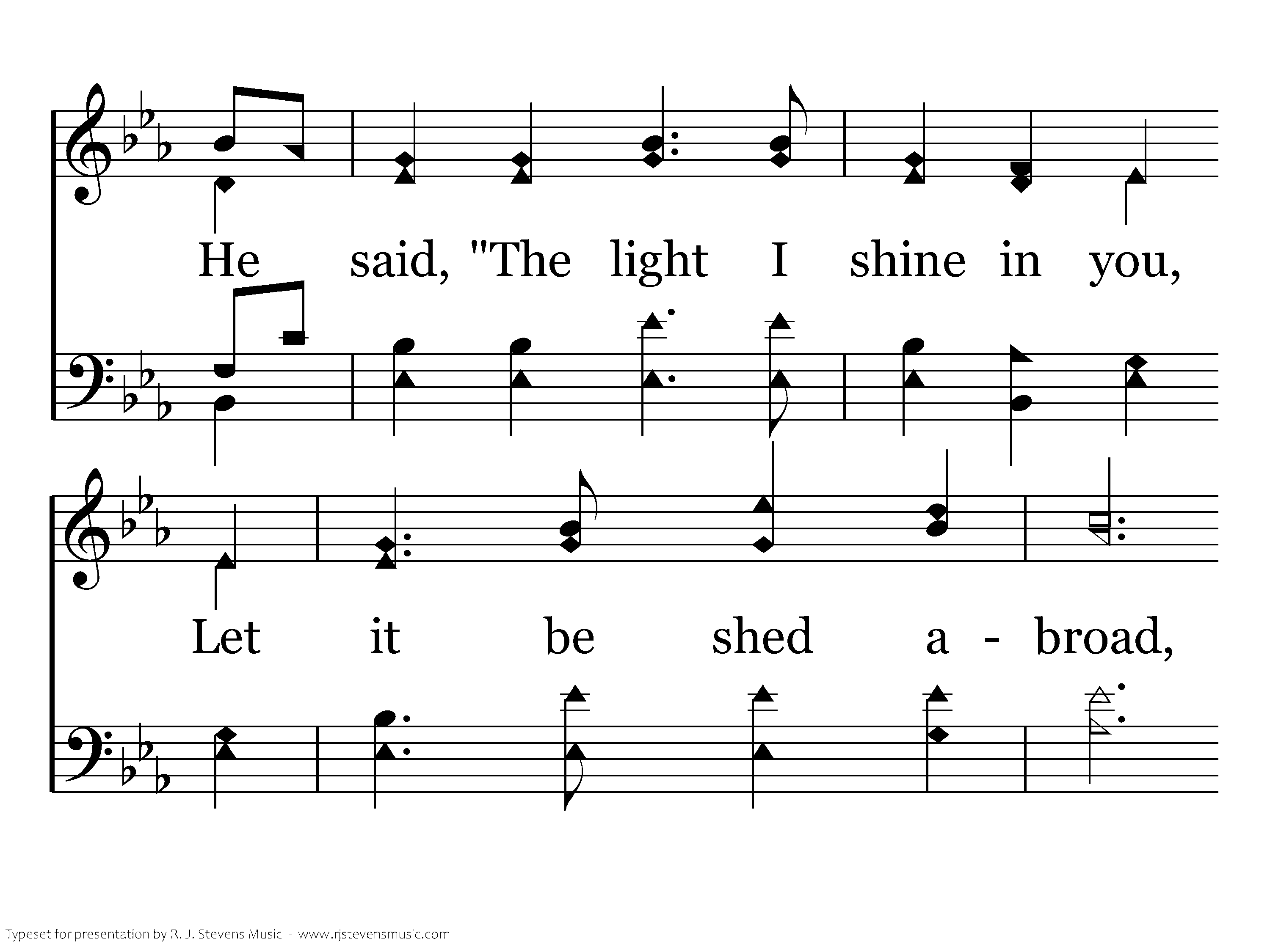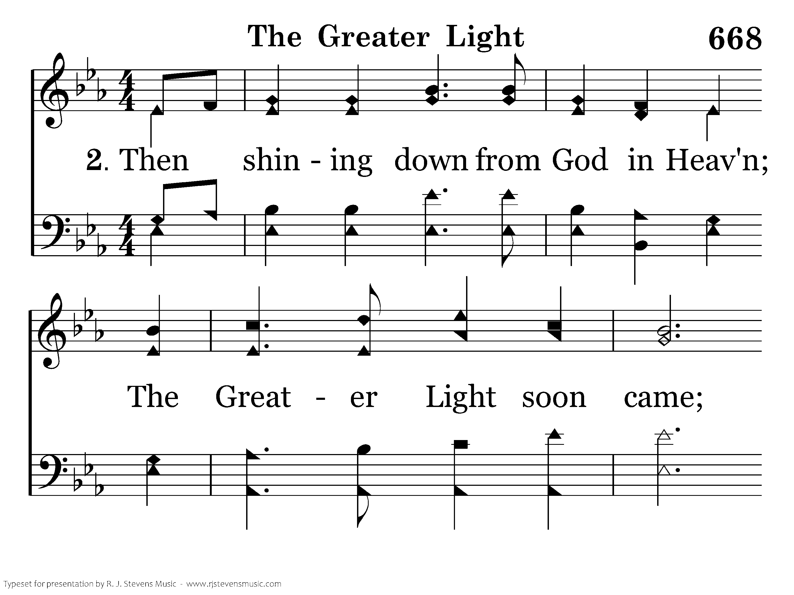 Then shining down from God in heav'n; The greatest Light soon came; He burned into the heart of man And kindled there a flame. He said, "The light I shine in you, let it be shed abroad, So men will see the works you do And glorify your God."