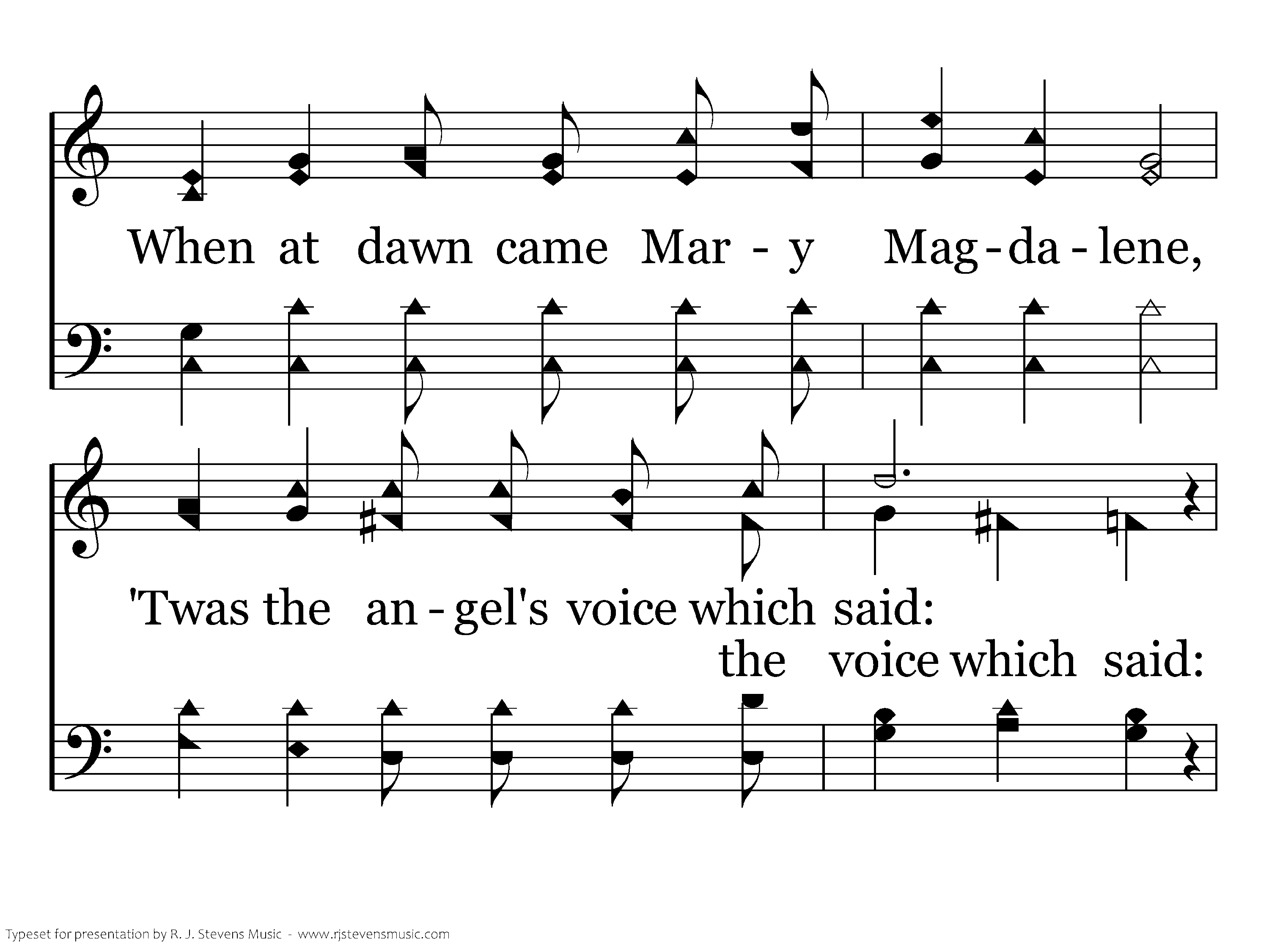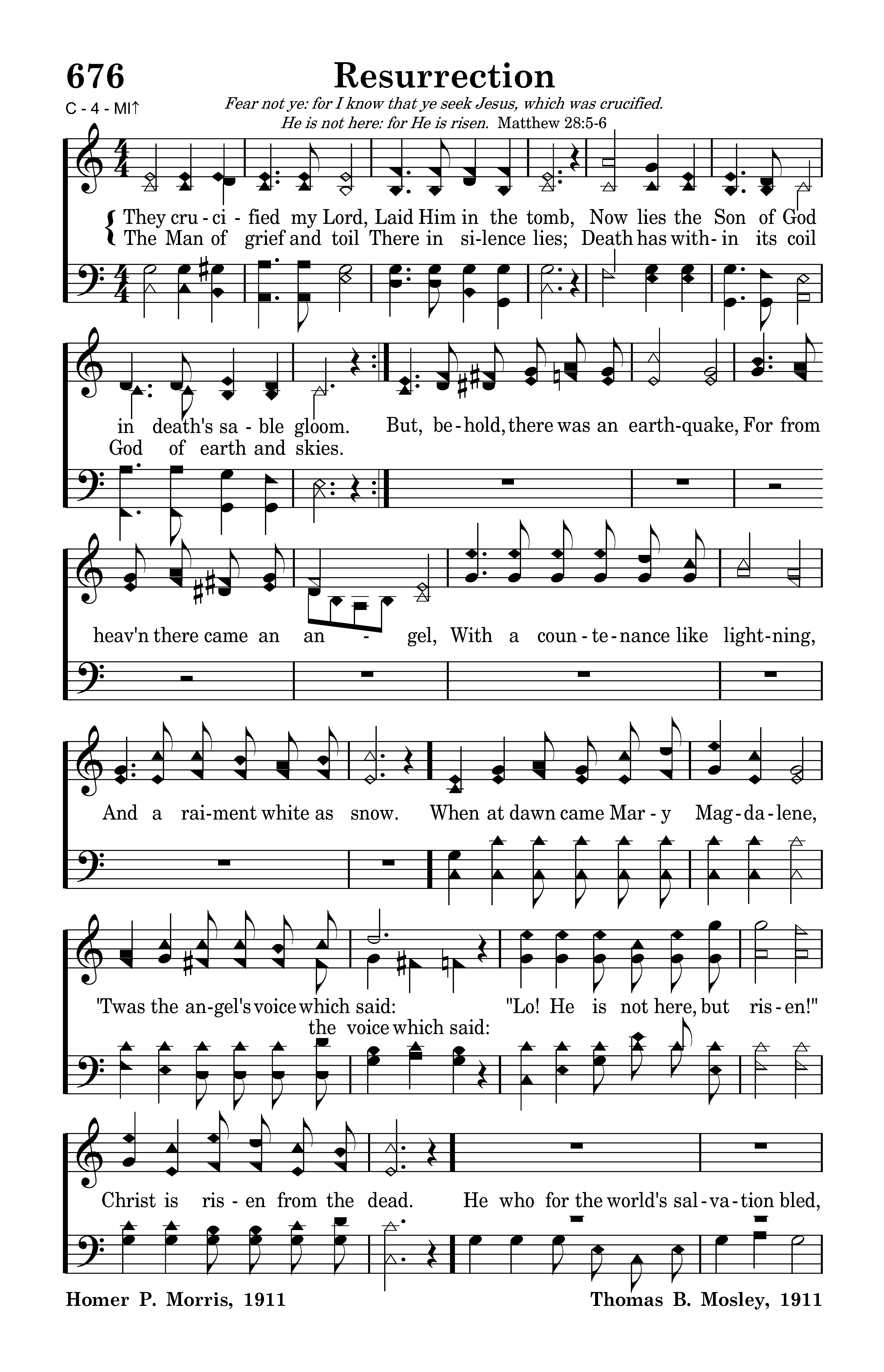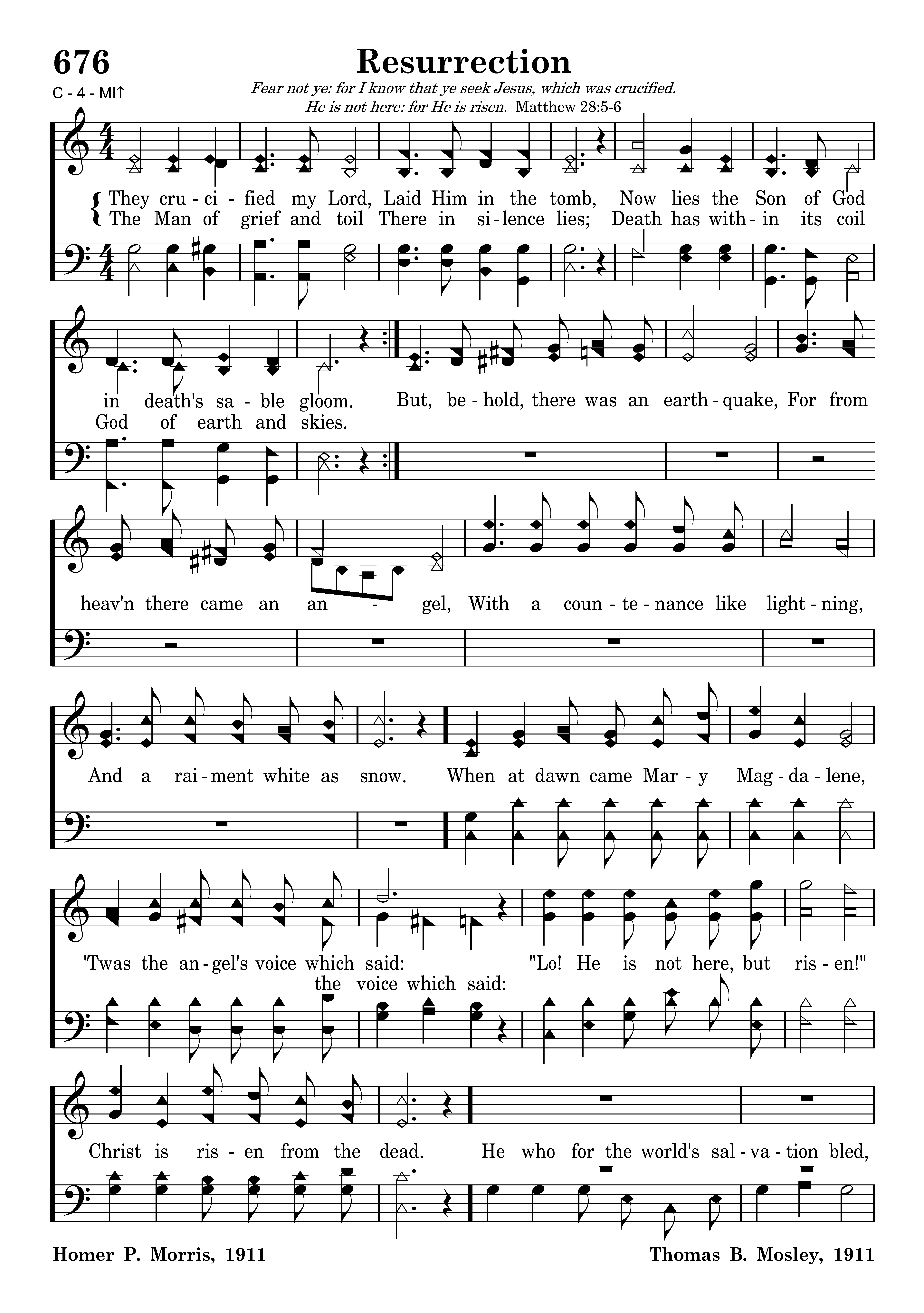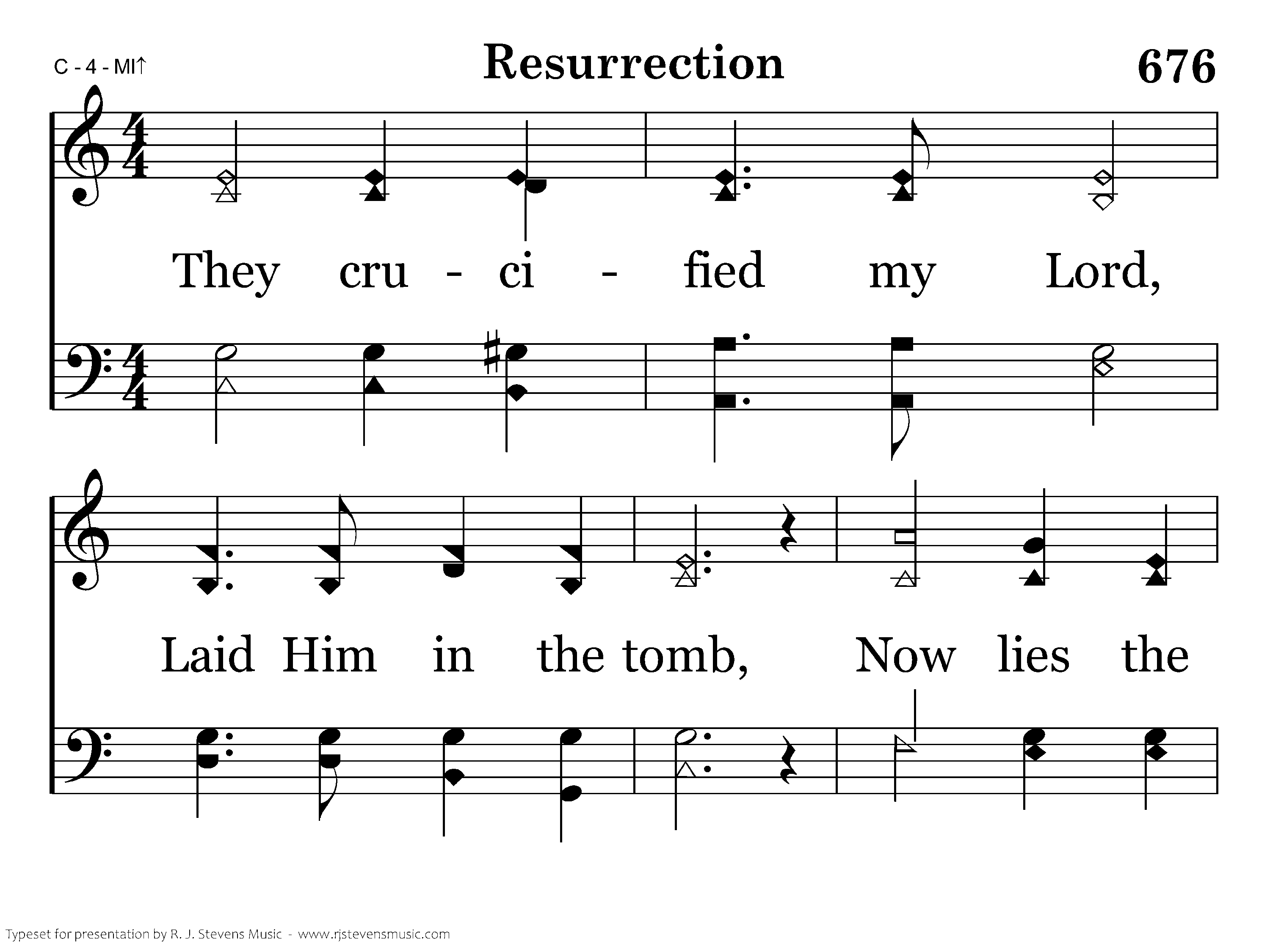 They crucified my Lord, Laid Him in the tomb, Now lies the Son of God in death's sable gloom. The Man of grief and toil There in silence lies; Death has within its coil God of earth and skies. But, behold, there was an earthquake, For from heav'n there came an angel, With a countenance like lightning, And a raiment white as snow. When at dawn came Mary Magdalene, "Twas the angel's voice which said: Lo! He is not here, but risen!" Christ is risen from the dead. He who for the world's salvation bled, Now is risen, risen from the dead, Glory, honor we will ever sing, Praise to our risen King. Hallelujah sing, with hearts to heav'n and voices raise, Ever shout, ye ransomed ones, for you His blood was shed; Sing a hymn of gladness , sing to God a hymn of praise, Christ the Lord is ris'n indeed is risen from the dead.