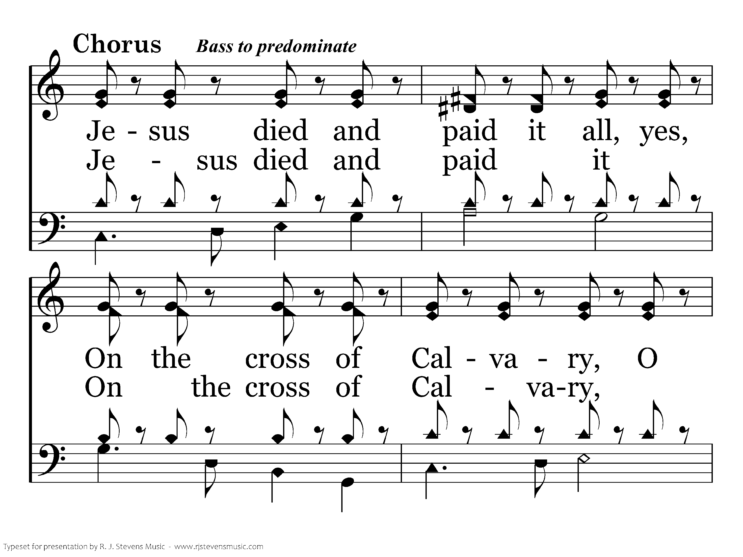 Jesus died and paid it On the cross of Calvary, And my heart was melted At His dying call, O His heart was broken On the tree for you and me, And the debt is canceled, Jesus paid it all.
