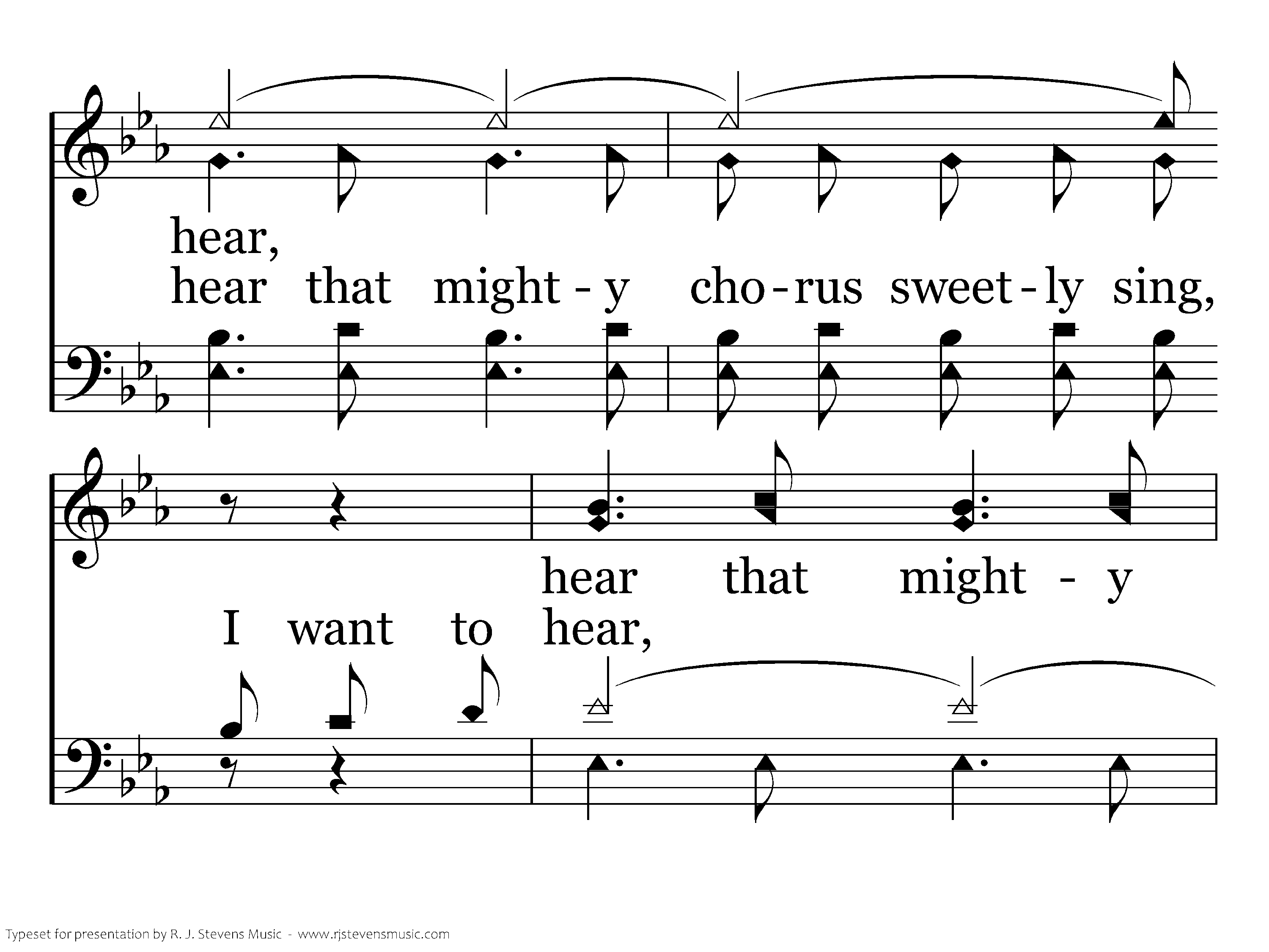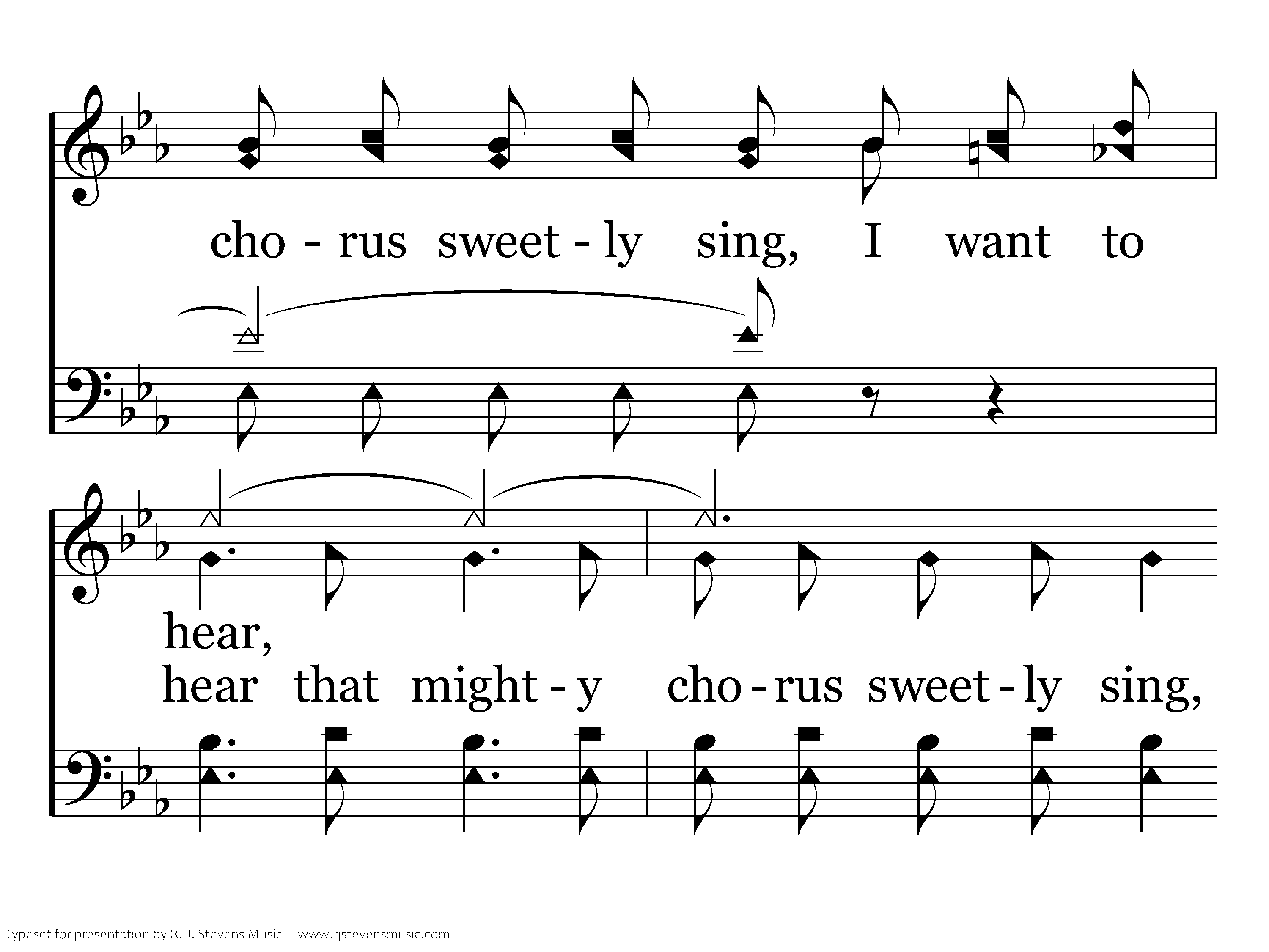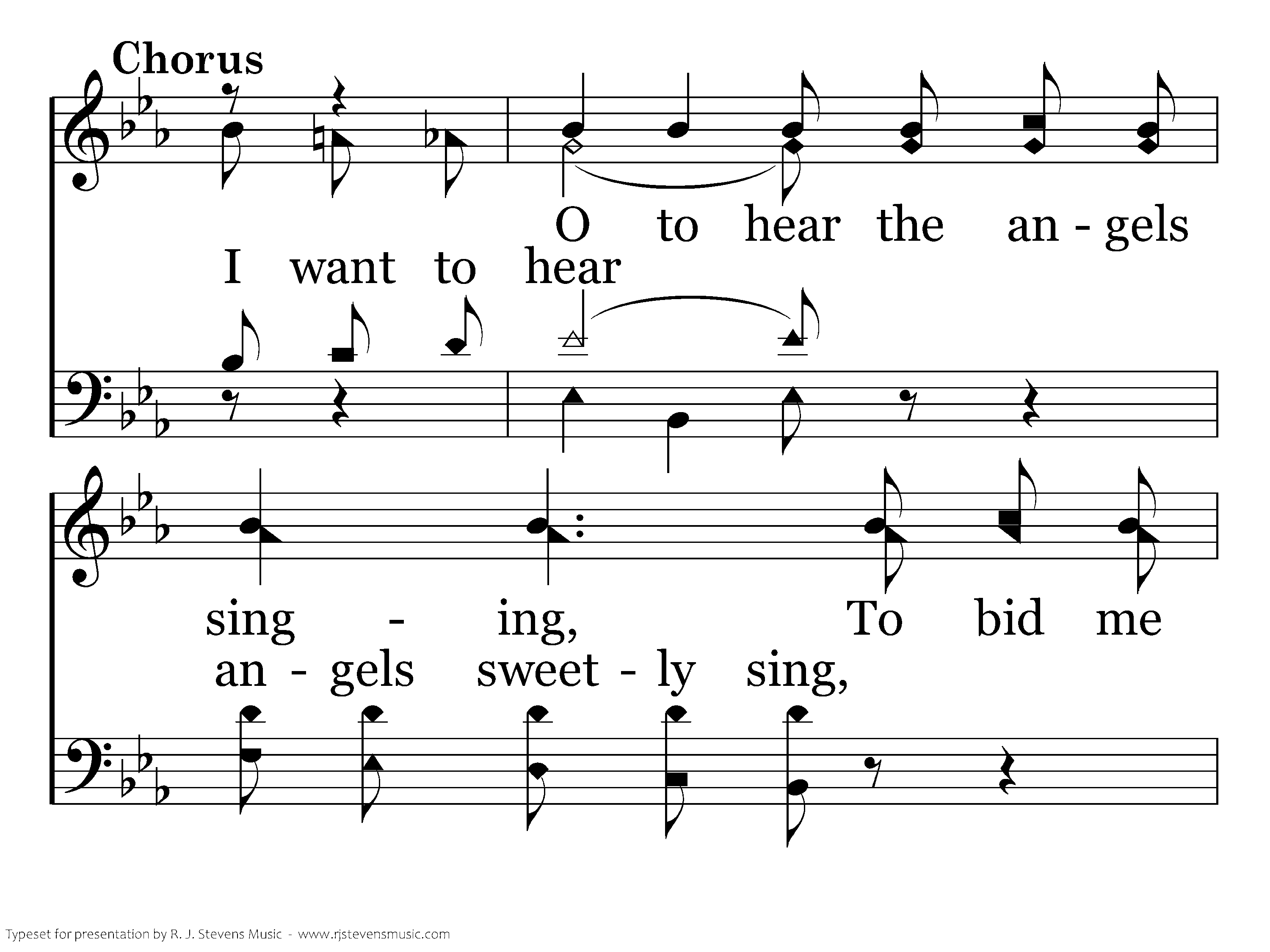 I want to hear angels singing, To bid me welcome to mansions bright and fair; I want to hear the glad harps ringing, with voices blending rich and rare; I want to see the Master bringing, A precious life crown that I may own and wear; I want to hear that mighty chorus sweetly sing, I want to hear that mighty chorus sweetly sing, I want to hear that mighty chorus sweetly sing, To hear it swell and ring.