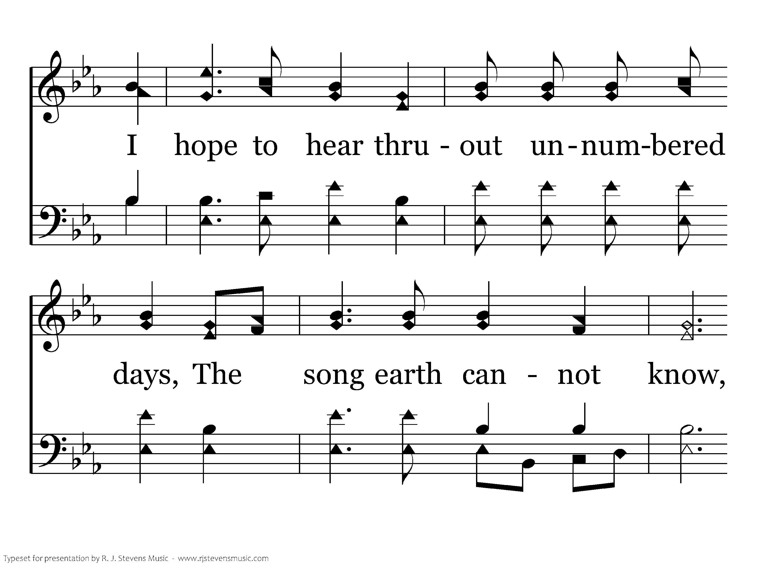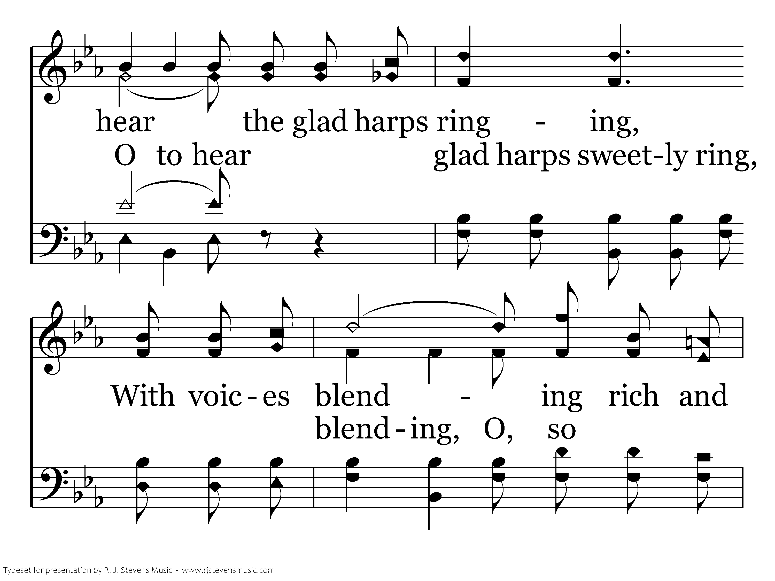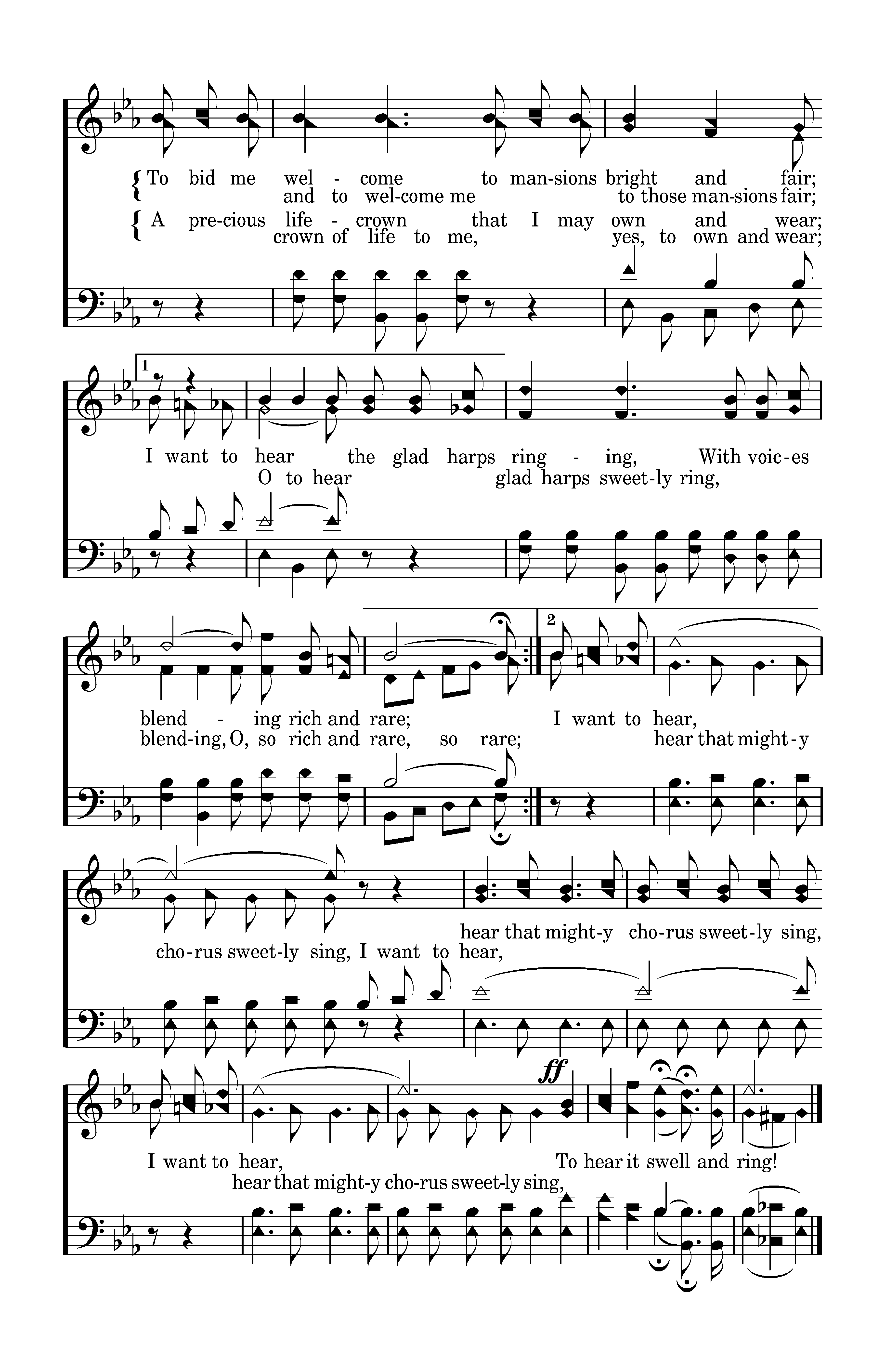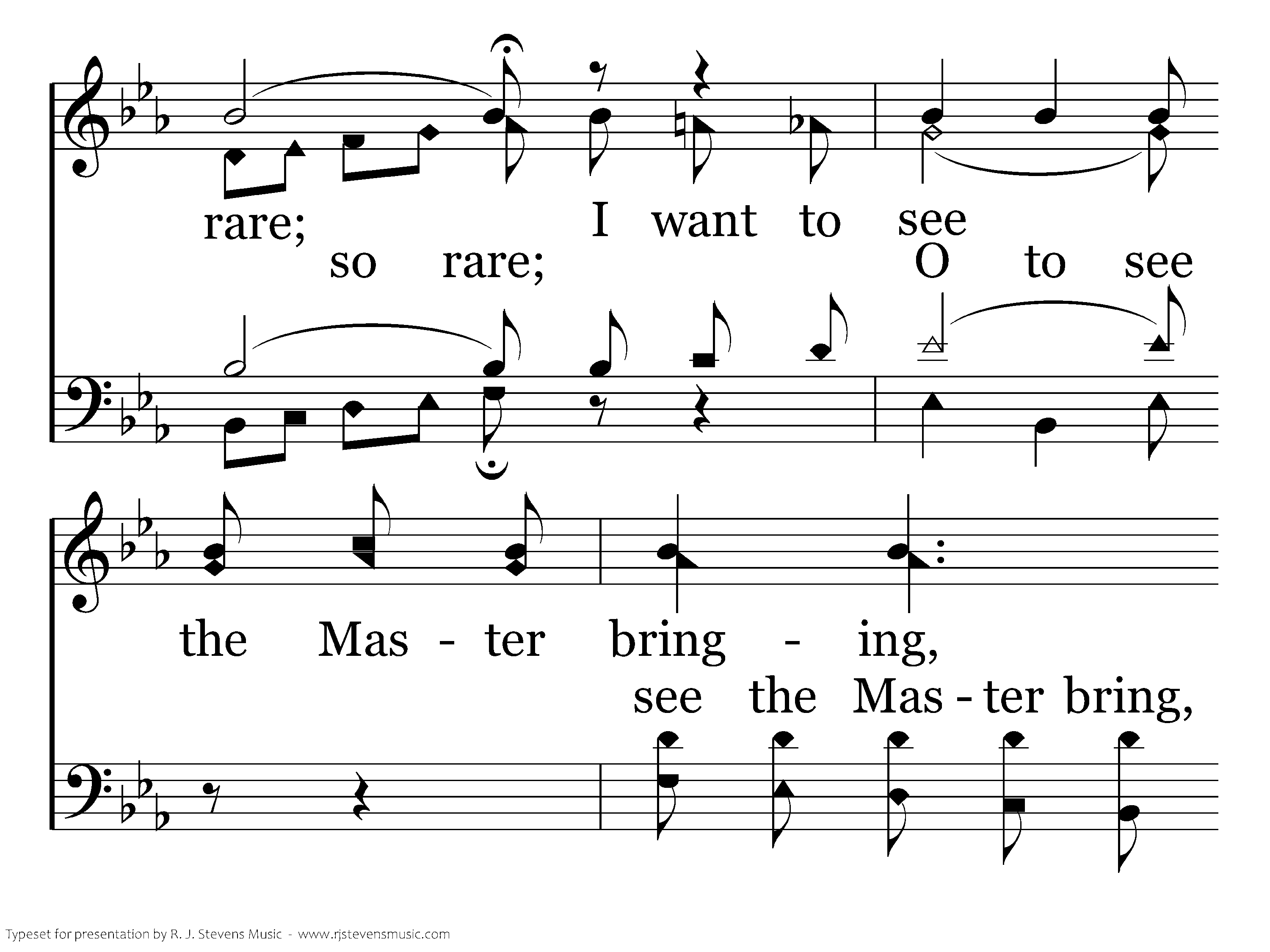 I want to hear angels singing, To bid me welcome to mansions bright and fair; I want to hear the glad harps ringing, with voices blending rich and rare; I want to see the Master bringing, A precious life crown that I may own and wear; I want to hear that mighty chorus sweetly sing, I want to hear that mighty chorus sweetly sing, I want to hear that mighty chorus sweetly sing, To hear it swell and ring.