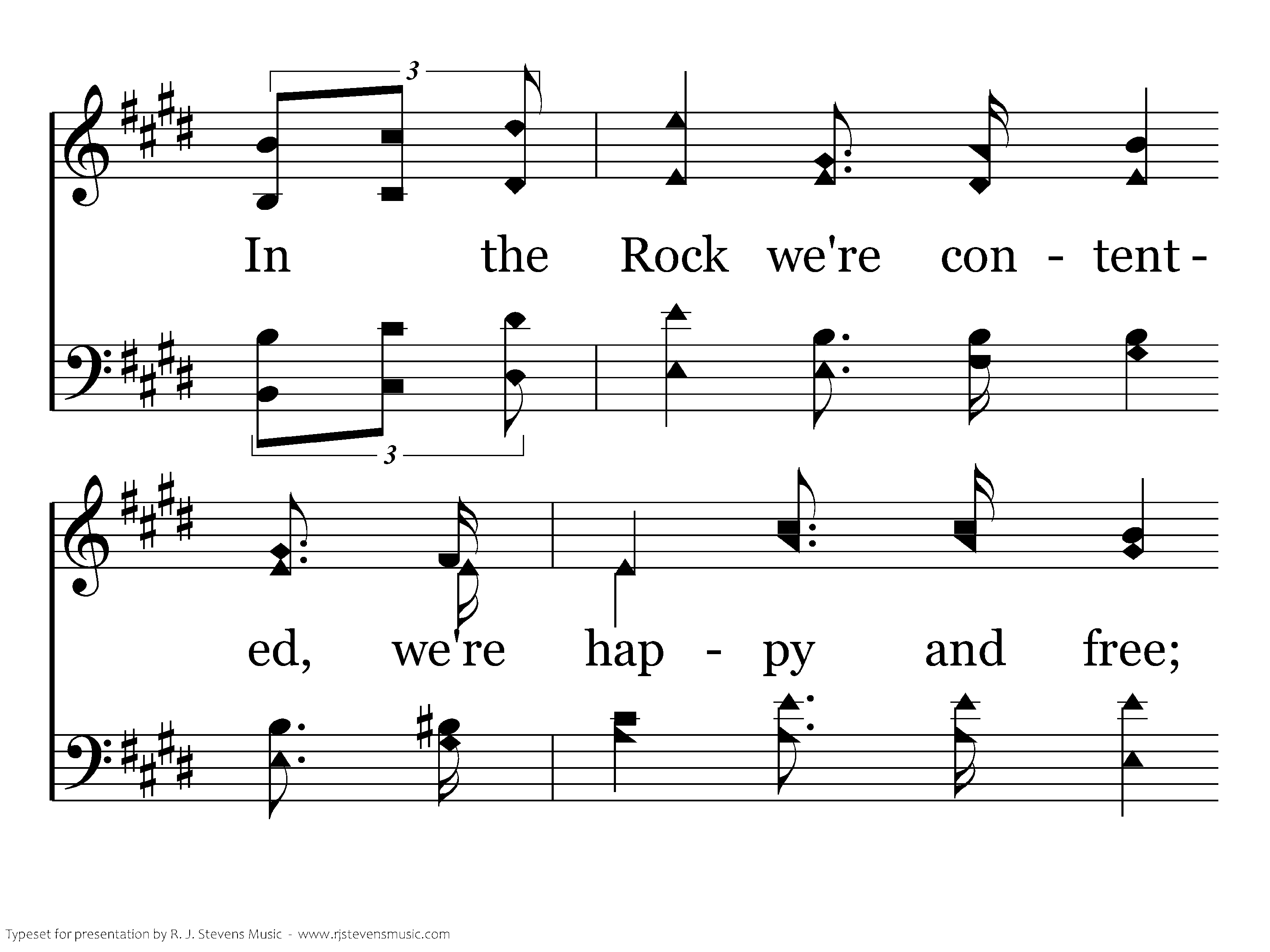O the Rock! 'tis a cleft and a strong, sure defense From the dark gath'ring tempest so threat'ning and dense; In the Rock we are safe, we will suffer no fear, But in peace that is changeless, we rest sweetly here.