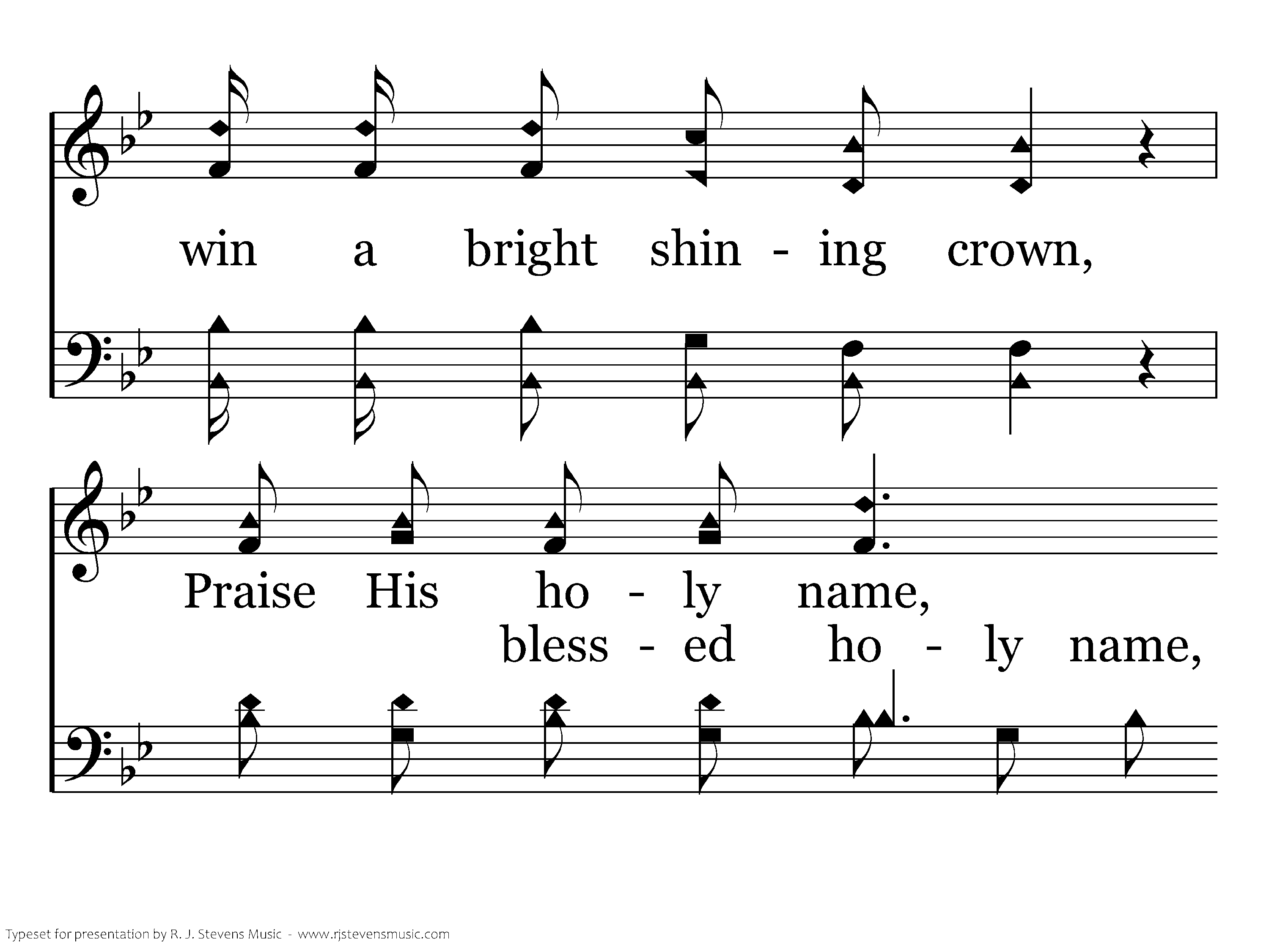 Jesus gave His life a ransom yonder on Calvary, On Mount Calvary, cruel Calvary; Paved the way by blood that we might win a bright shining crown, Praise His holy name, salvation has been bro't down, O glory.