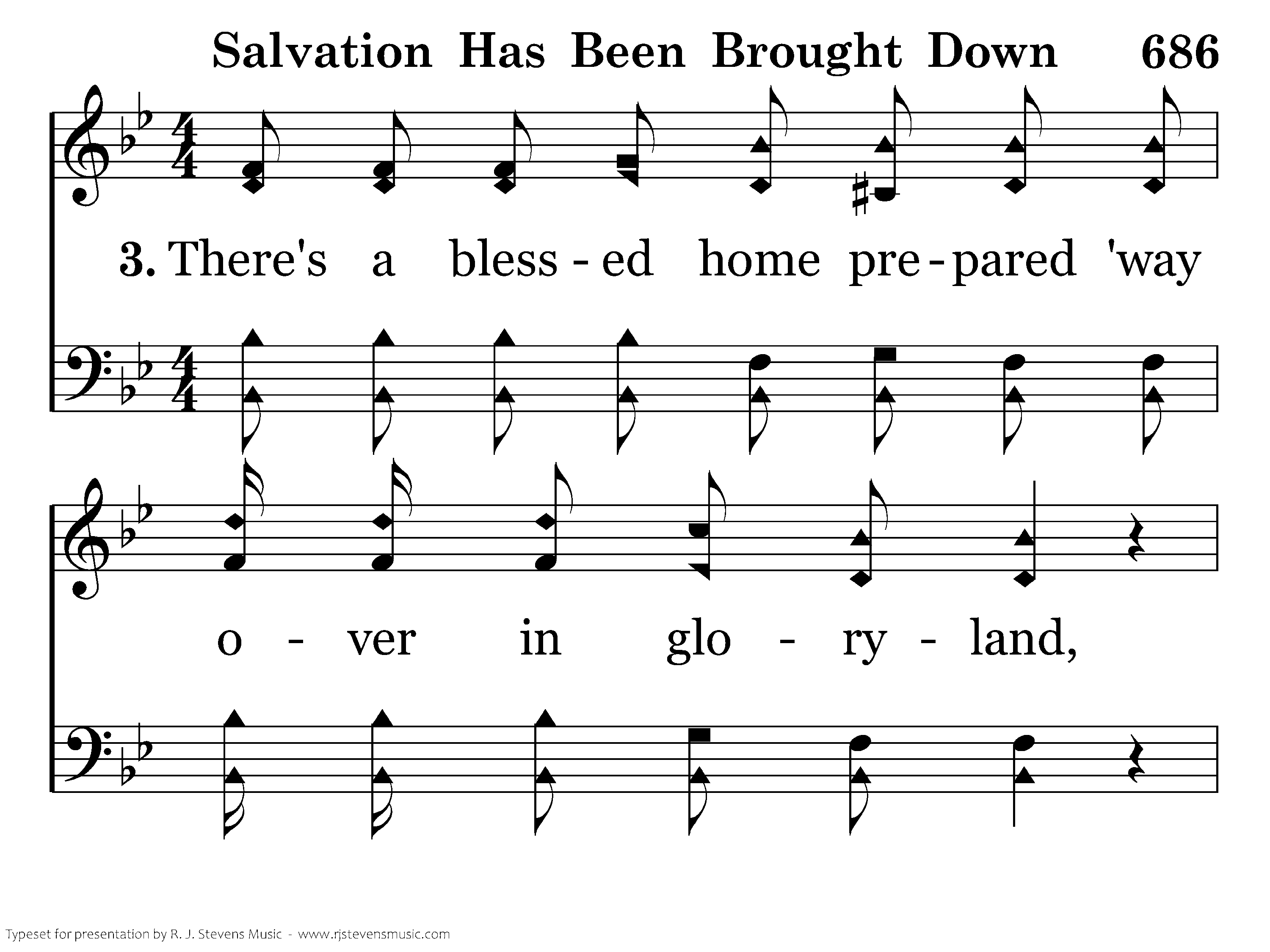 There's a blessed home prepared 'way over in gloryland, In bright gloryland, blessed gloryland; I have trusted in His love and now I am heaven bound, Praise His holy name, salvation has been bro't down, O glory.