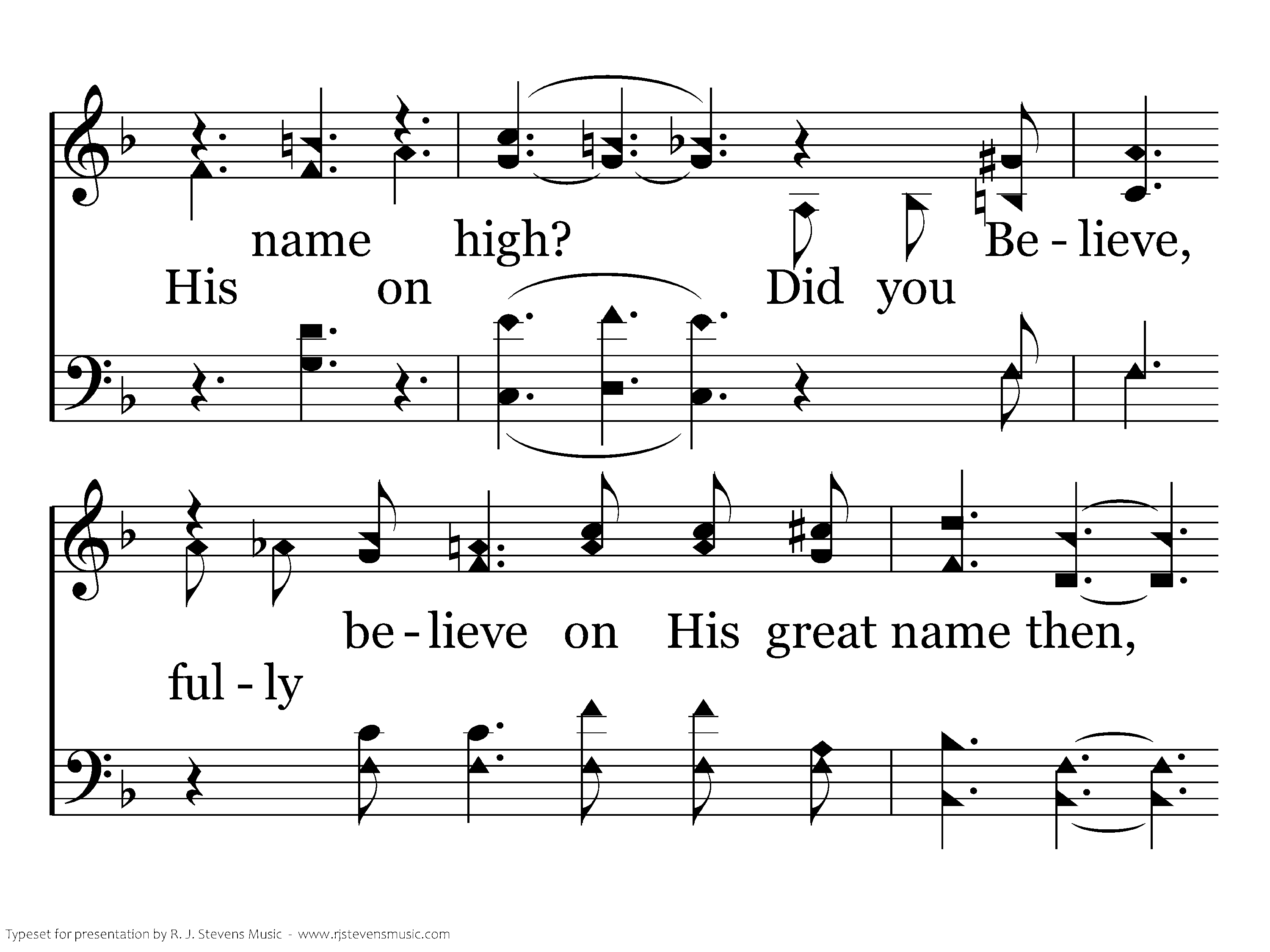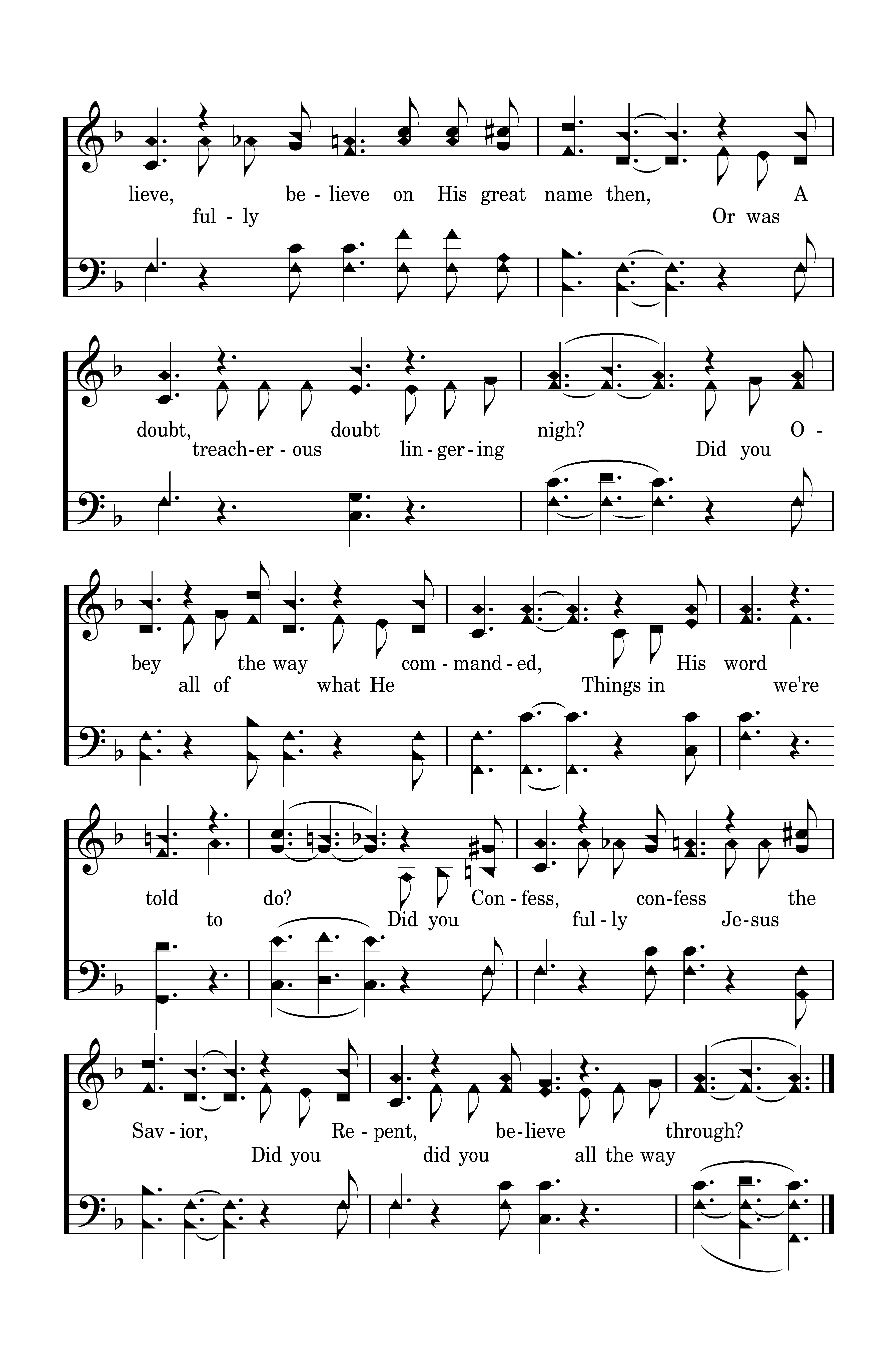 Did you repent, fully repent of your past sins, friend, When you Confessed His name on high? Did you believe, fully believe on His great name then, Or was A doubt, treacherous doubt lingering nigh? Did you obey all of the way what He commanded, Things in His word we're told to do? Did you Confess, fully confess Jesus the Savior, Did you repent, did you believe all the way through?