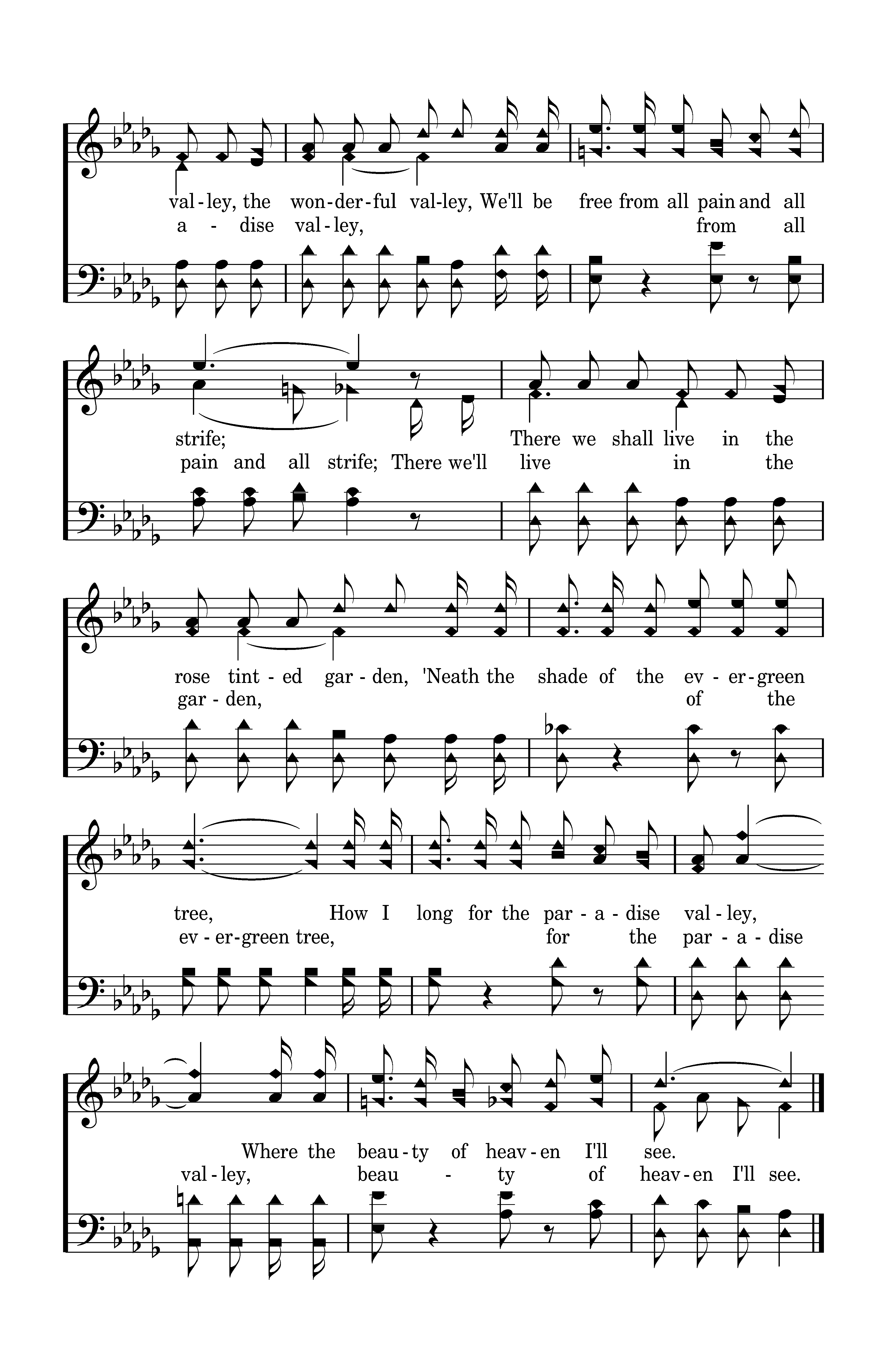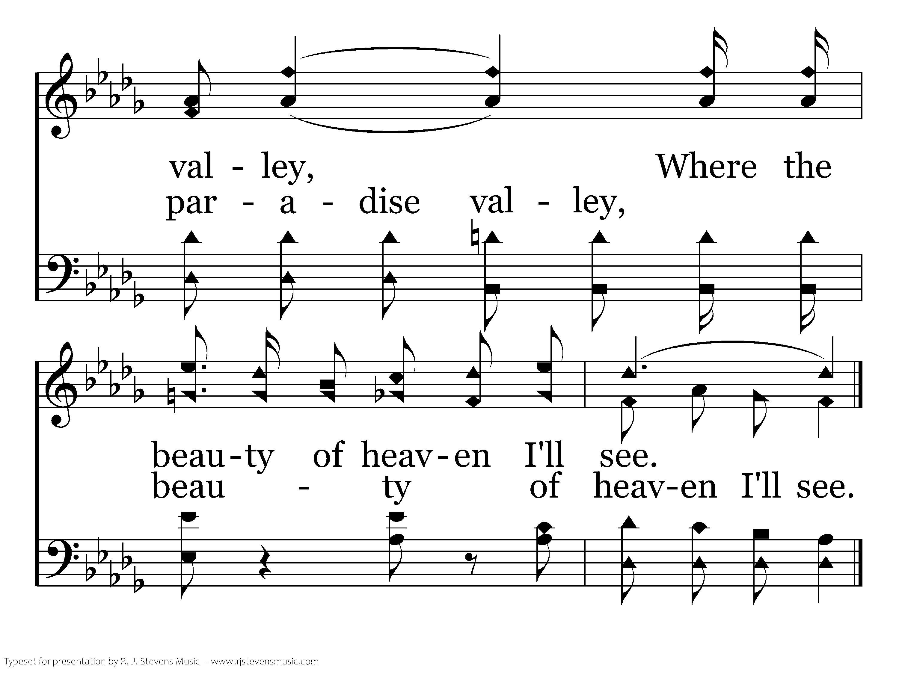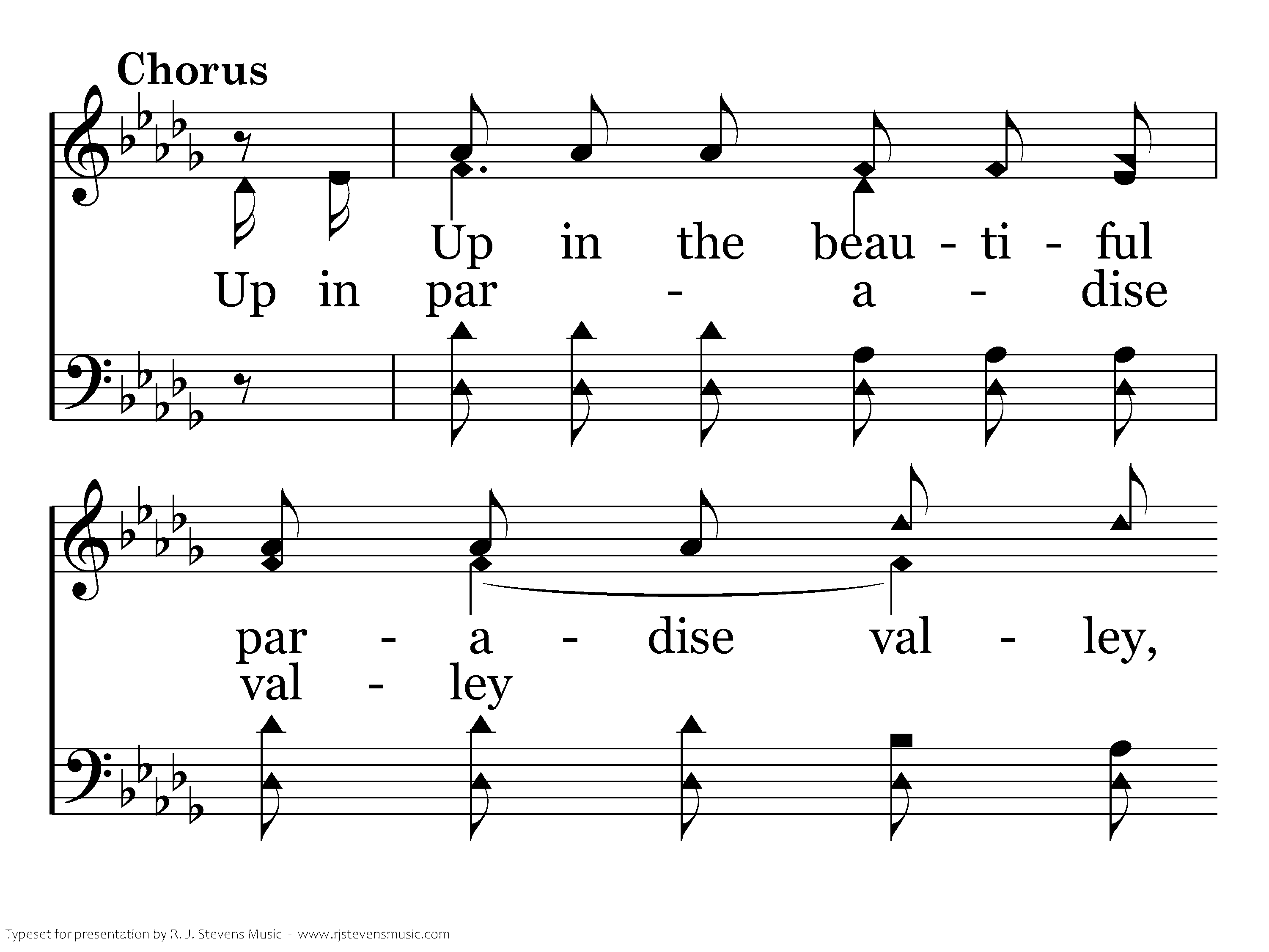 Up in paradise valley By the side of the river of life, Up in paradise valley, We'll be free from all pain and all strife; There we'll live in the garden, 'Neath the shade of the evergreen tree, How I long for the paradise valley, Where the beauty of heaven I'll see.