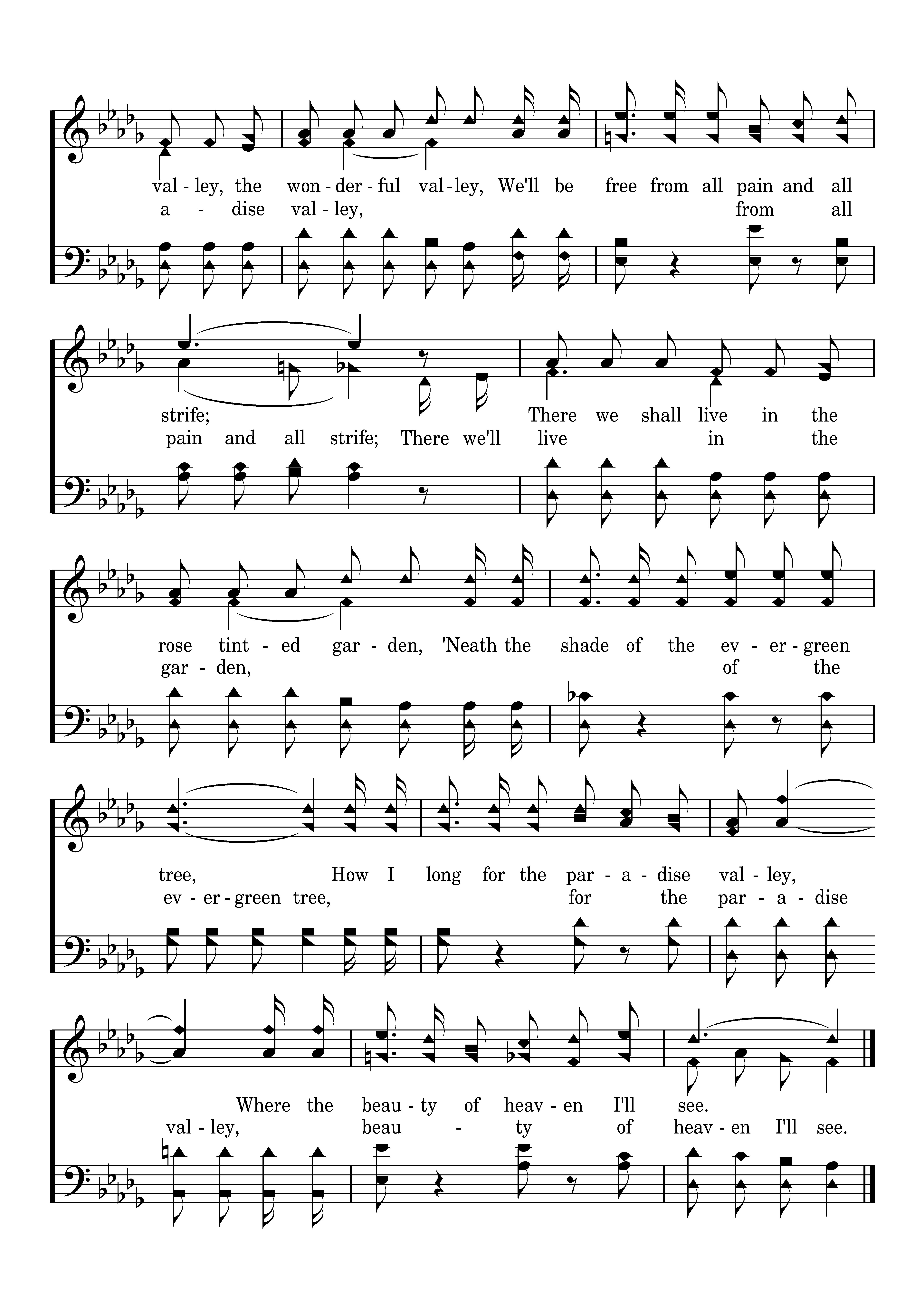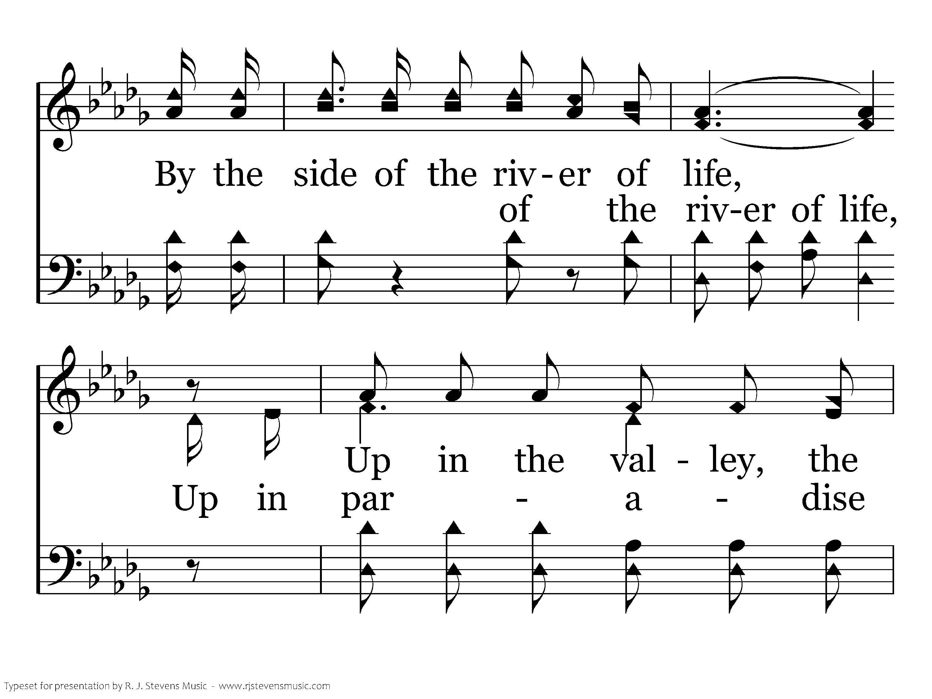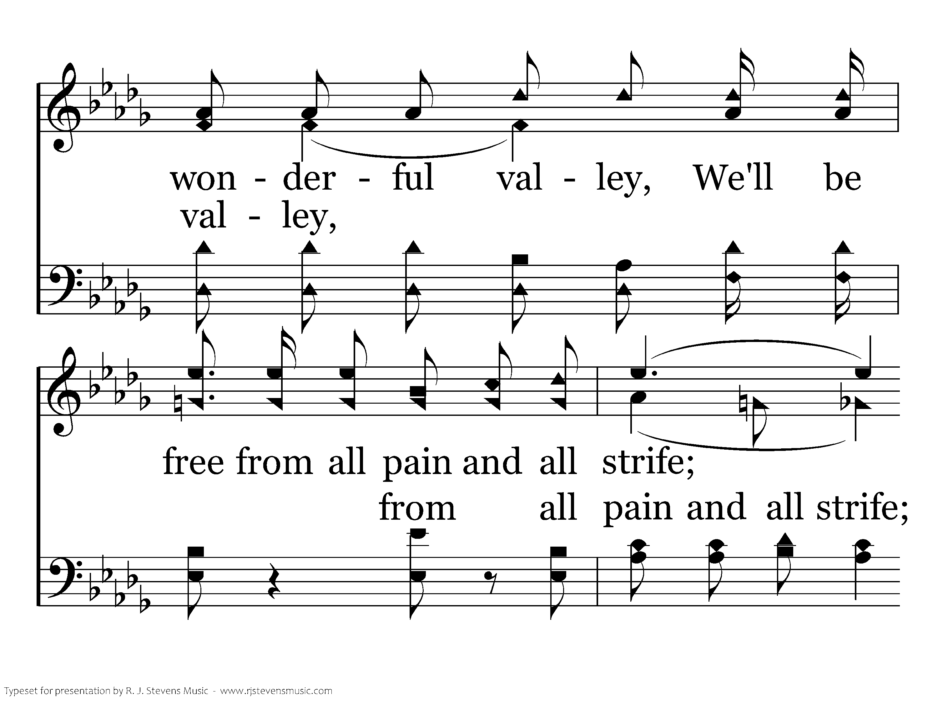Up in paradise valley By the side of the river of life, Up in paradise valley, We'll be free from all pain and all strife; There we'll live in the garden, 'Neath the shade of the evergreen tree, How I long for the paradise valley, Where the beauty of heaven I'll see.