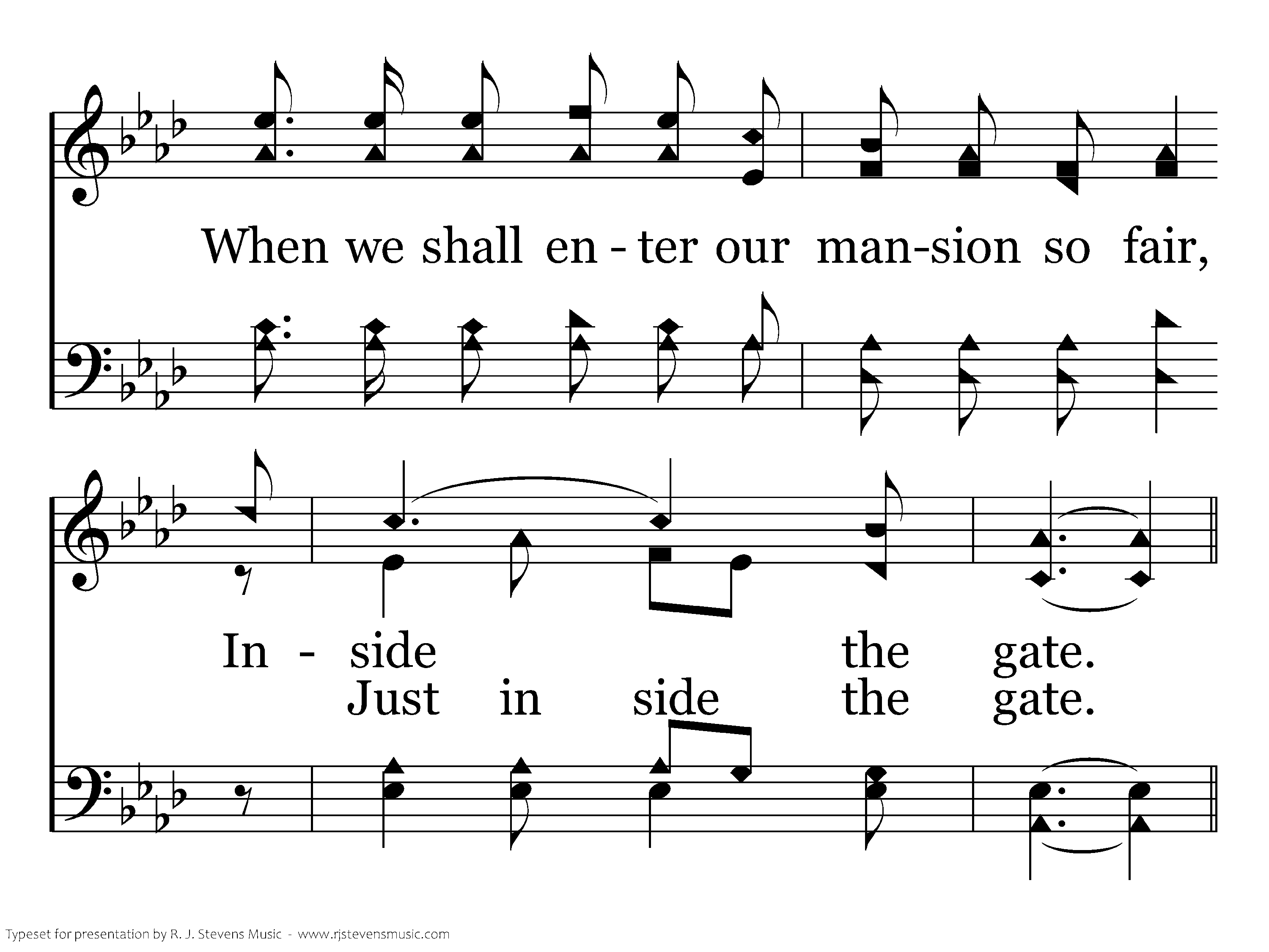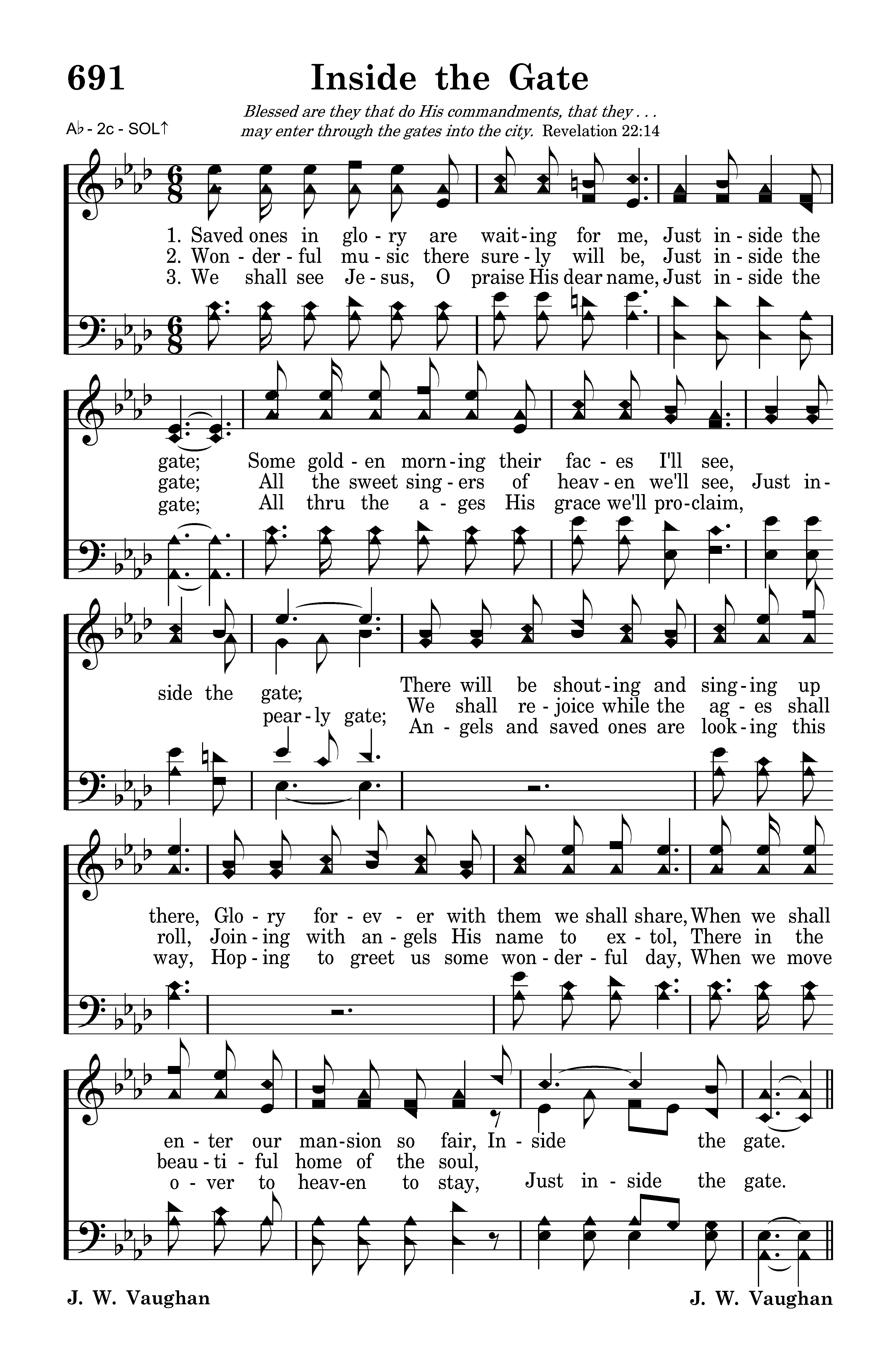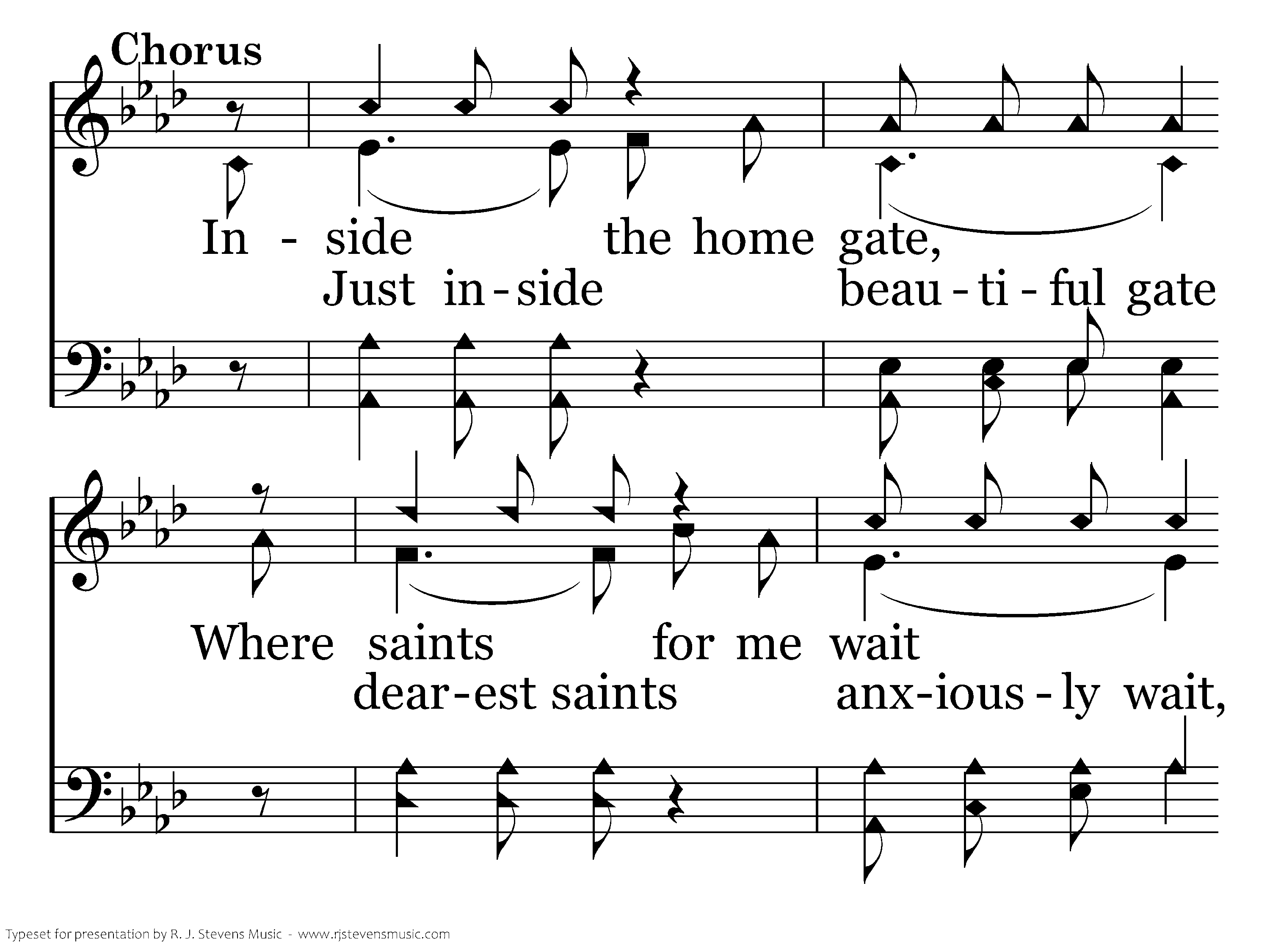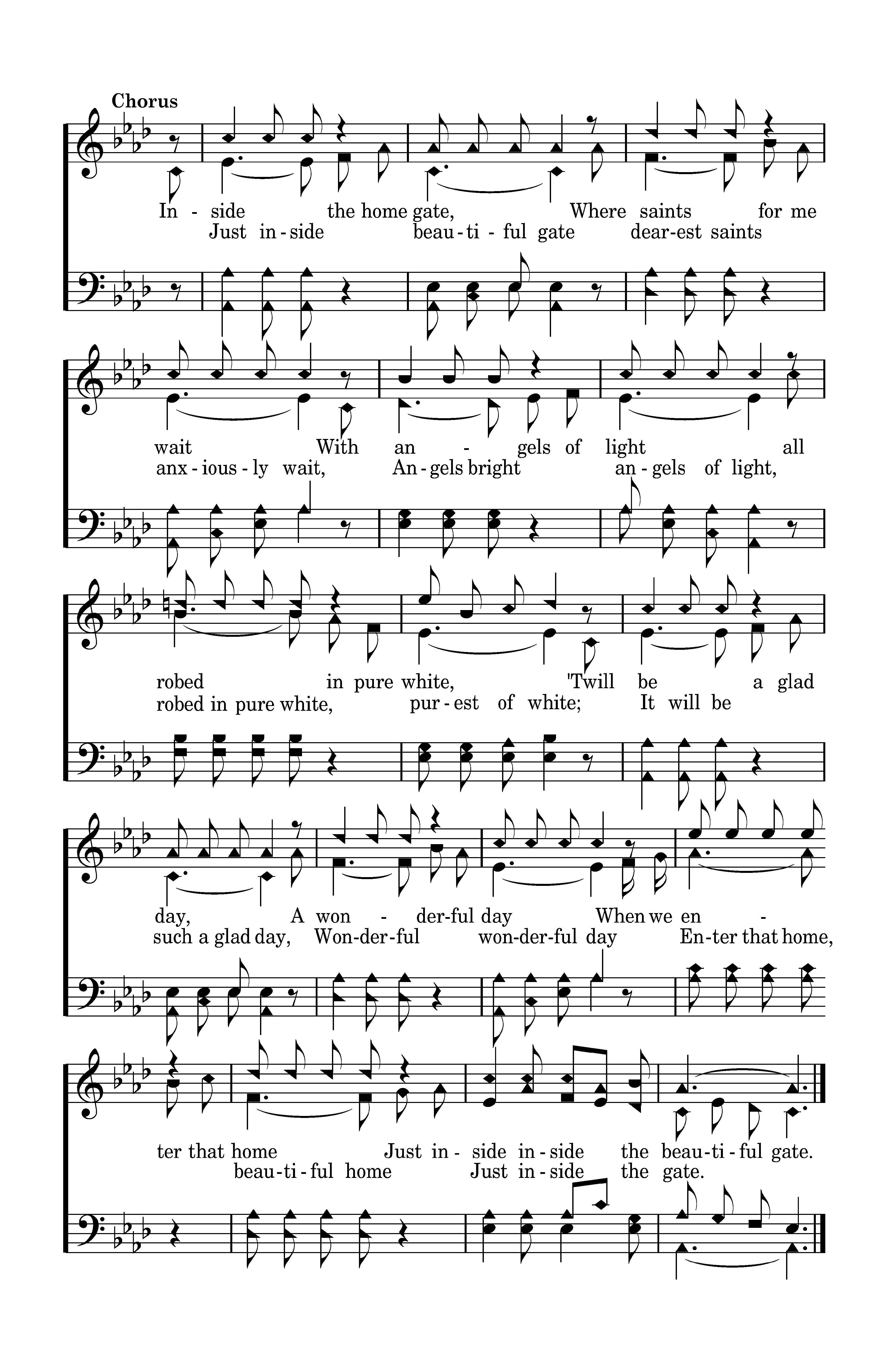Inside the home gate, Where saints for me wait With angels of light all robed in pure white, 'Twill be a glad day, A wonderful day When we enter that home Just inside, inside the gate.