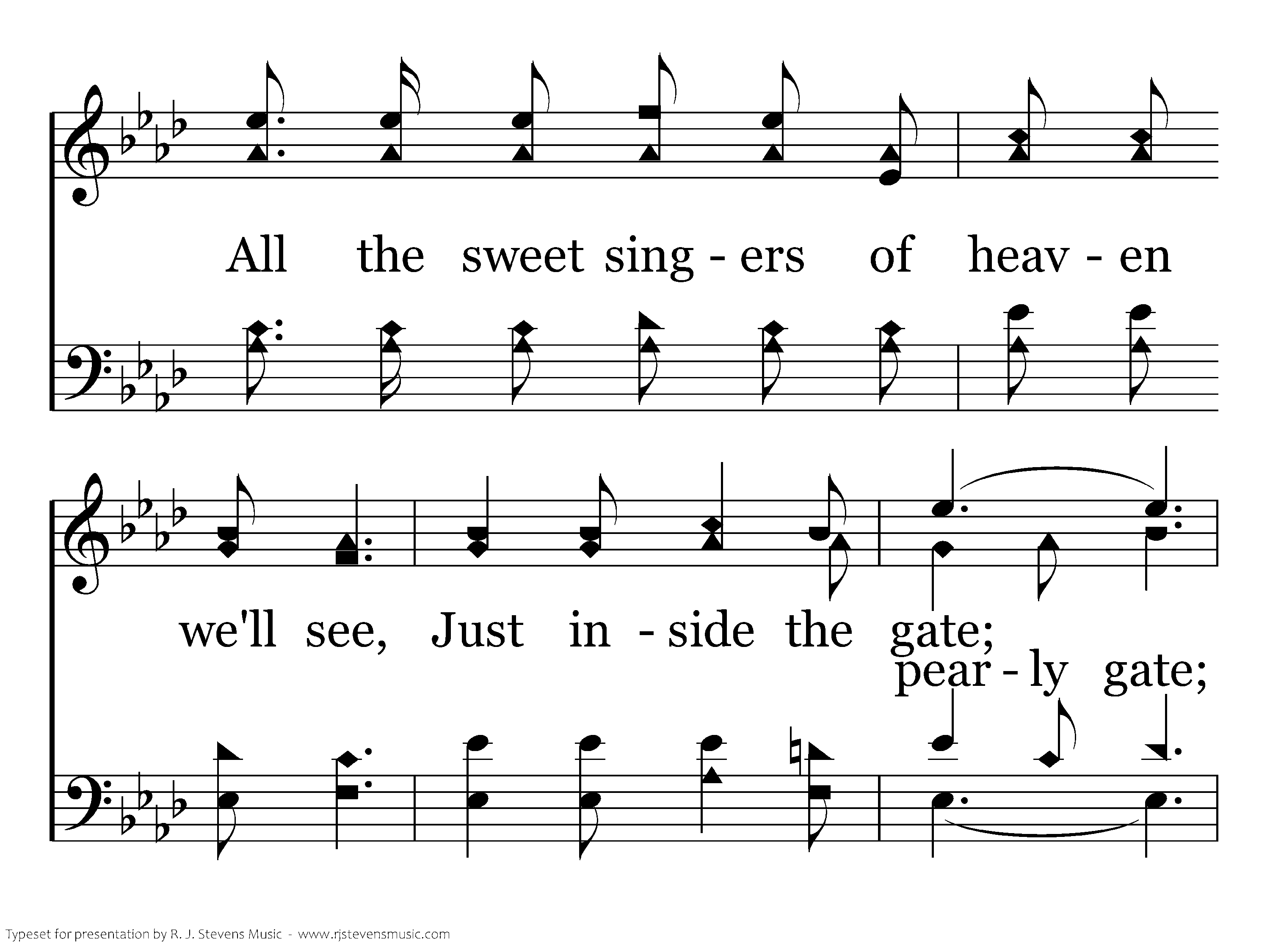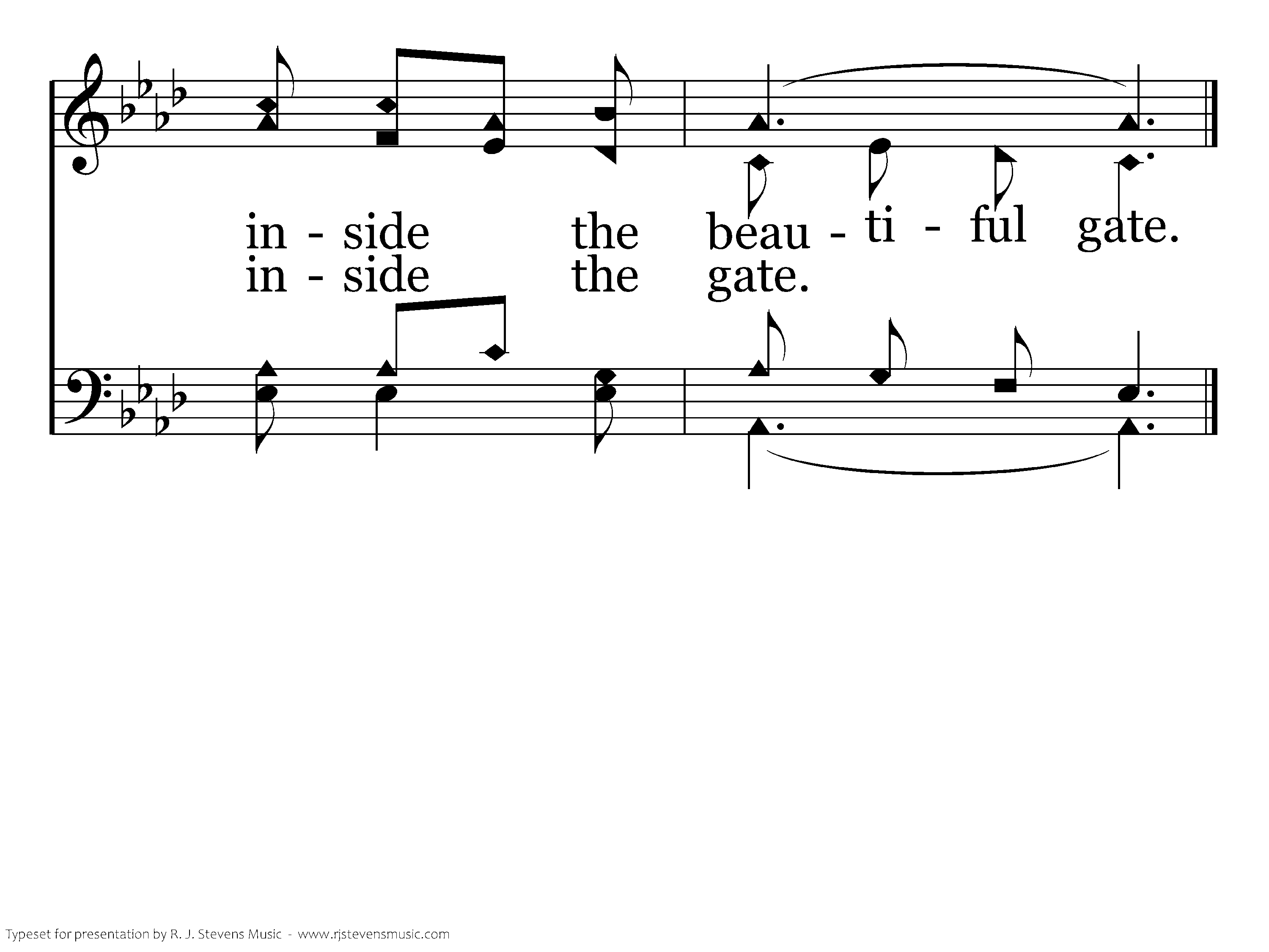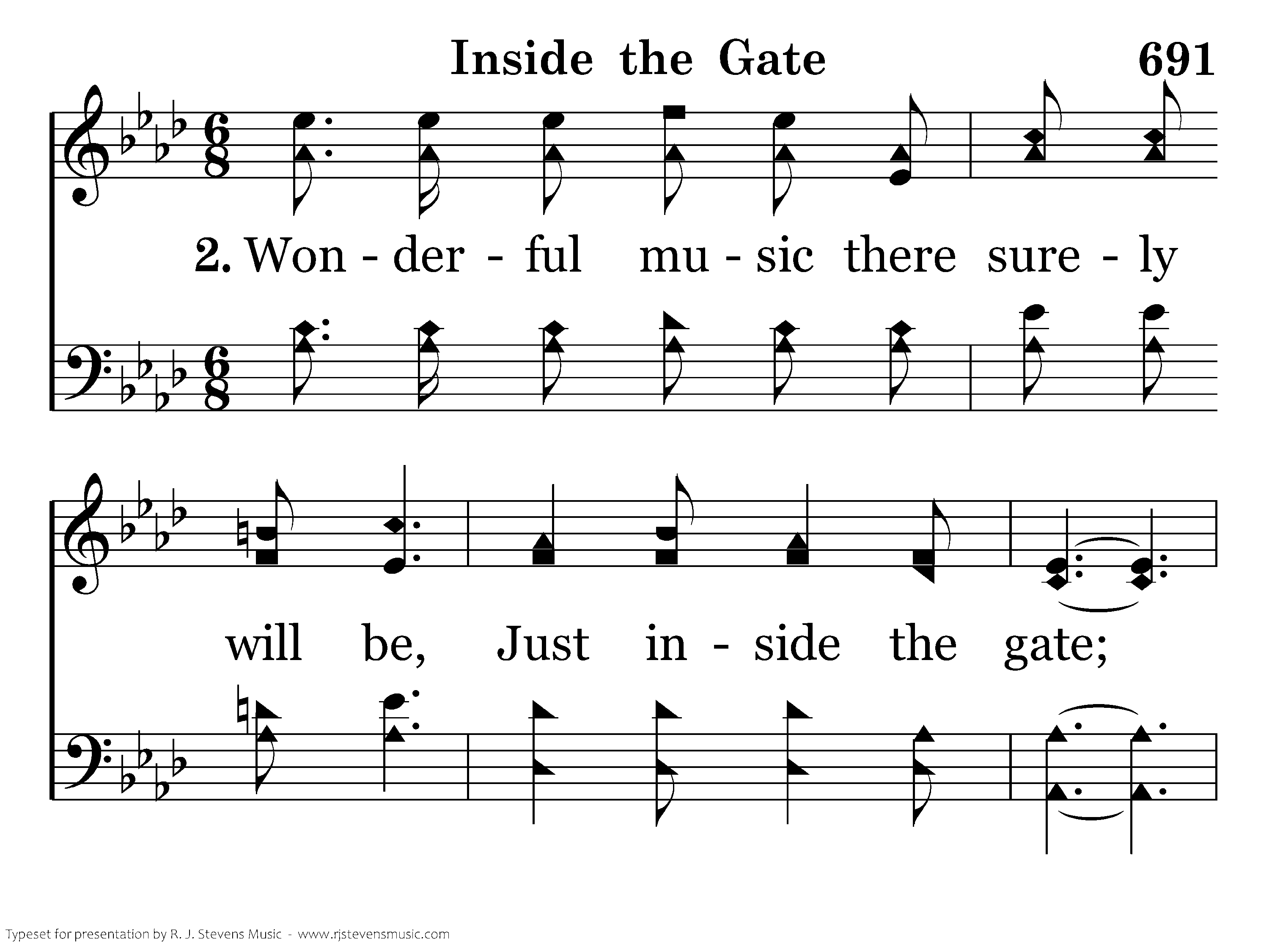Wonderful music there surely will be, Just inside the gate; All the sweet singers of heaven we'll see, Just inside the gate; We shall rejoice while the ages shall roll, Joining with angels His name to extol, There in the beautiful home of the soul, Inside the gate.
