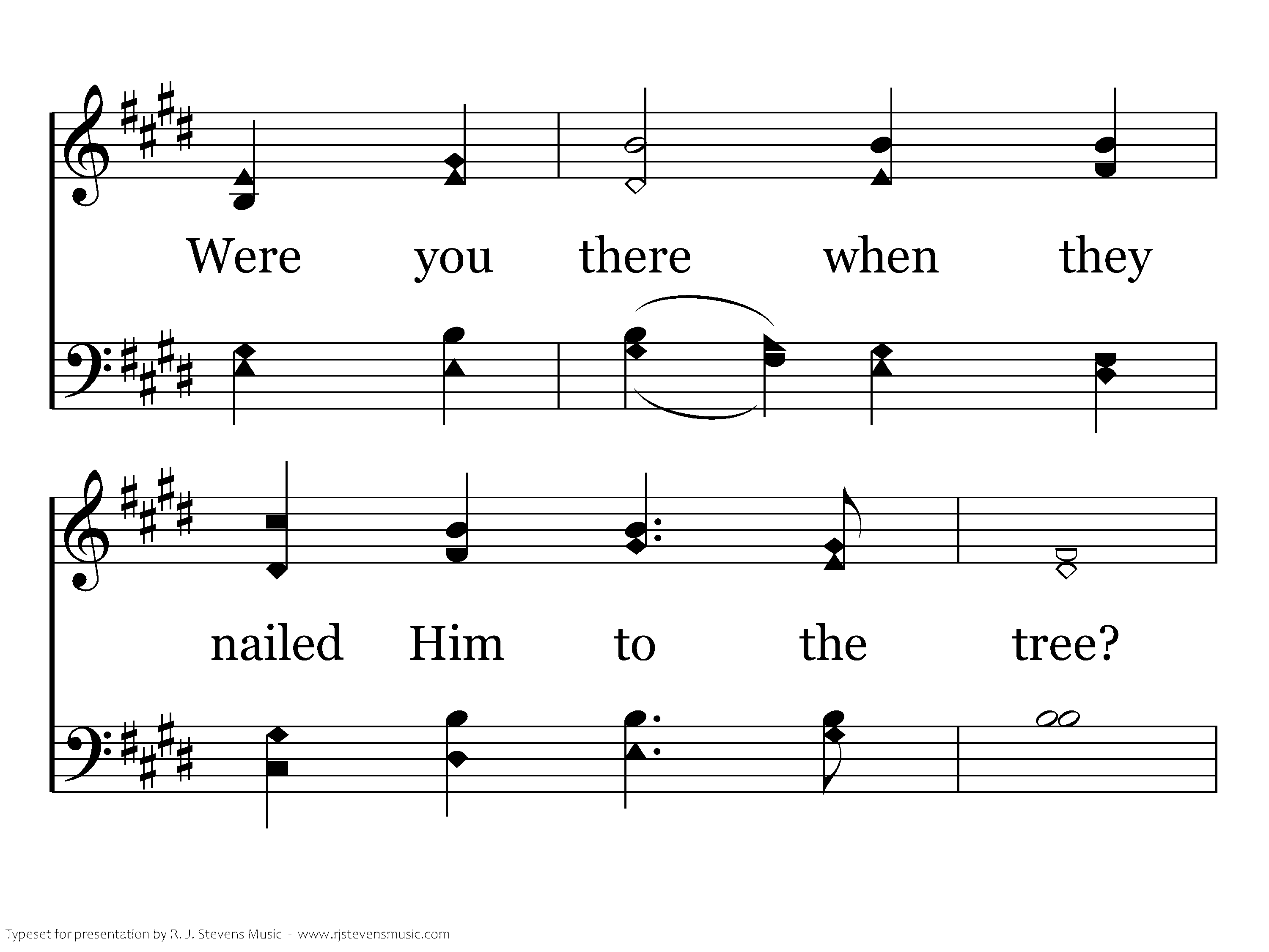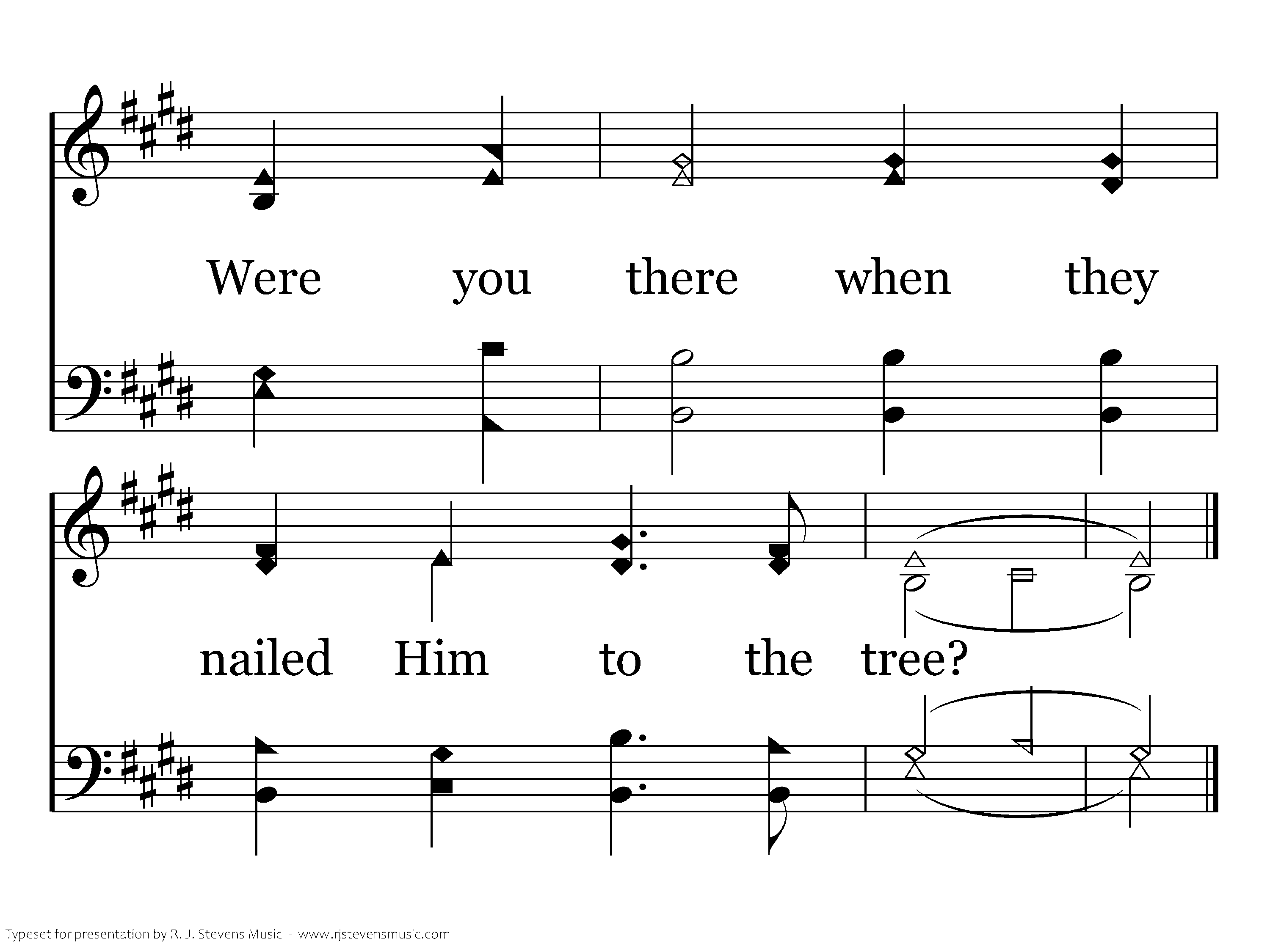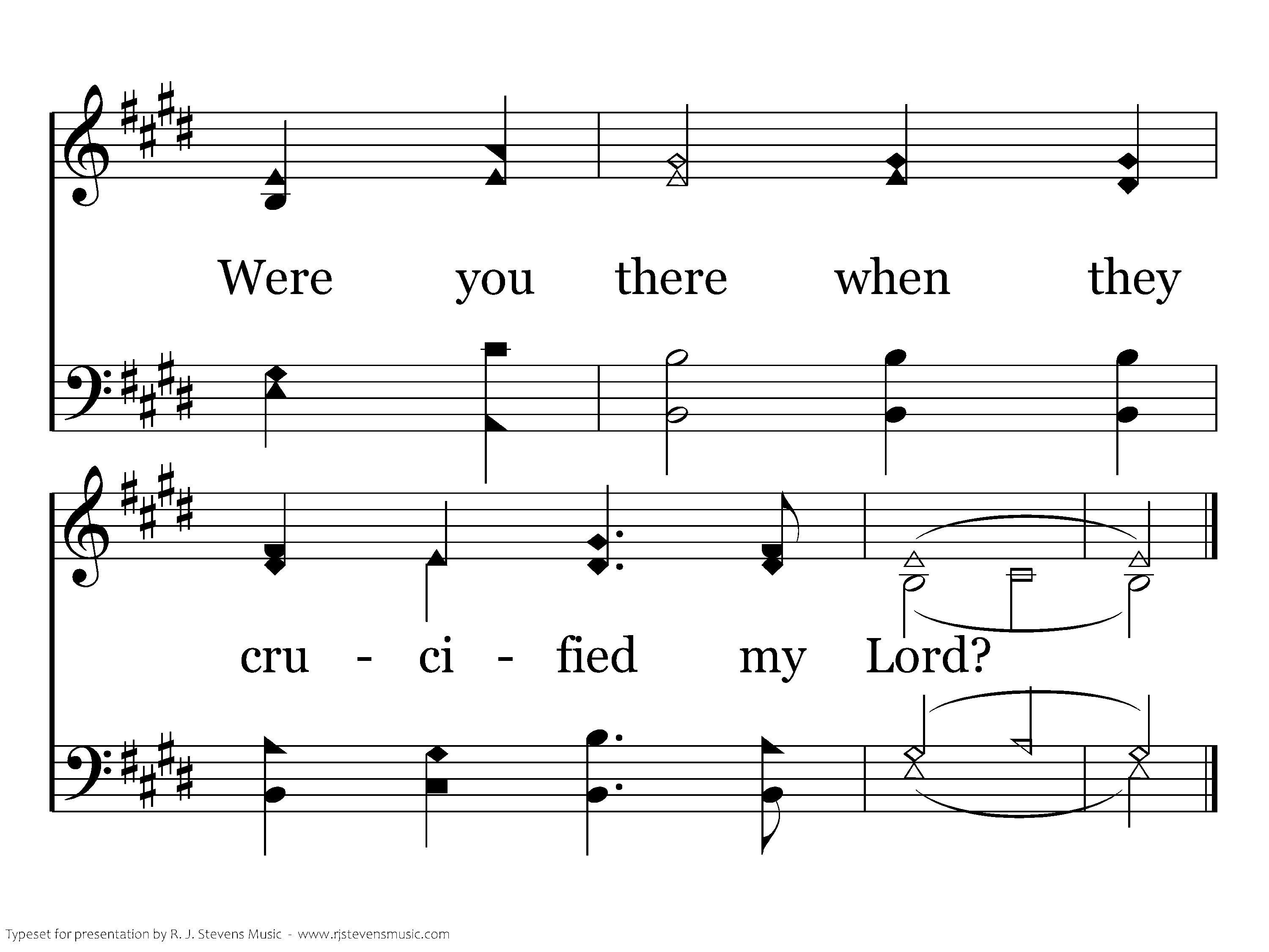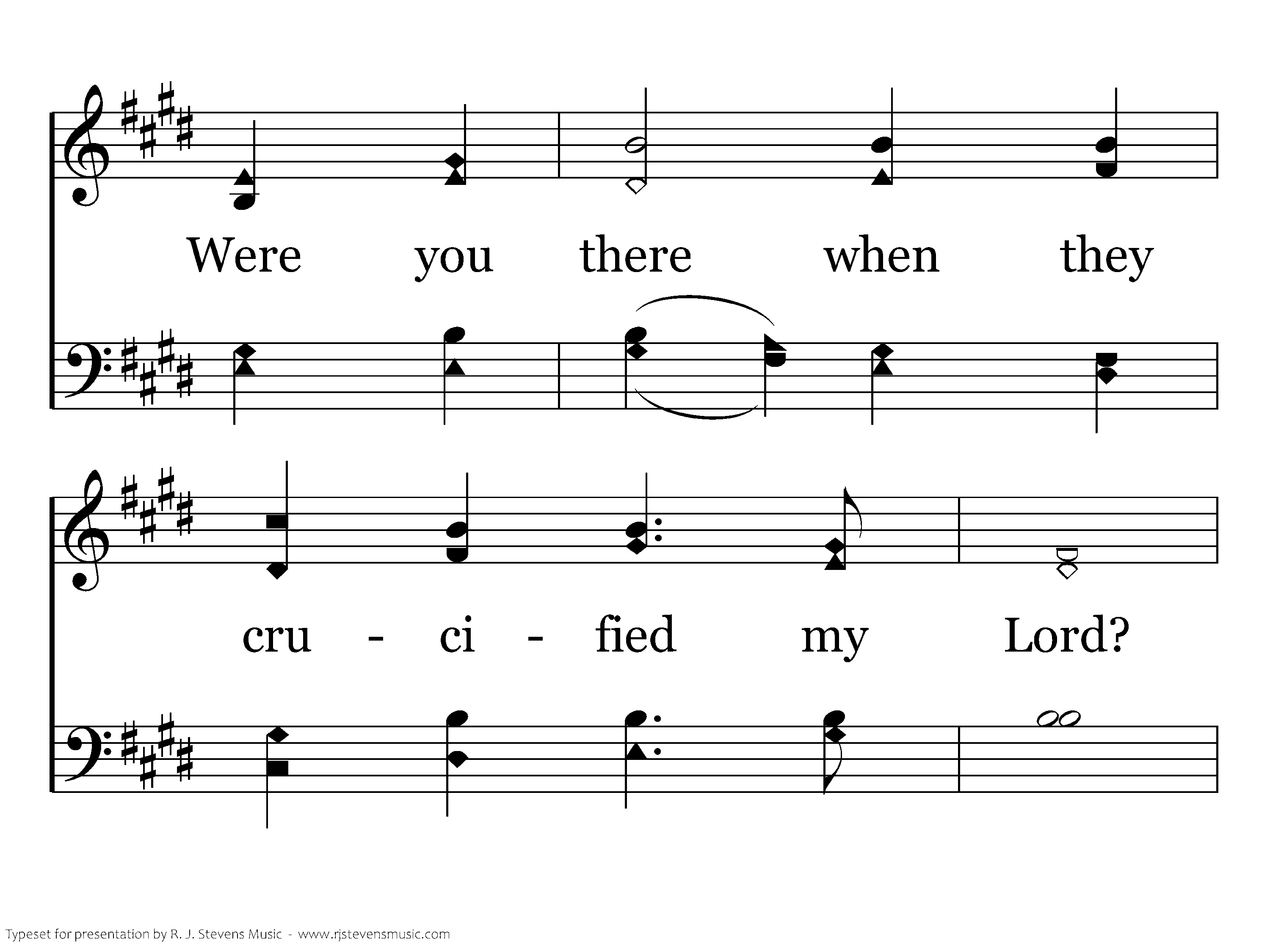 Were you there when they crucified my Lord? Were you there when they crucified my Lord? O! Sometimes it causes me to tremble, tremble, tremble. Were you there when they crucified my Lord?