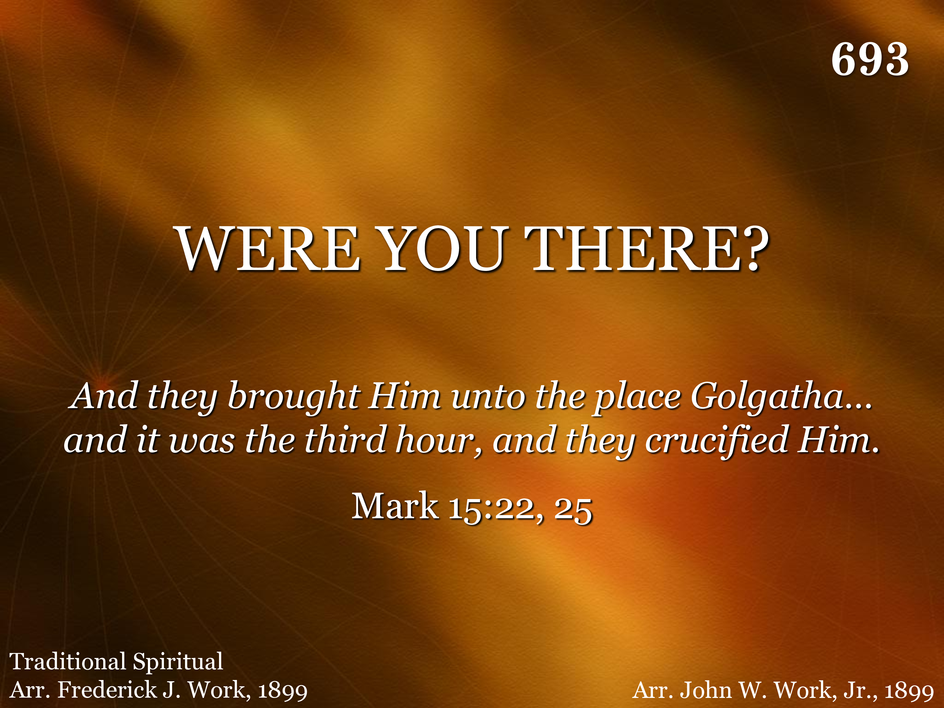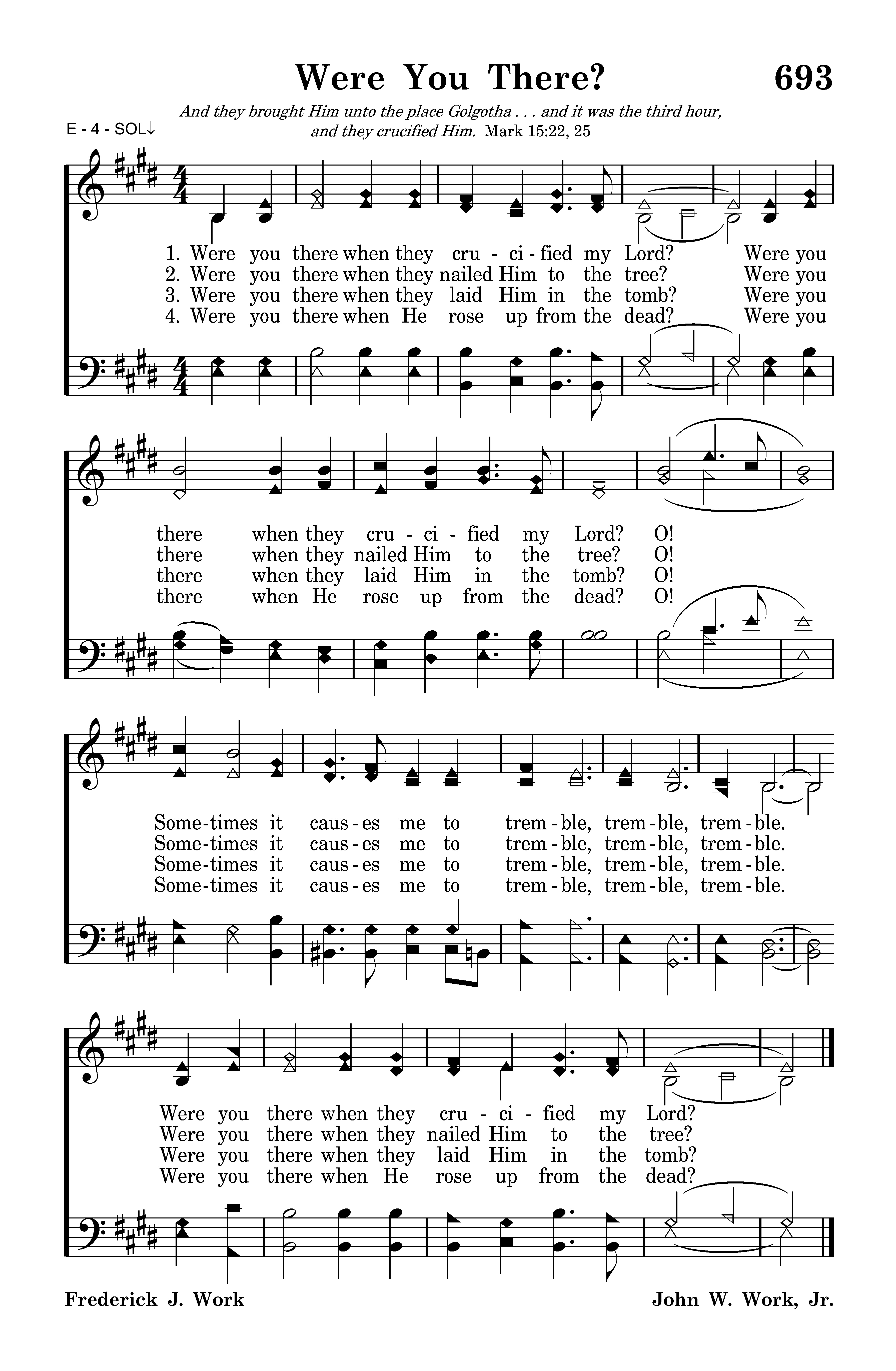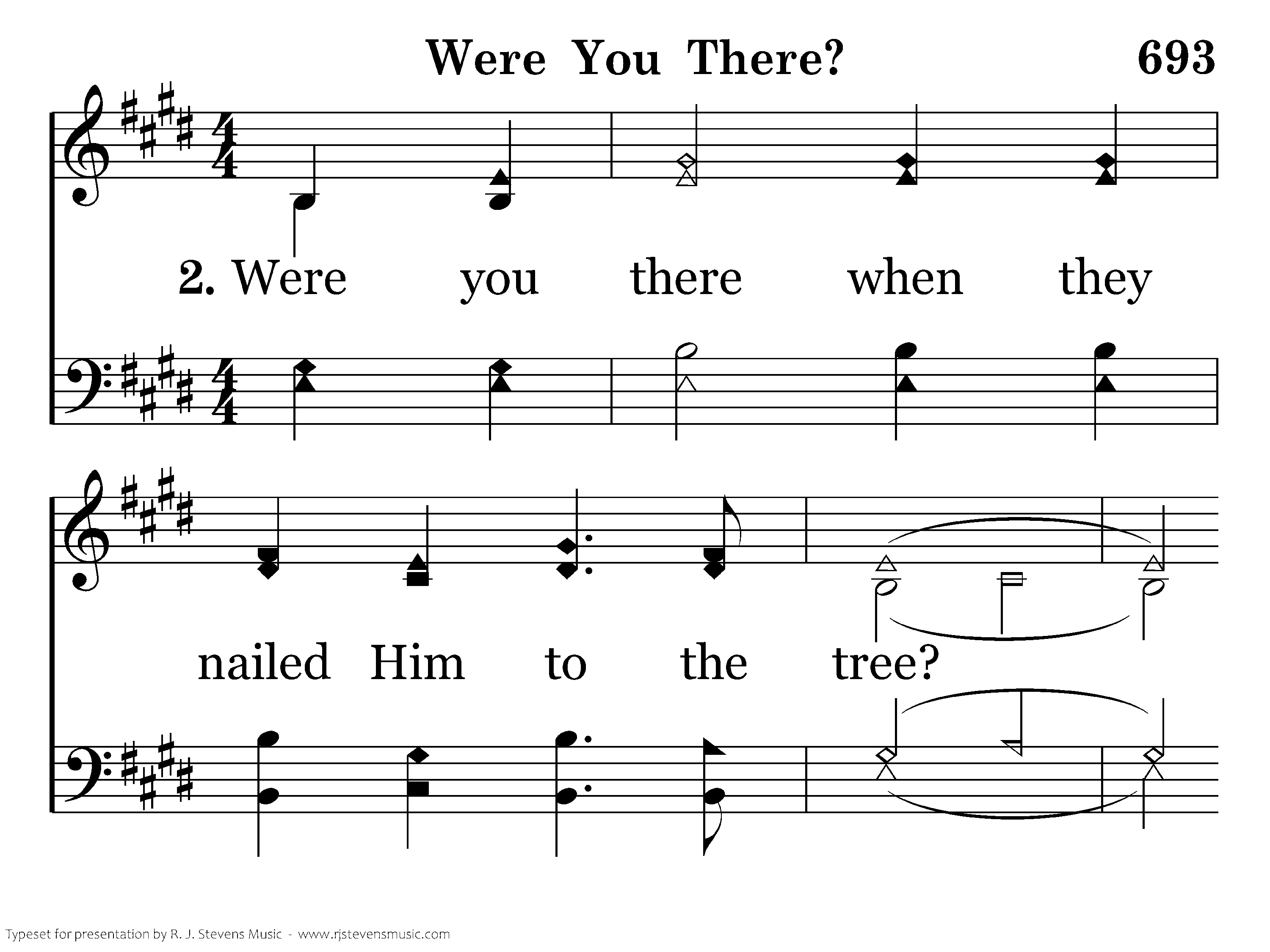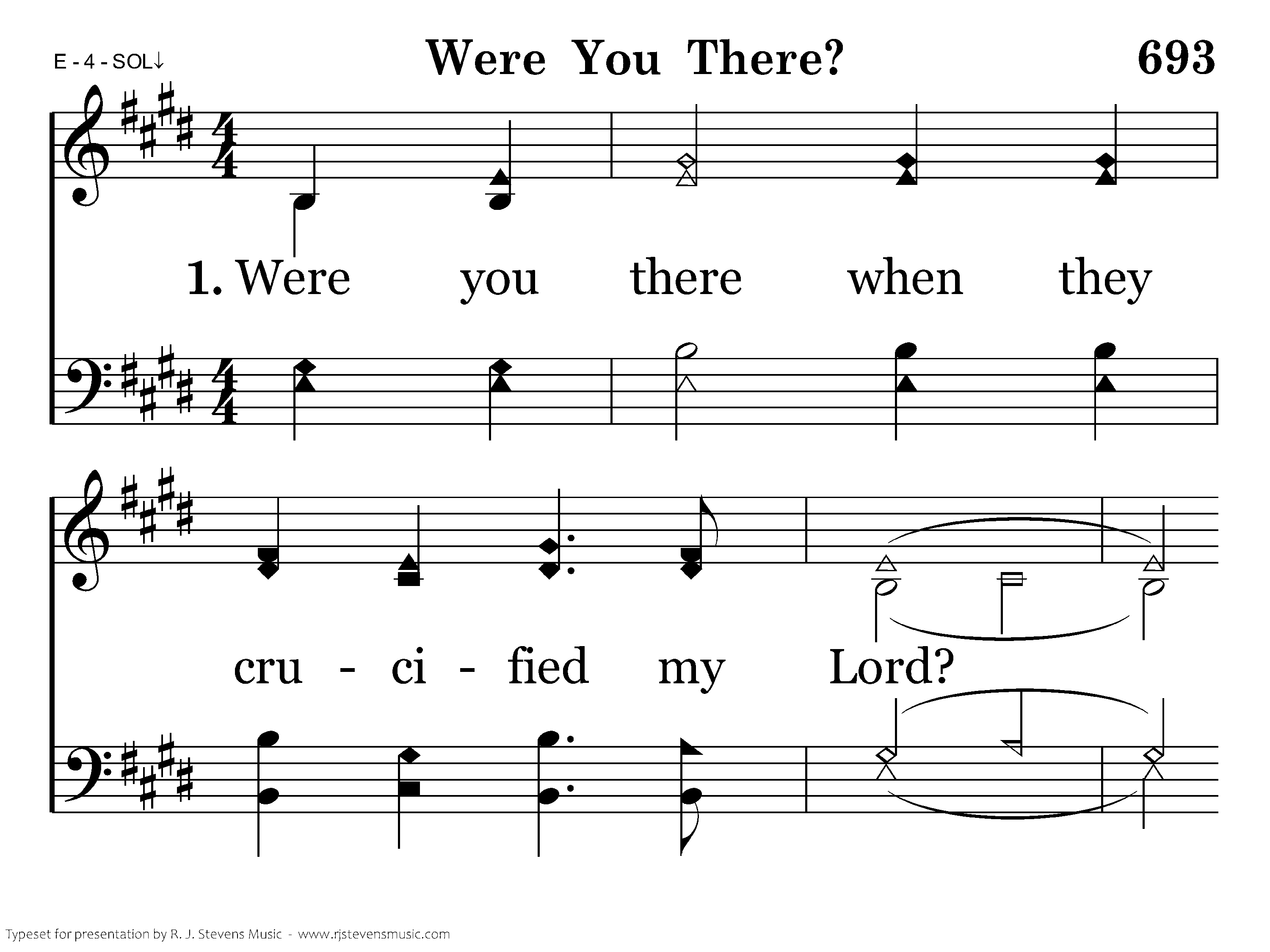 Were you there when they crucified my Lord? Were you there when they crucified my Lord? O! Sometimes it causes me to tremble, tremble, tremble. Were you there when they crucified my Lord?