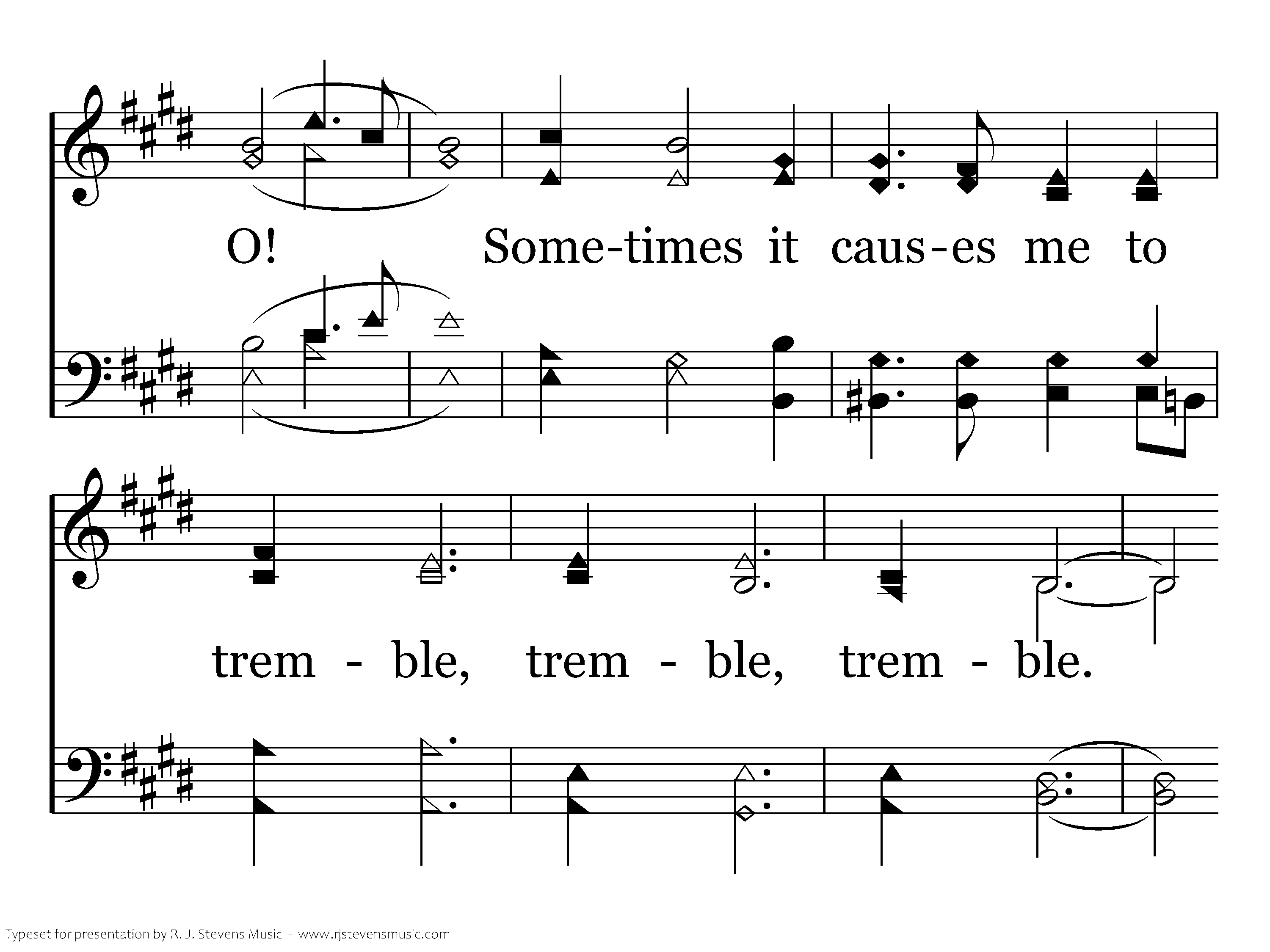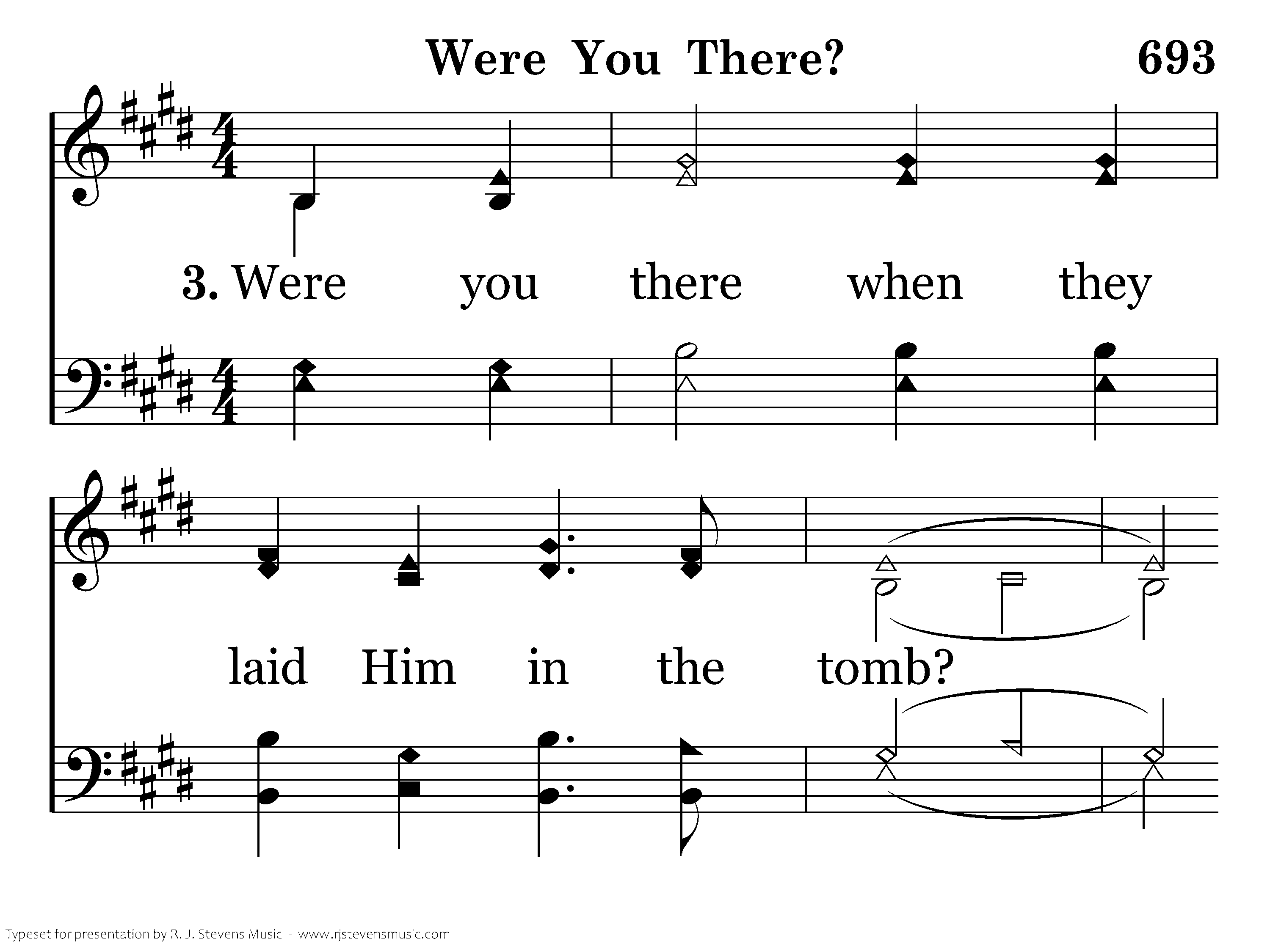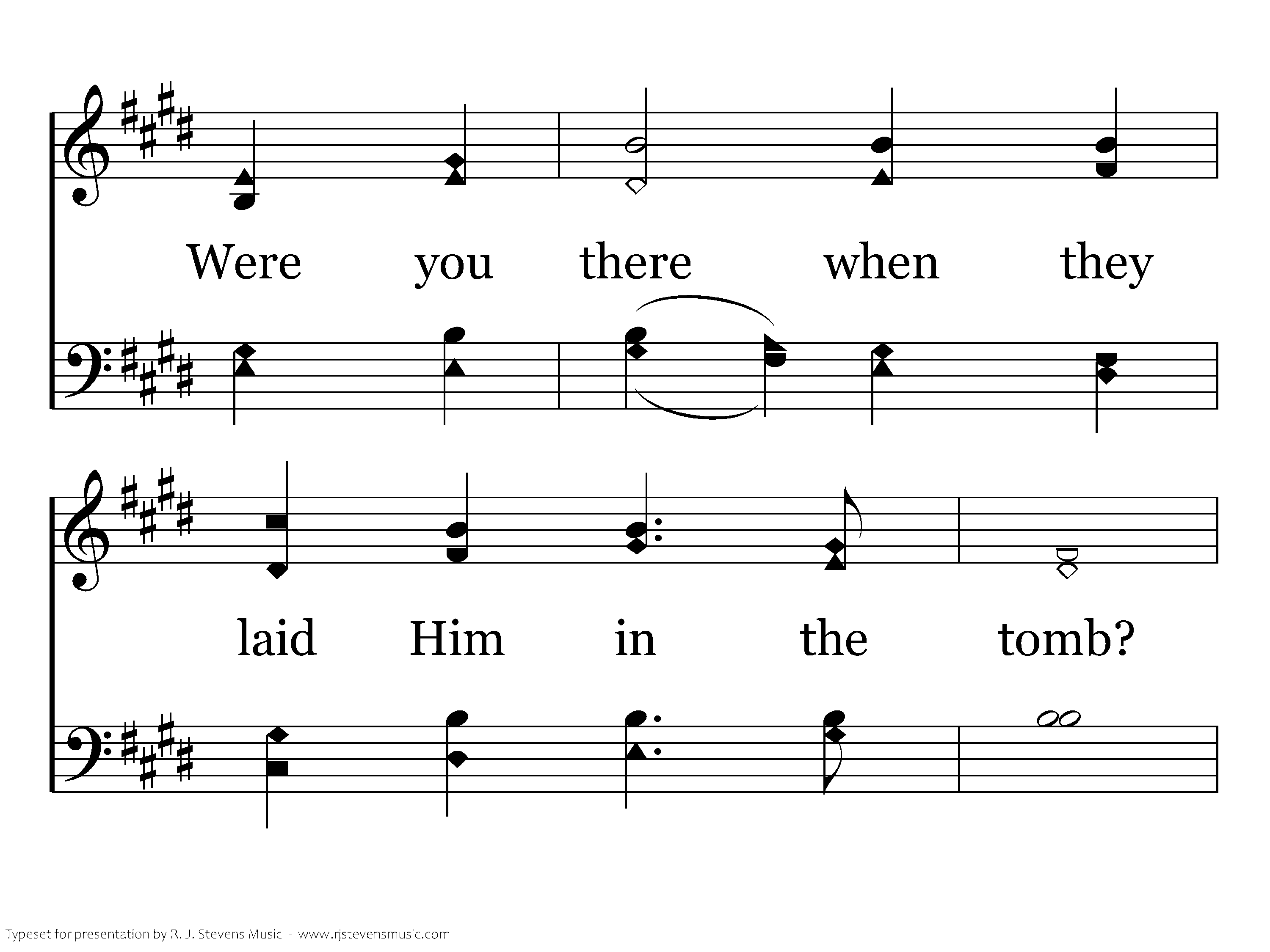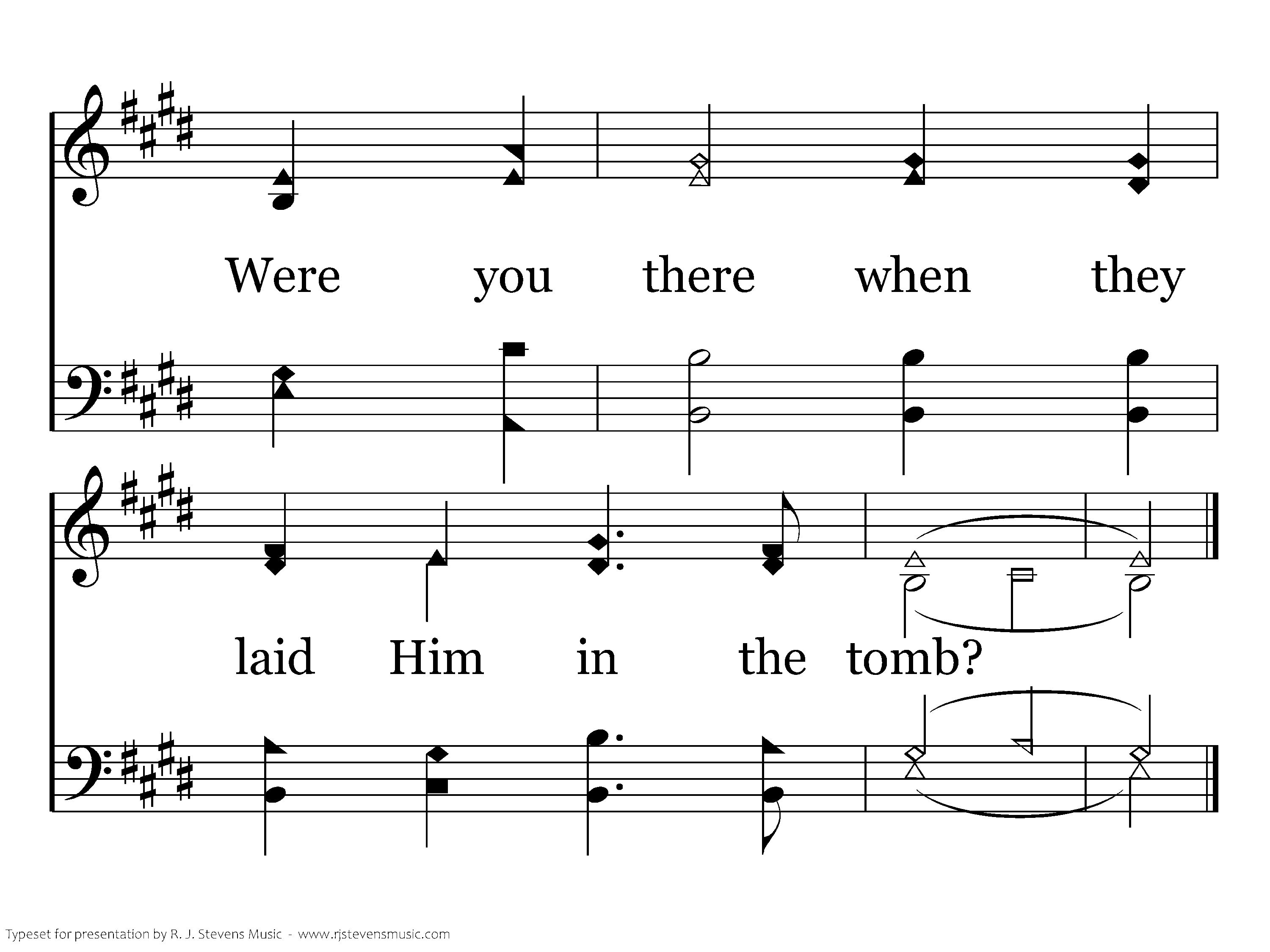 Were you there when they laid Him in the tomb? Were you there when they laid Him in the tomb? O! Sometimes it causes me to tremble, tremble, tremble. Were you there when they laid Him in the tomb?