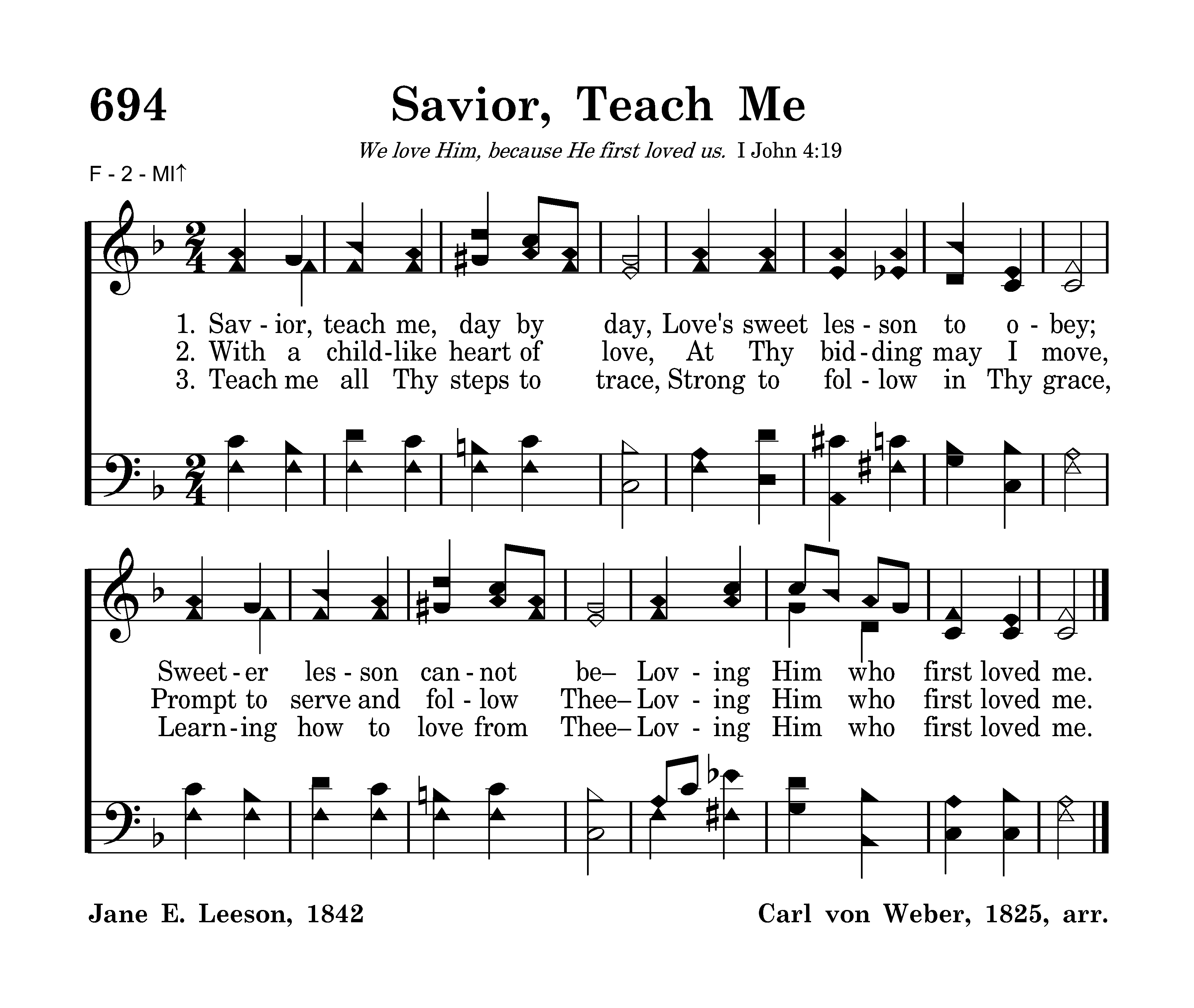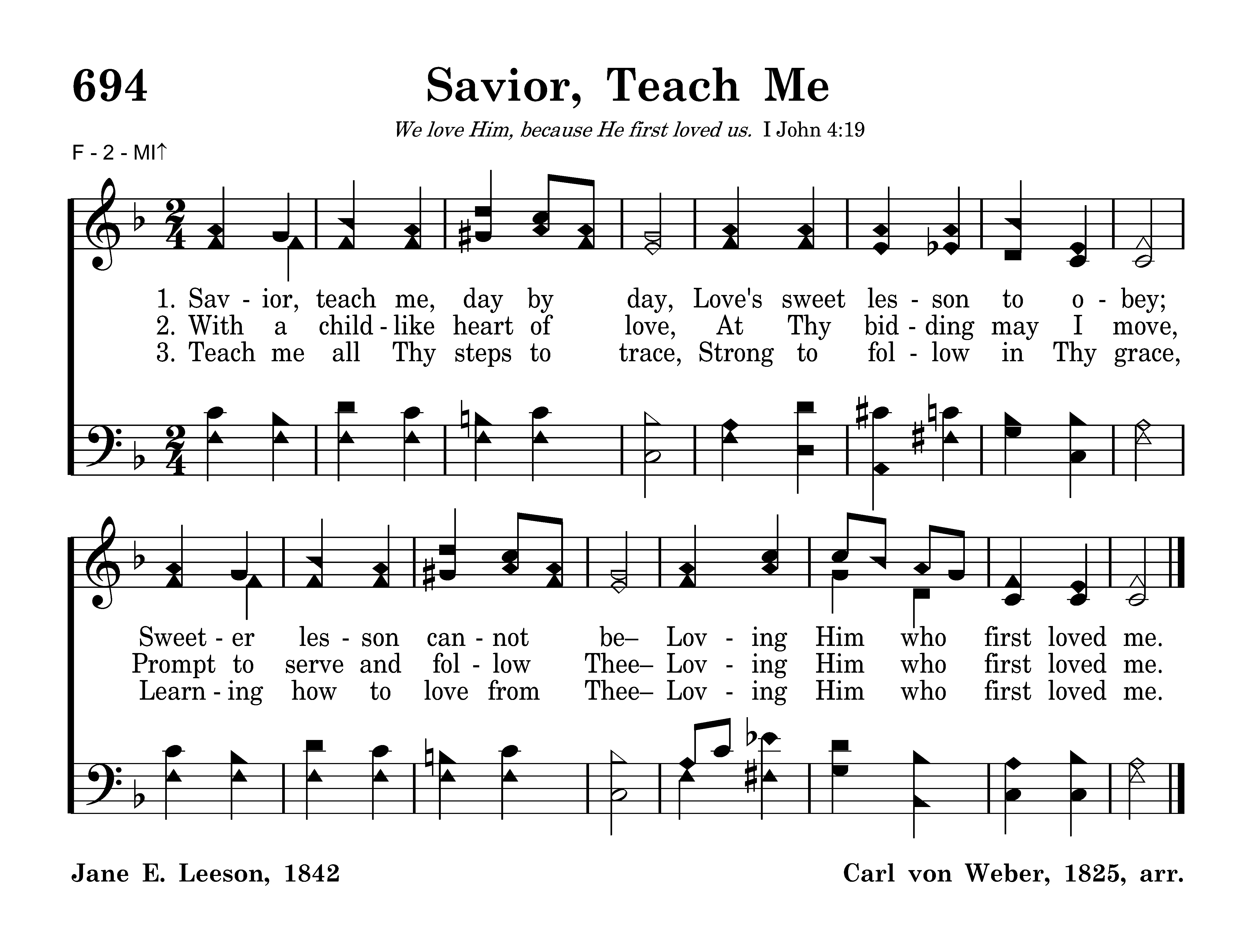 Savior, teach me, day by day, Love's sweet lesson to obey; Sweeter lesson cannot be Loving Him who first loved me.