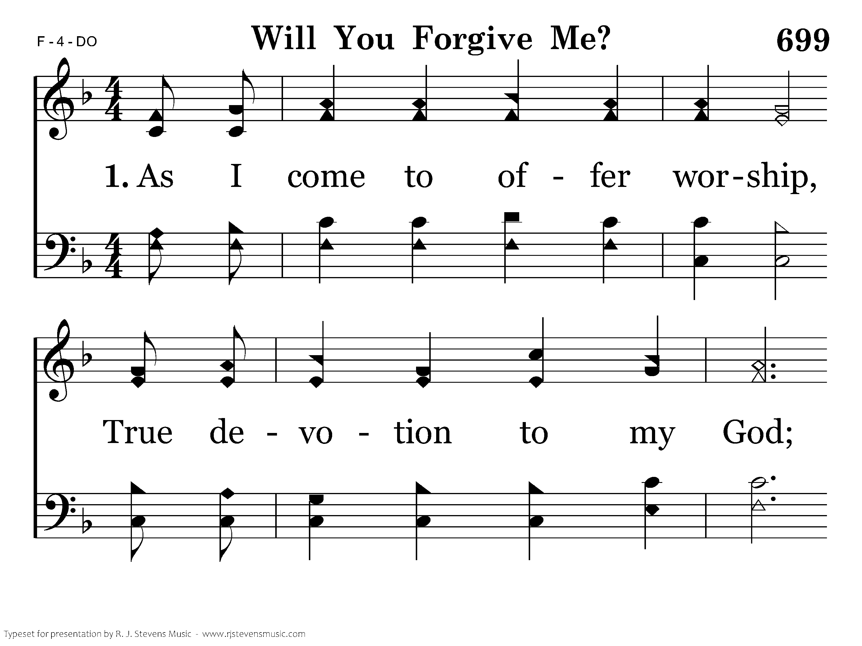 As I come to offer worship, True devotion to my God; Brother, will you now forgive me, Aught against me in your heart?