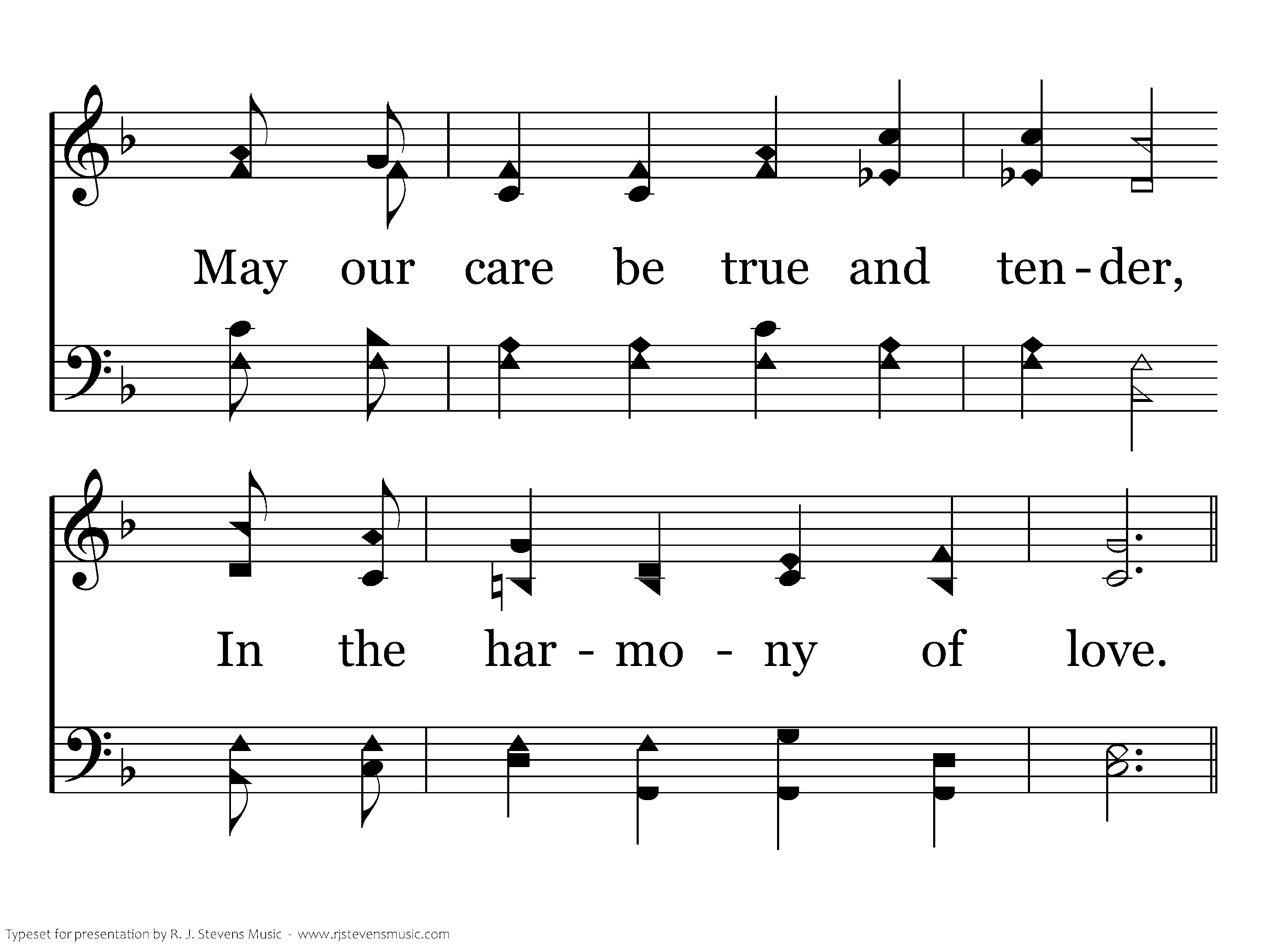 We are sharing now together, Precious kinship in our Lord. May our care be true and tender, In the harmony of love.
