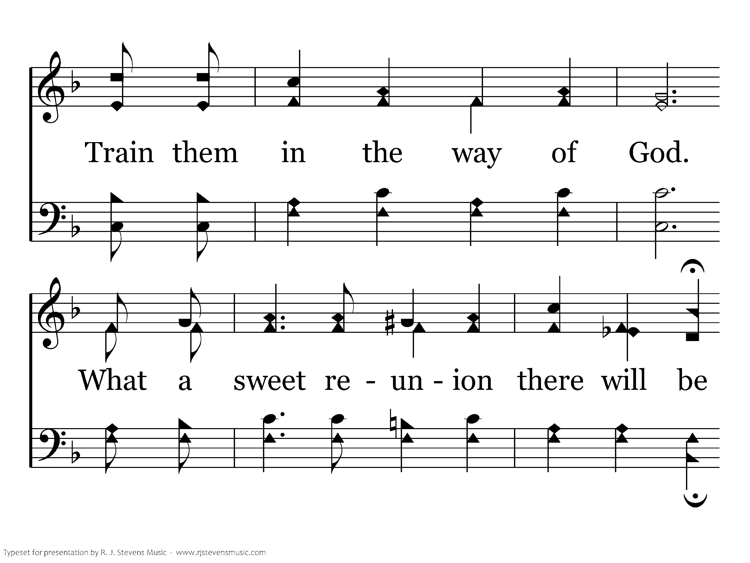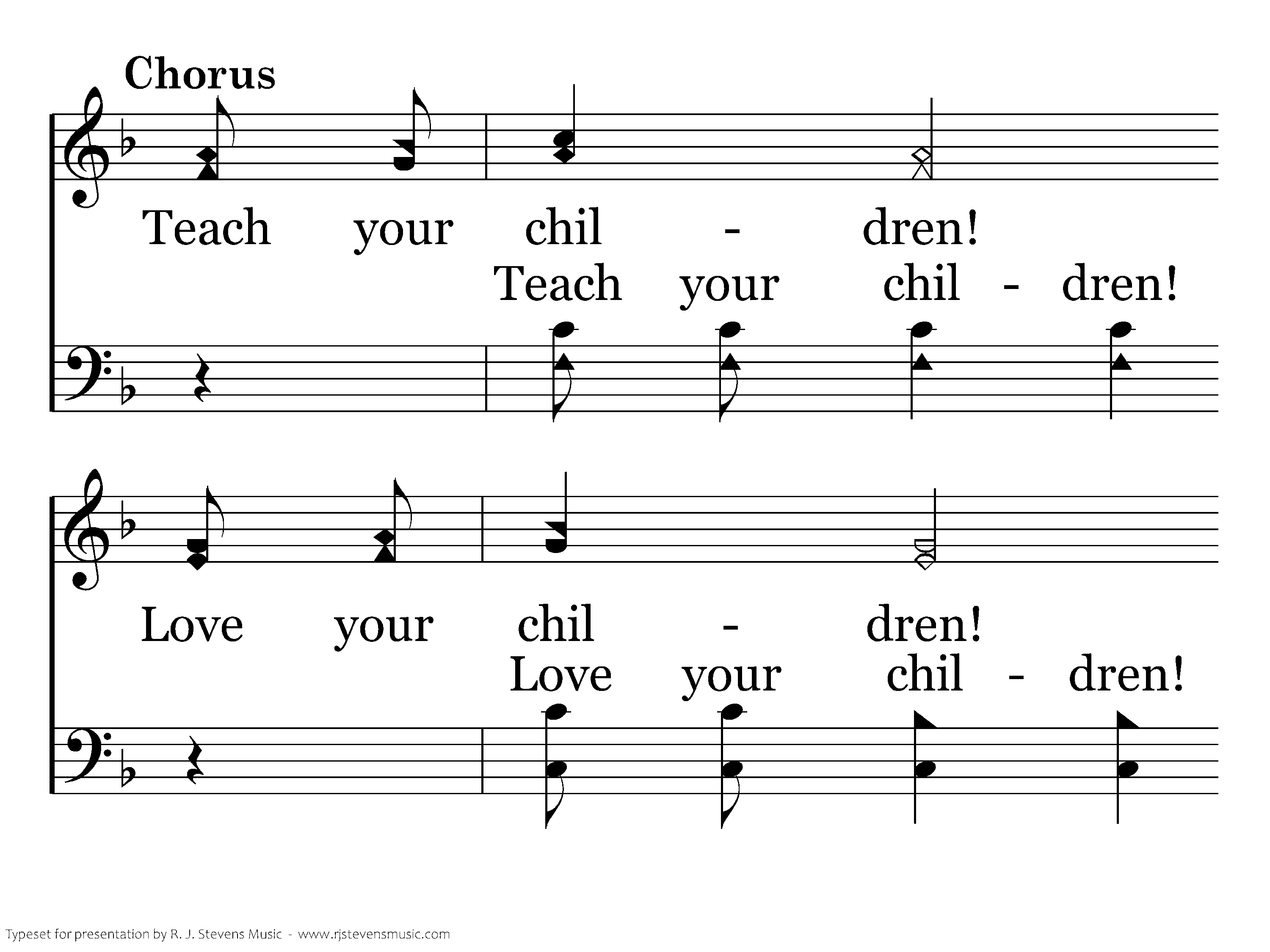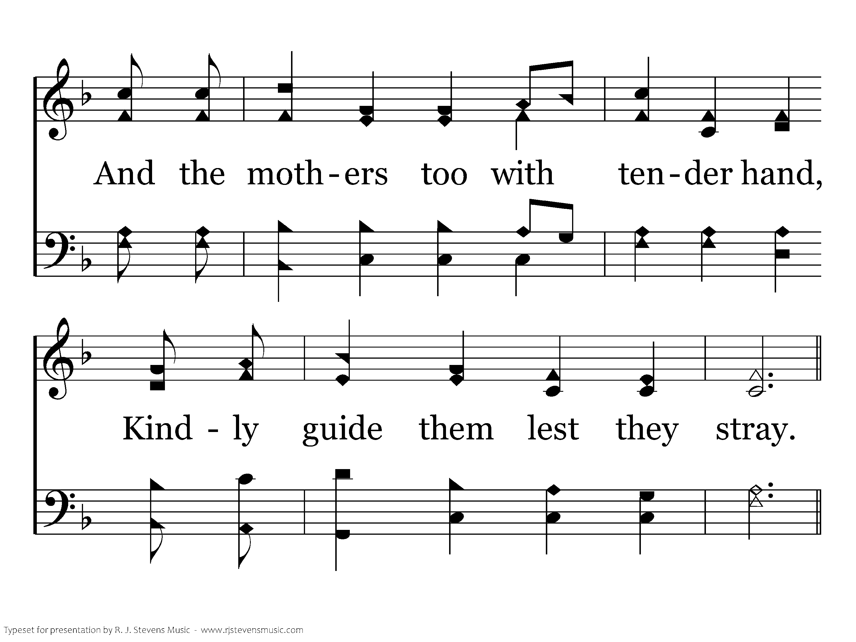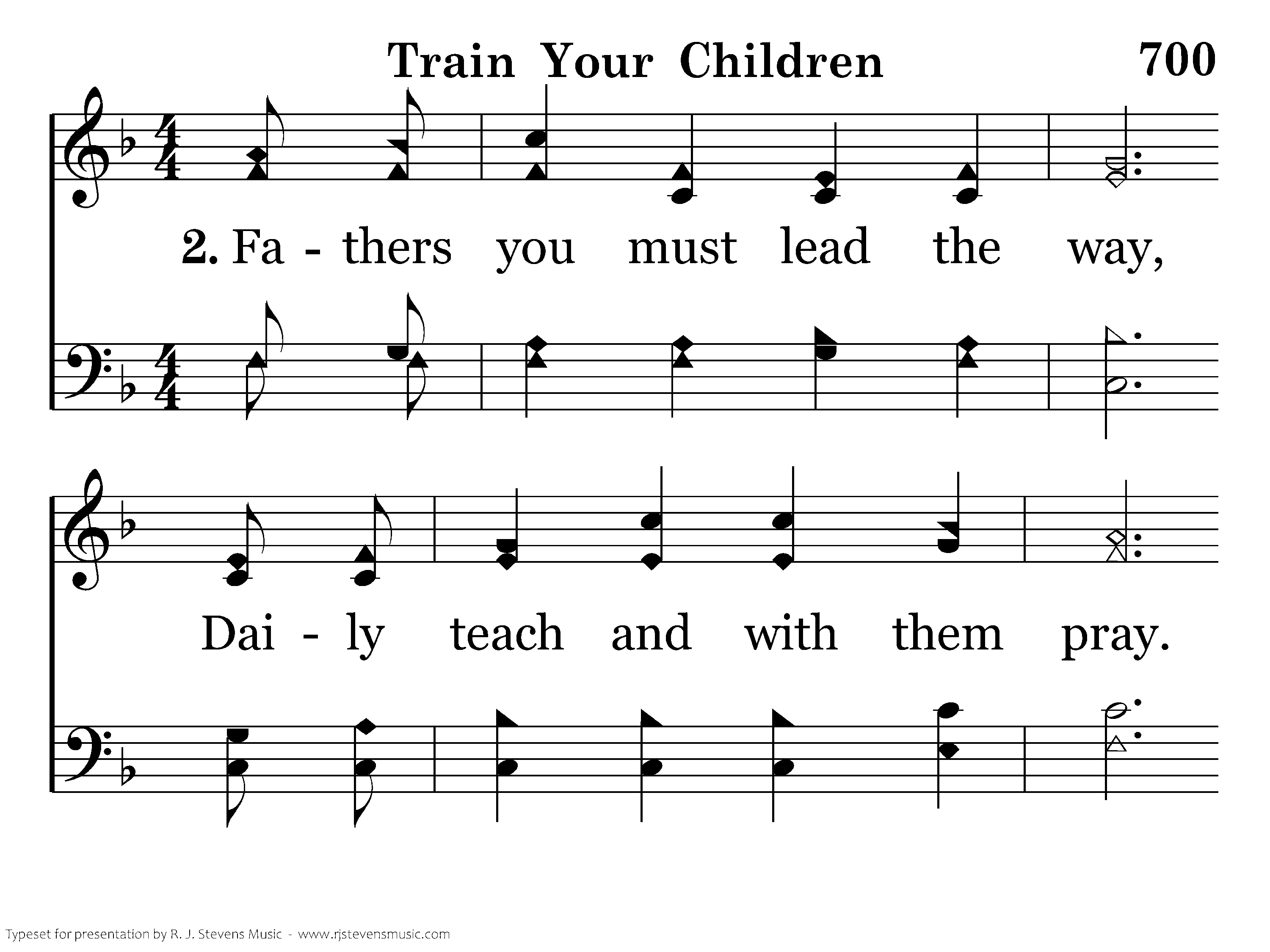Fathers you must lead the way, Daily teach and with them pray. And the mothers too, with tender hand, Kindly guide them lest they stray.