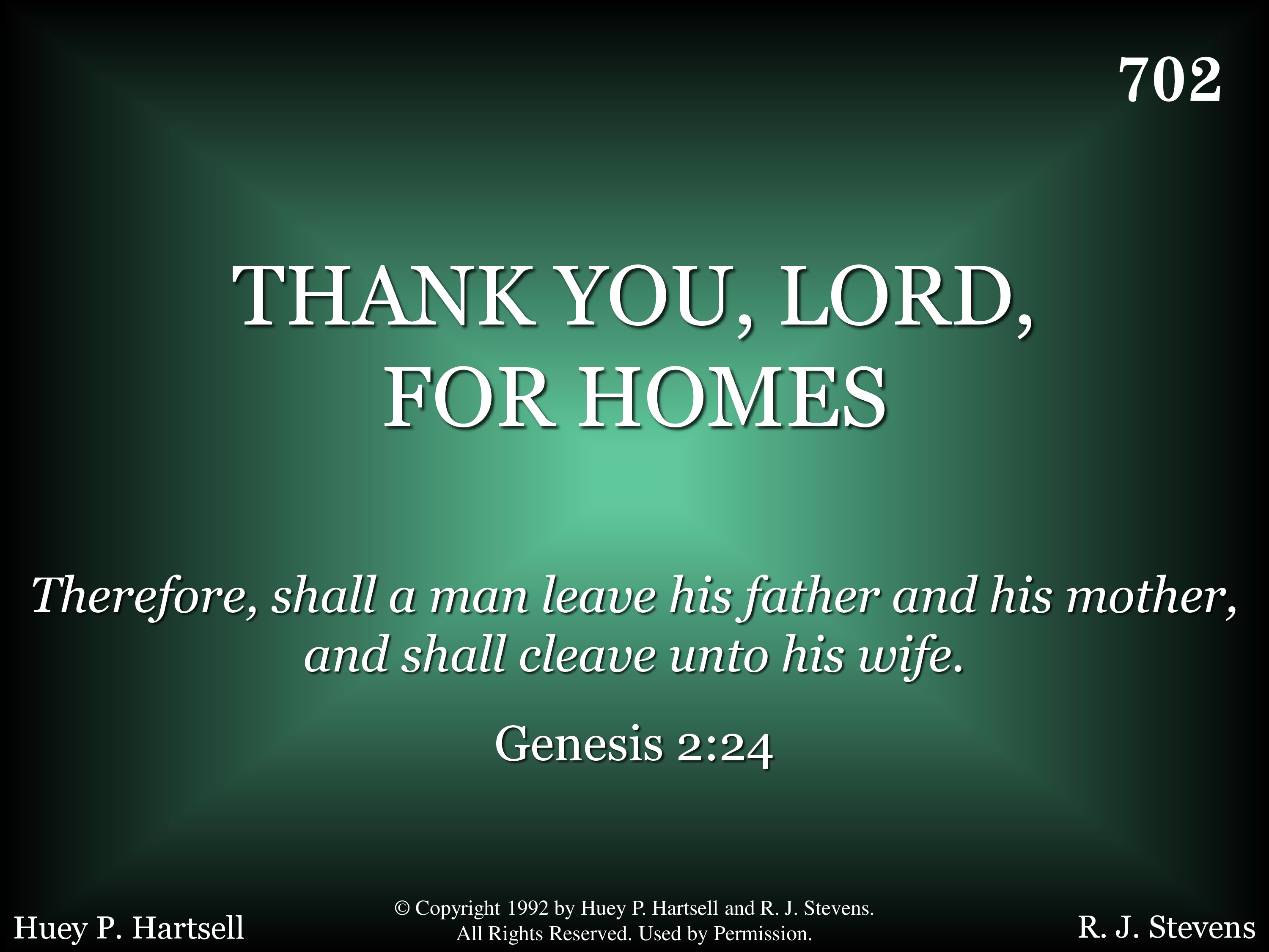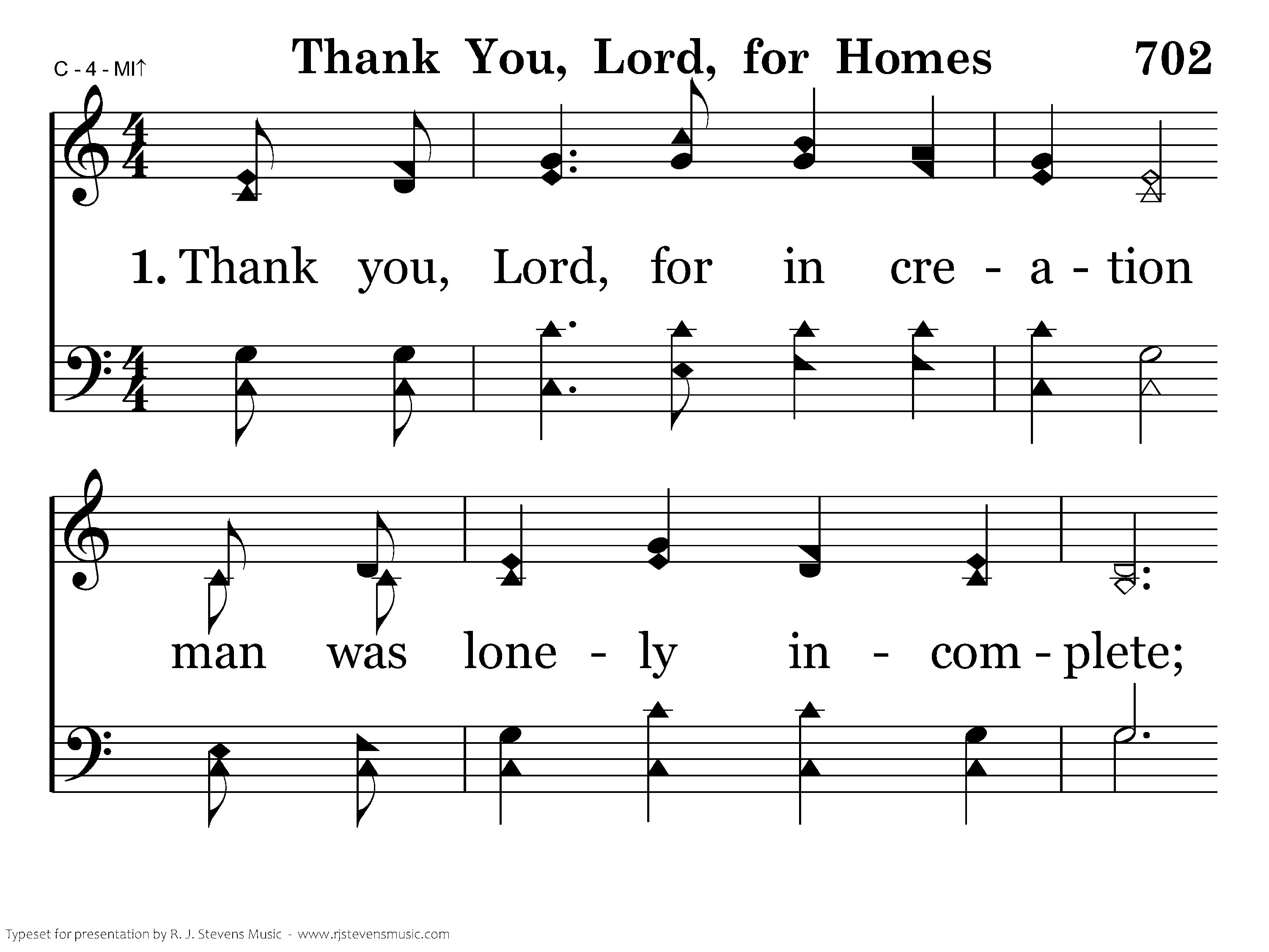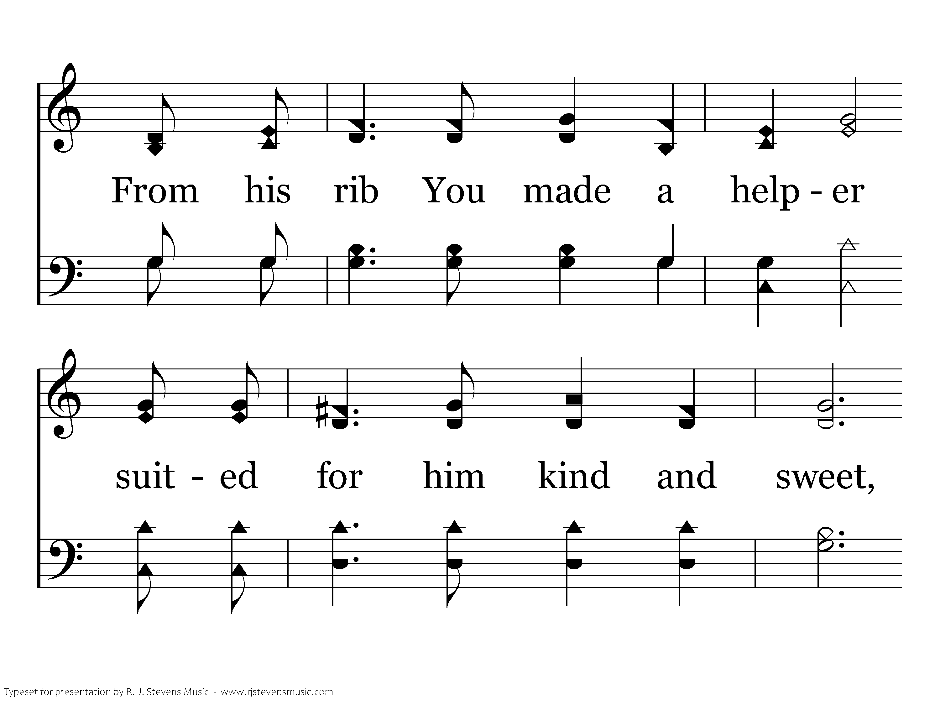 Thank you, Lord, for in creation man was lonely incomplete; From his rib You made a helper suited for him, kind and sweet; "Leave your father and your mother, go and cleave unto your wife." What a beautiful relation; two becoming one for life.