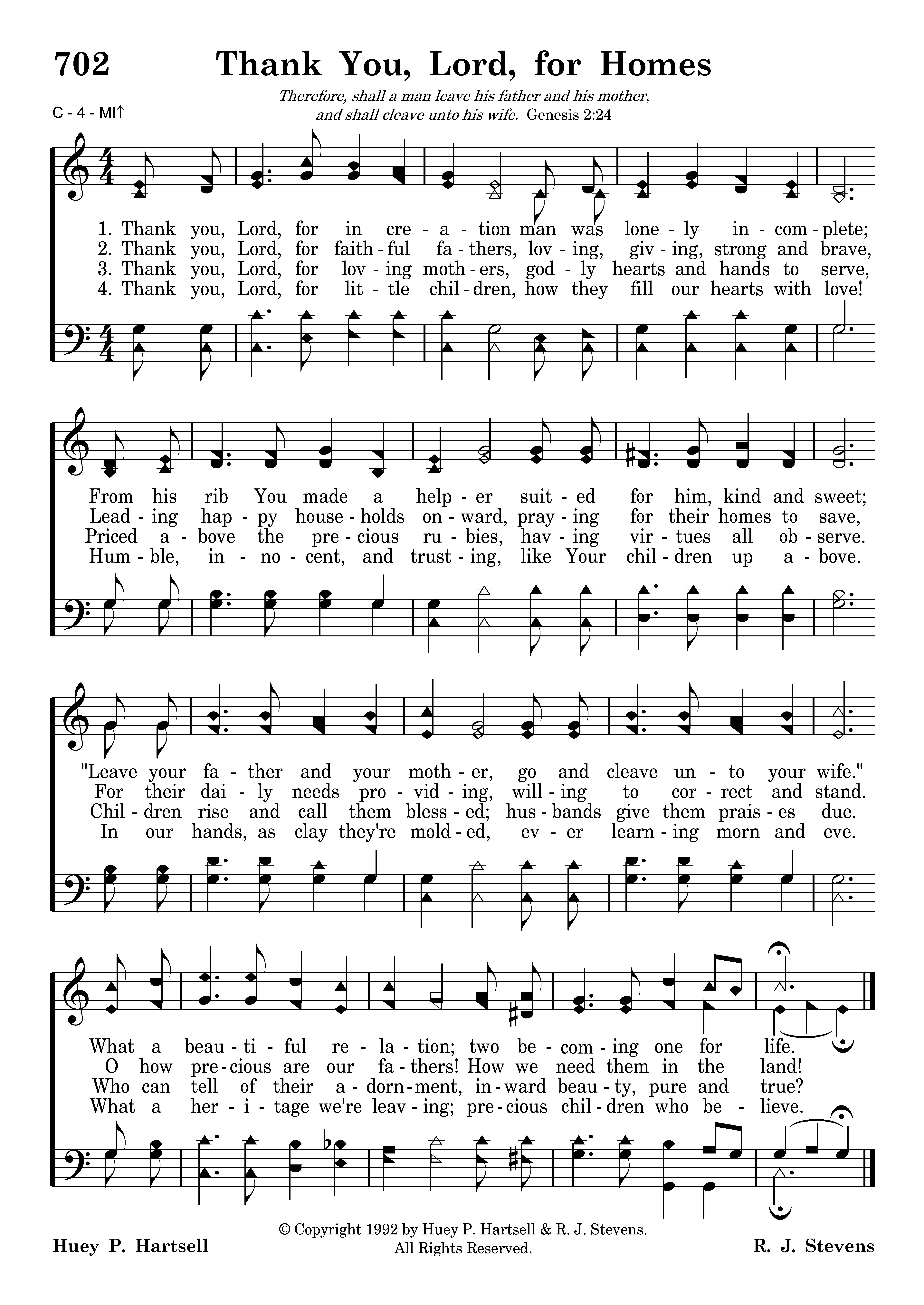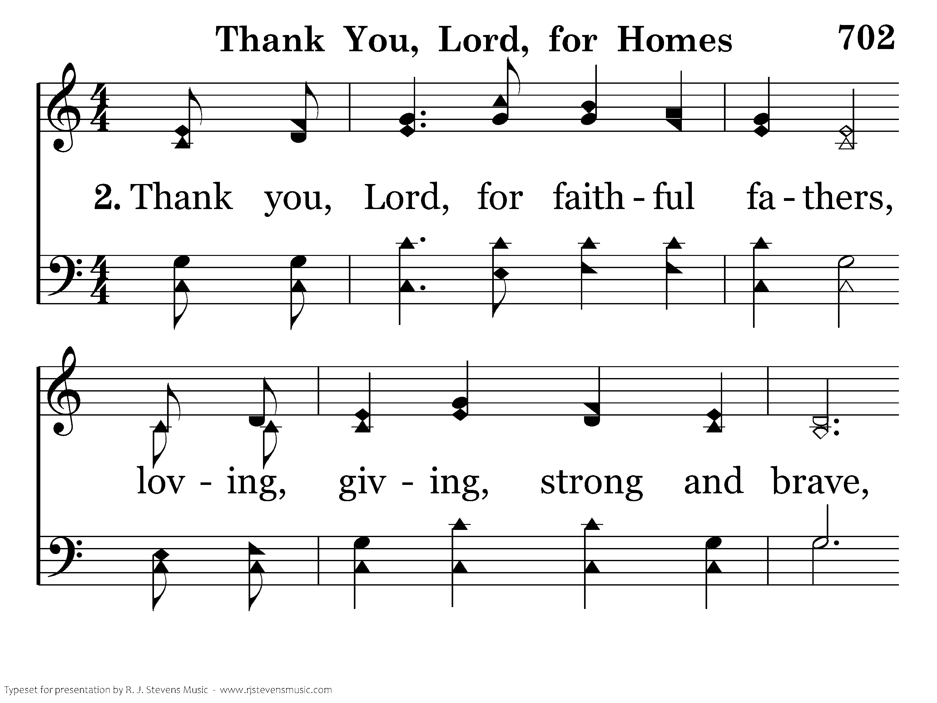 Thank you, Lord, for faithful fathers, loving, giving, strong and brave, Leading happy households onward, praying for their homes to save, For their daily needs providing, willing to correct and stand. O how precious are our fathers! How we need them in the land!