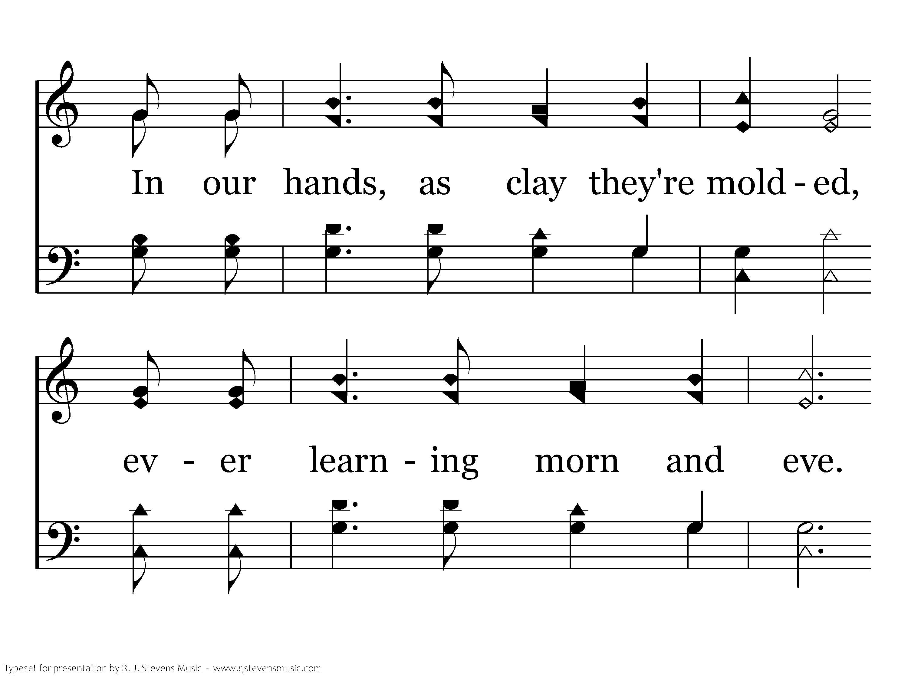 Thank you, Lord, for little children, how they fill our hearts with love! Humble, innocent, and trusting, like Your children up above. In our hands, as clay they're molded, ever learning morn and eve. What a heritage we're leaving; precious children who believe.