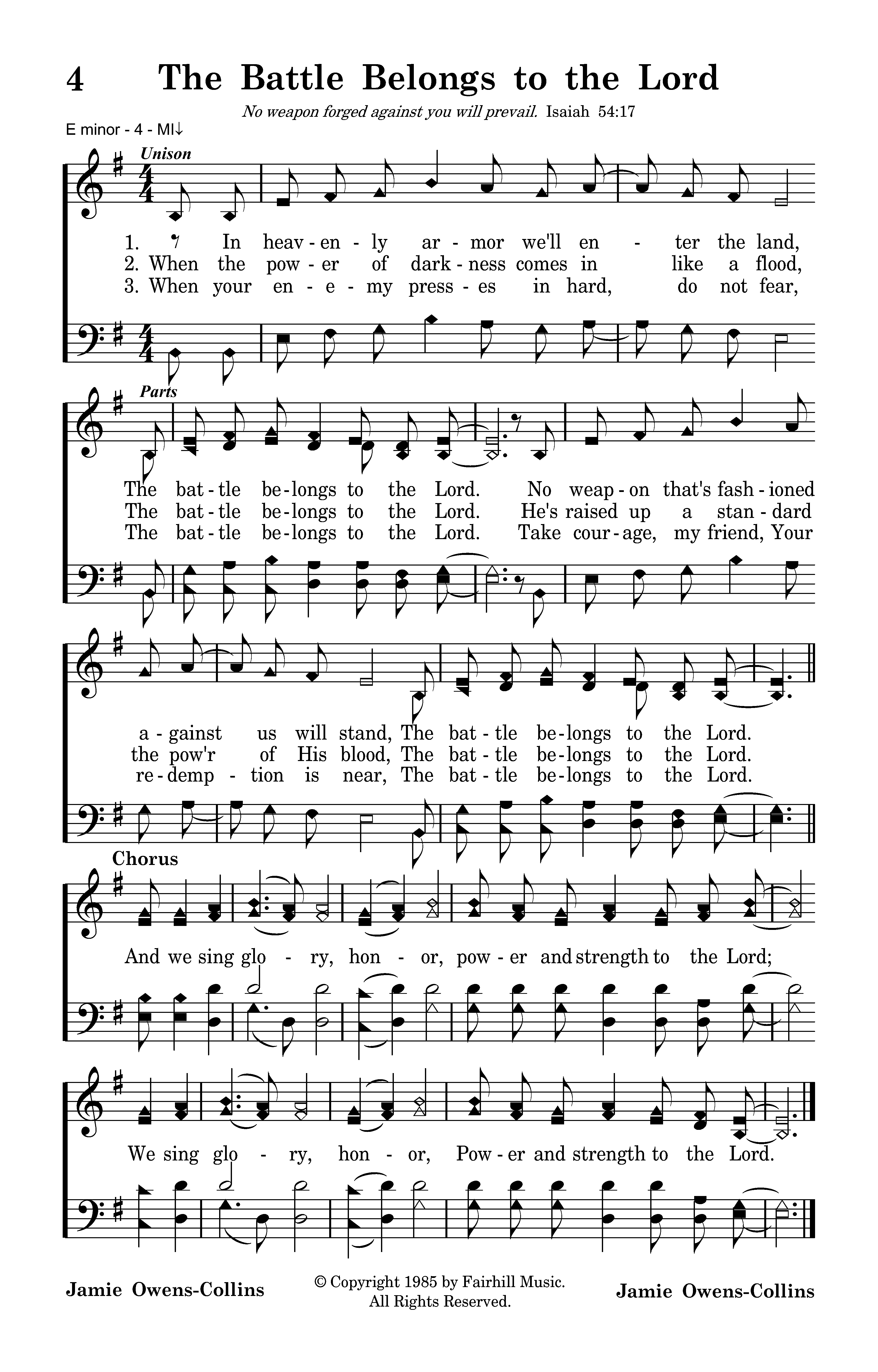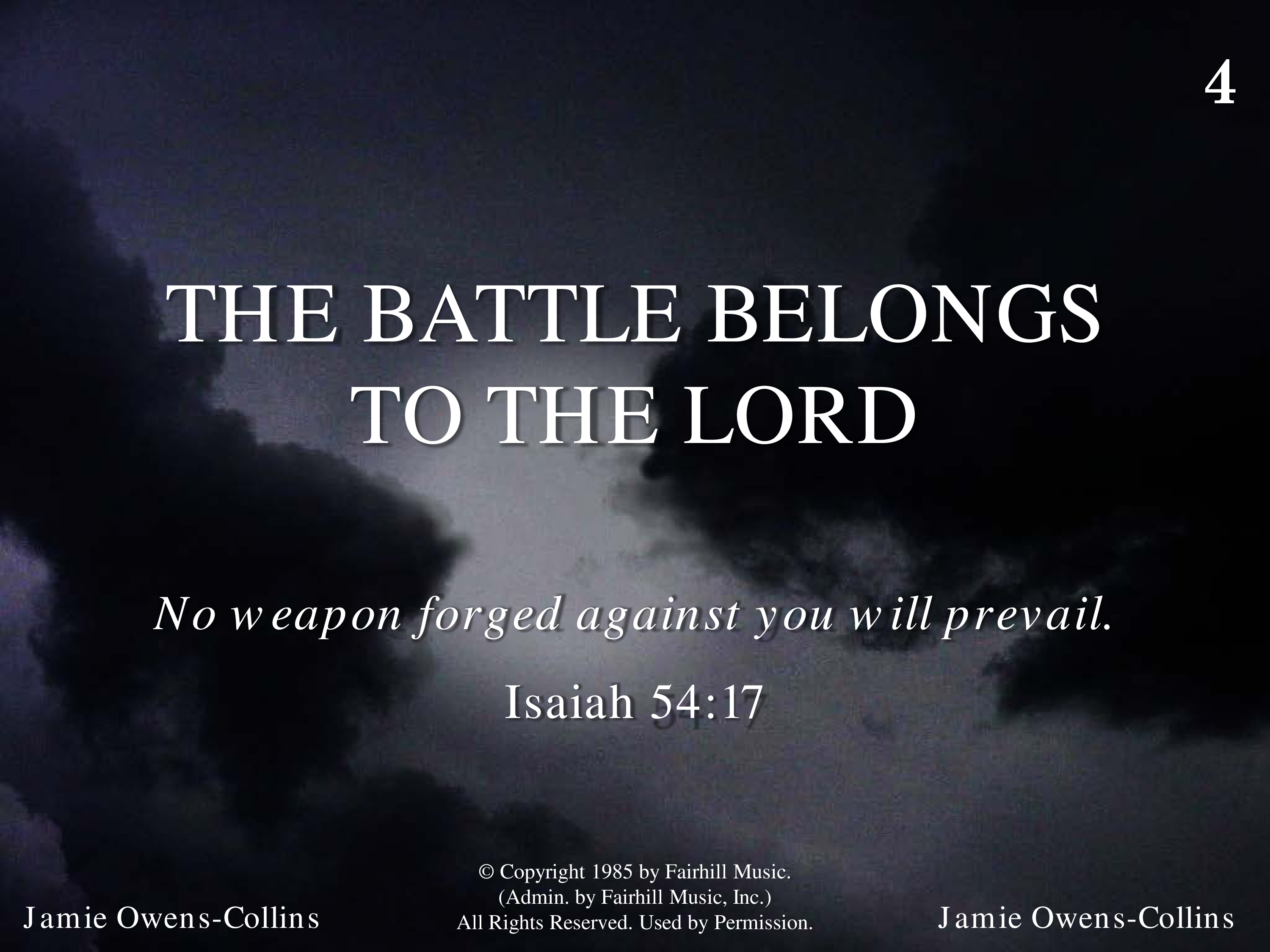In heavenly armor we'll enter the land, The battle belongs to the Lord. No weapon that's fashioned against us will stand, The battle belongs to the Lord.