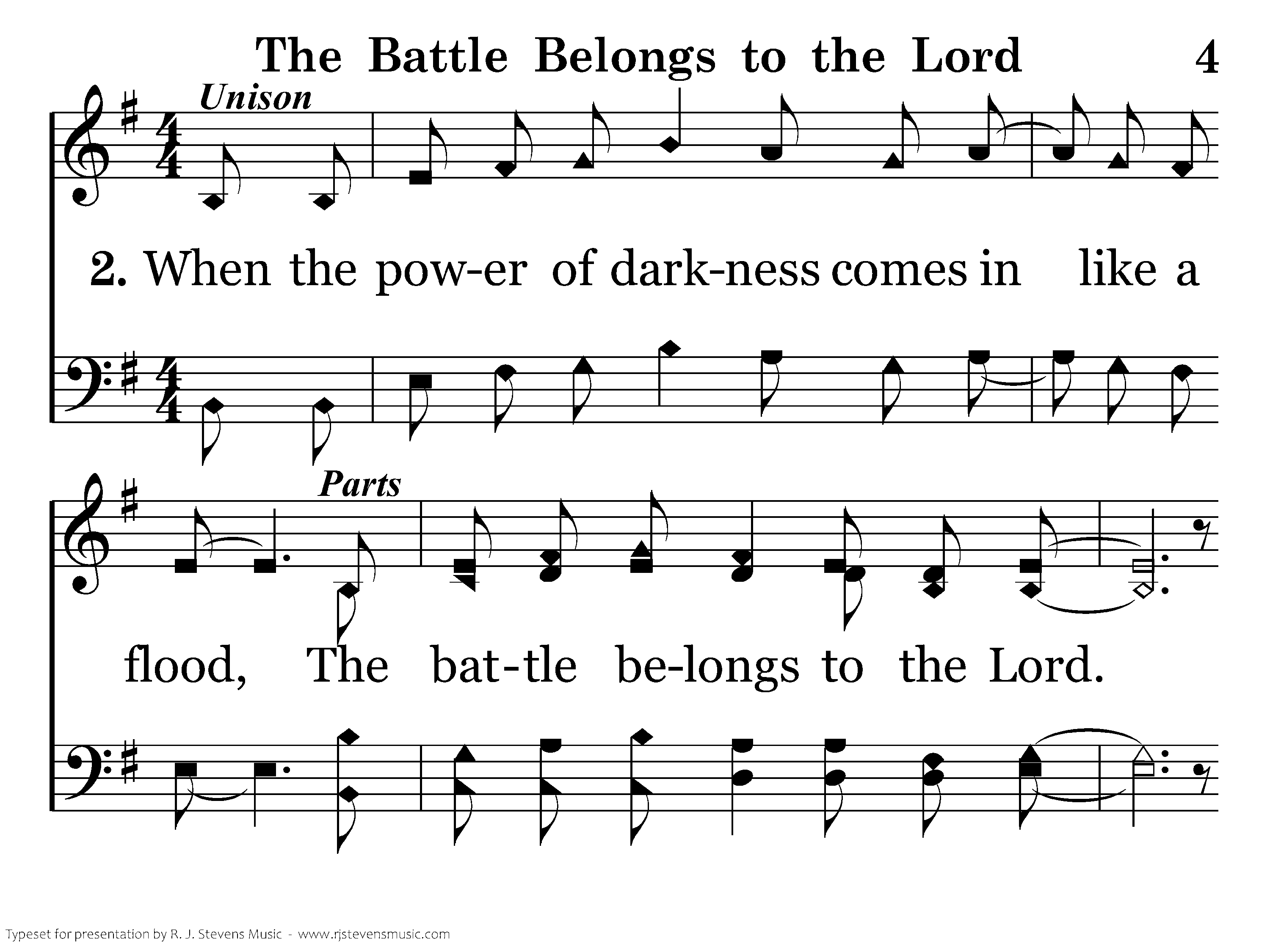 When the power of darkness comes in like a flood, The battle belongs to the Lord. He's raised up a standard the pow'r of his blood, The battle belongs to the Lord.