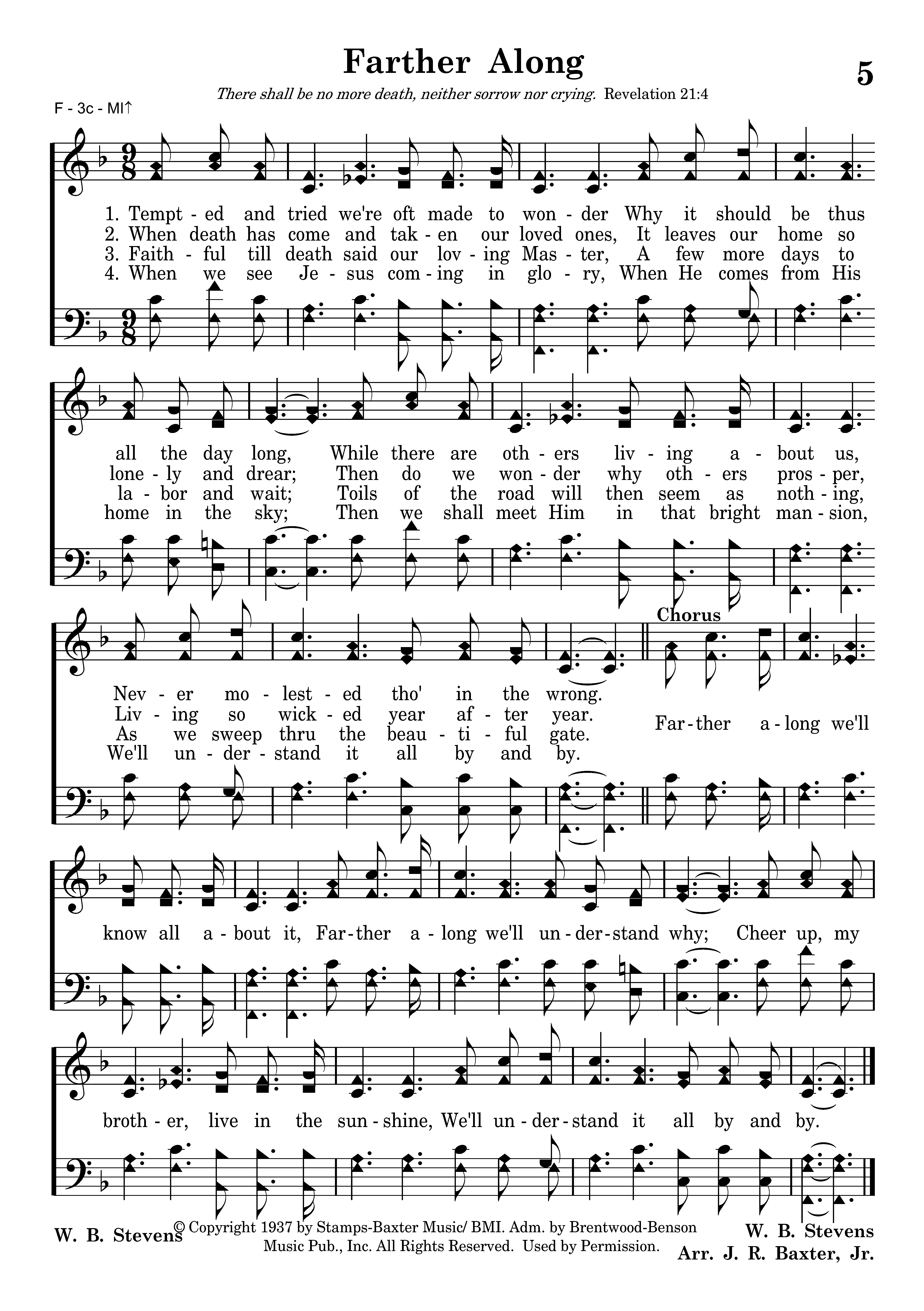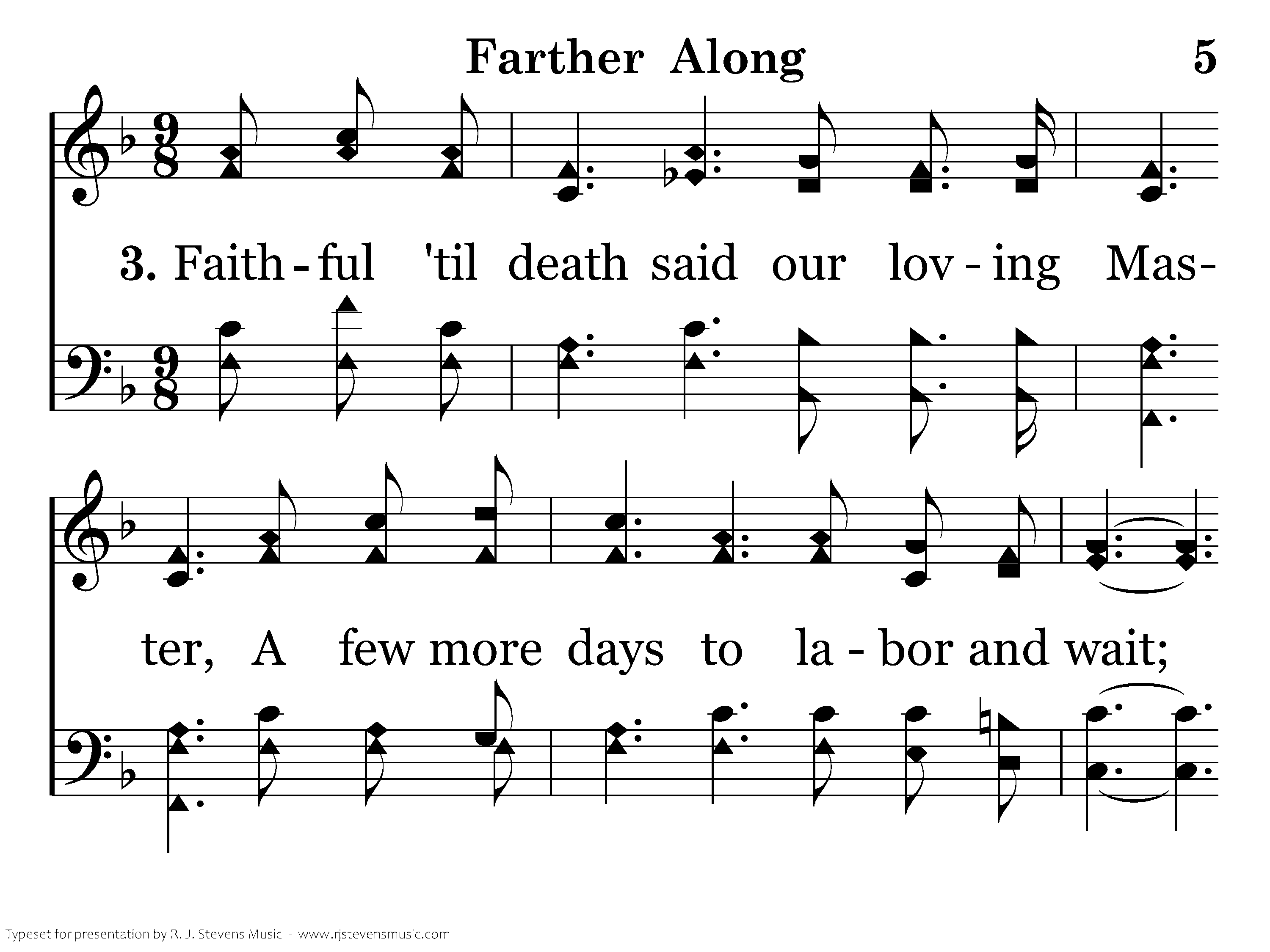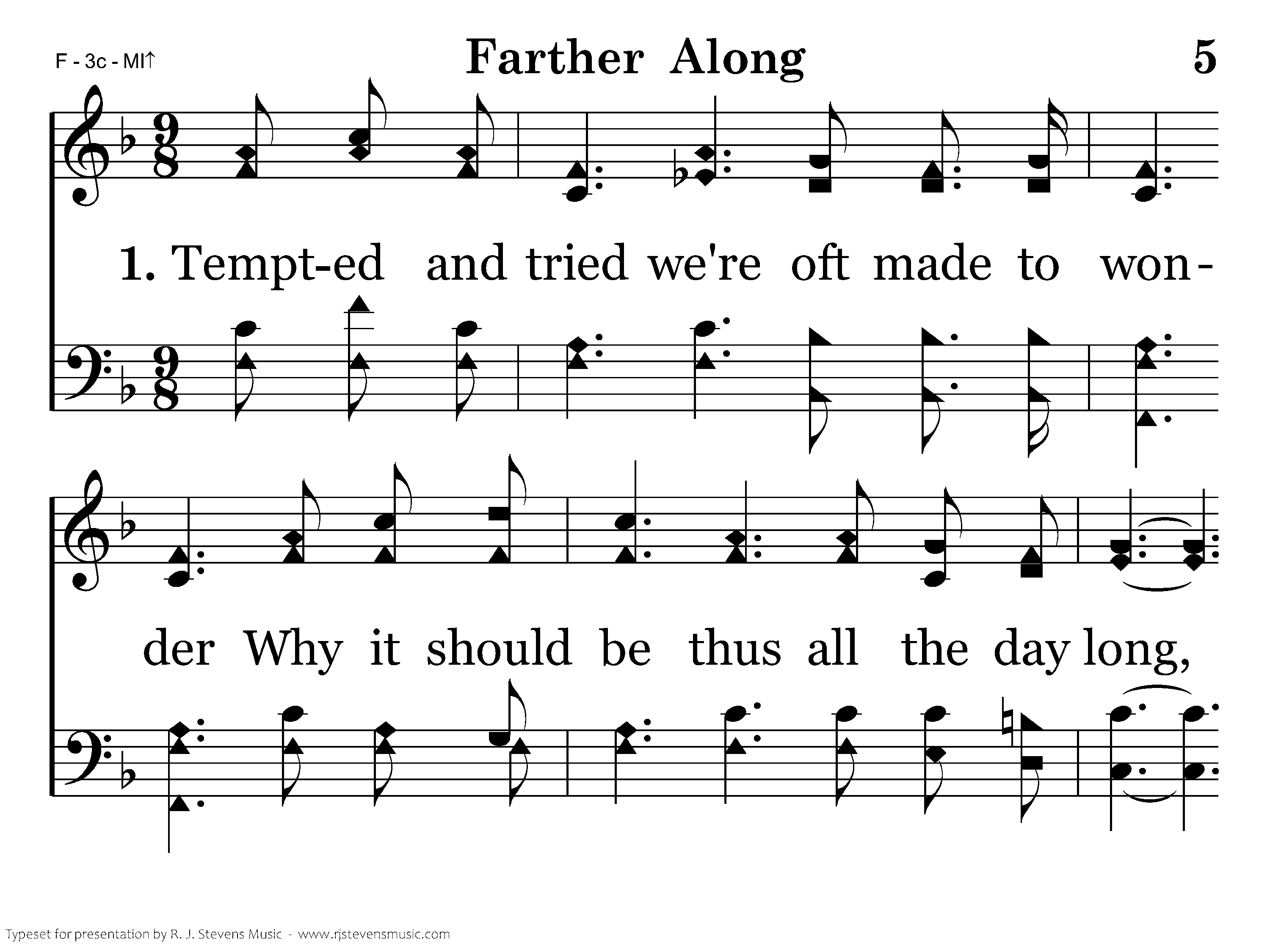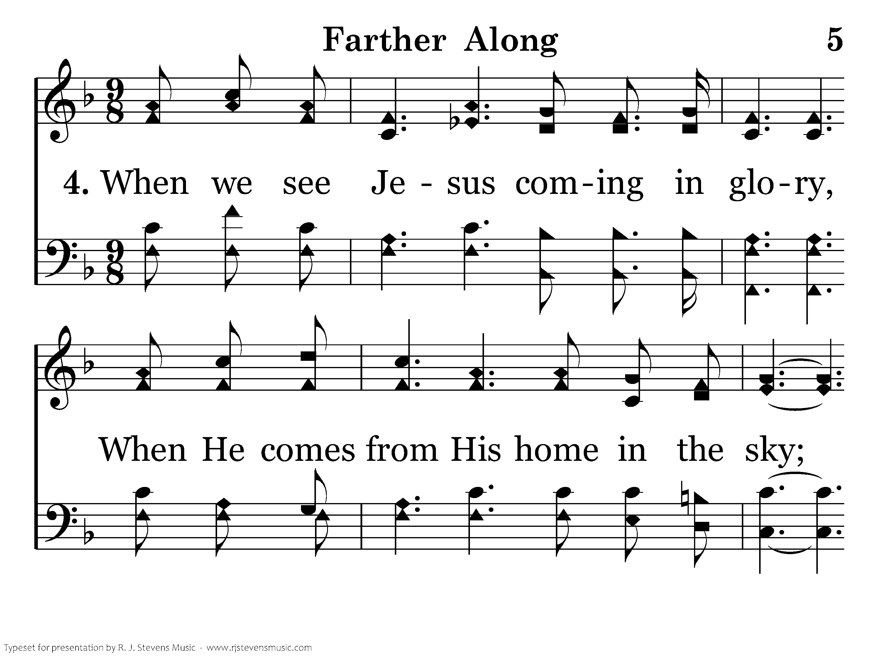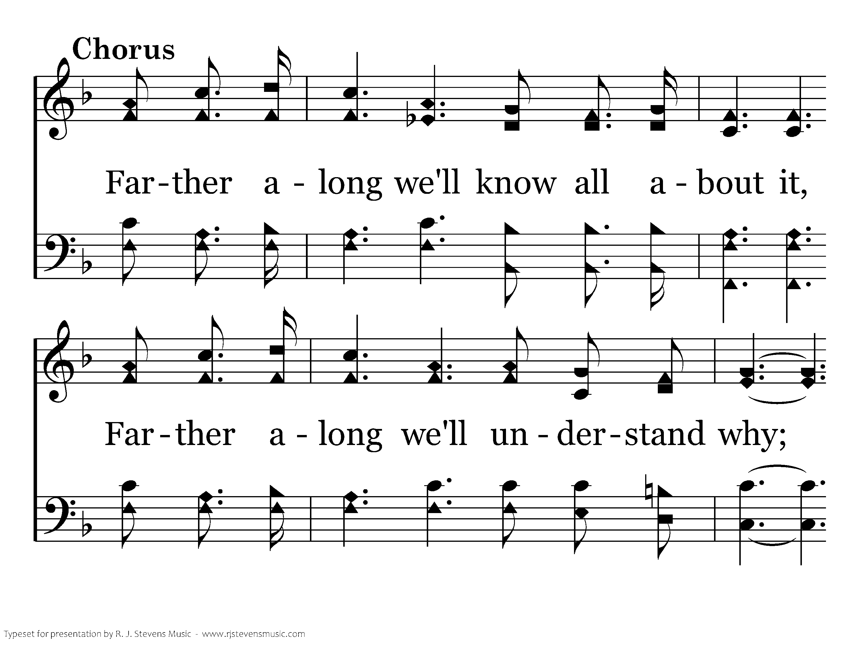 Farther along we'll know all about it, Farther along we'll understand why; Cheer up, my brother, live in the sunshine, We'll understand it all by and by.
