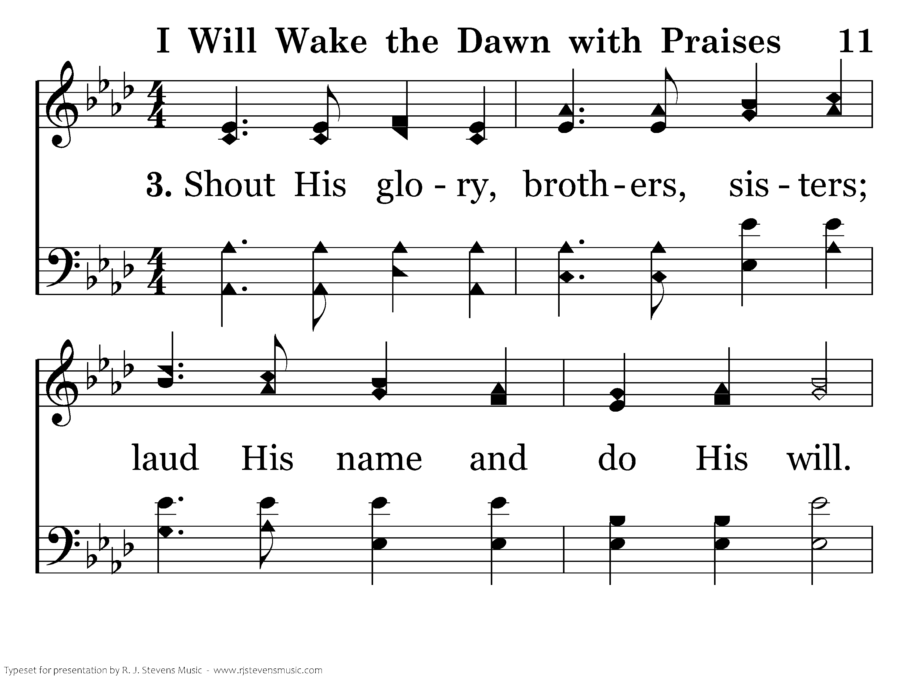 Shout his glory, brothers, sisters; laud his name and do his will. Like the sands upon the shoreline are the praises due Him still.